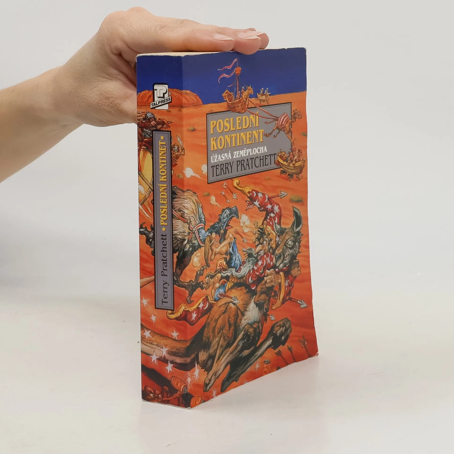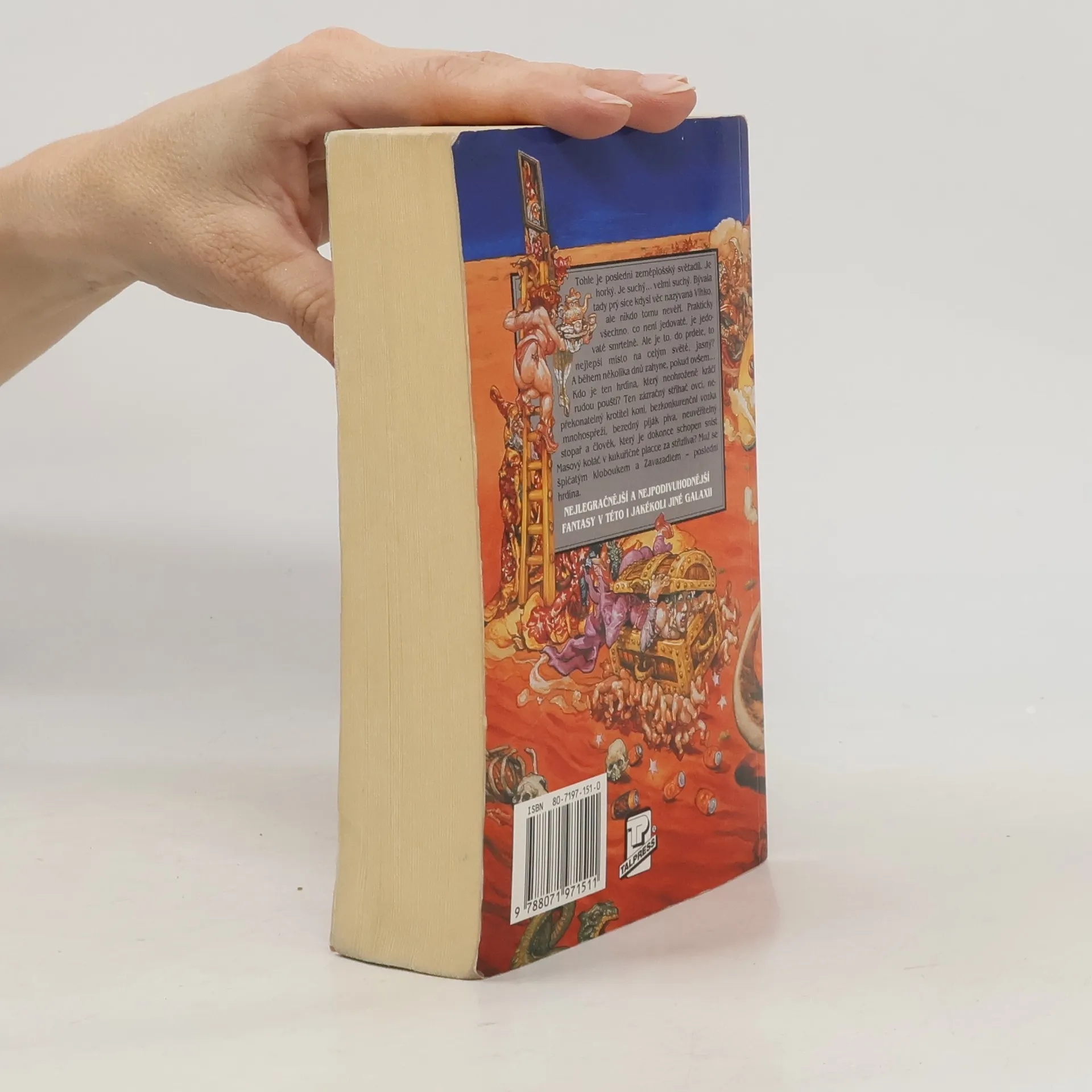 Tohle je poslední zeměplošský světadíl. Je horký. Je suchý… velmi suchý. Bývala tady prý sice kdysi věc nazývaná Vlhko, ale nikdo tomu nevěří. Prakticky všechno, co není jedovaté, je jedovaté smrtelně. Ale je to, do prdele, to nejlepší místo na celým světě, jasný? A během několika dnů zahyne, pokud ovšem… Kdo je ten hrdina, který neohroženě kráčí rudou pouští? Ten zázračný střihač ovcí, nepřekonatelný krotitel koní, bezkonkurenční vozka mnohospřeží, bezedný piják piva, neuvěřitelný stopař a člověk, který je dokonce schopen sníst Masový koláč v kukuřičné placce za střízliva? Muž se špičatým kloboukem a Zavazadlem – poslední hrdina. Úžasná Zeměplocha, kniha 22., přeložil Jan Kantůrek.
