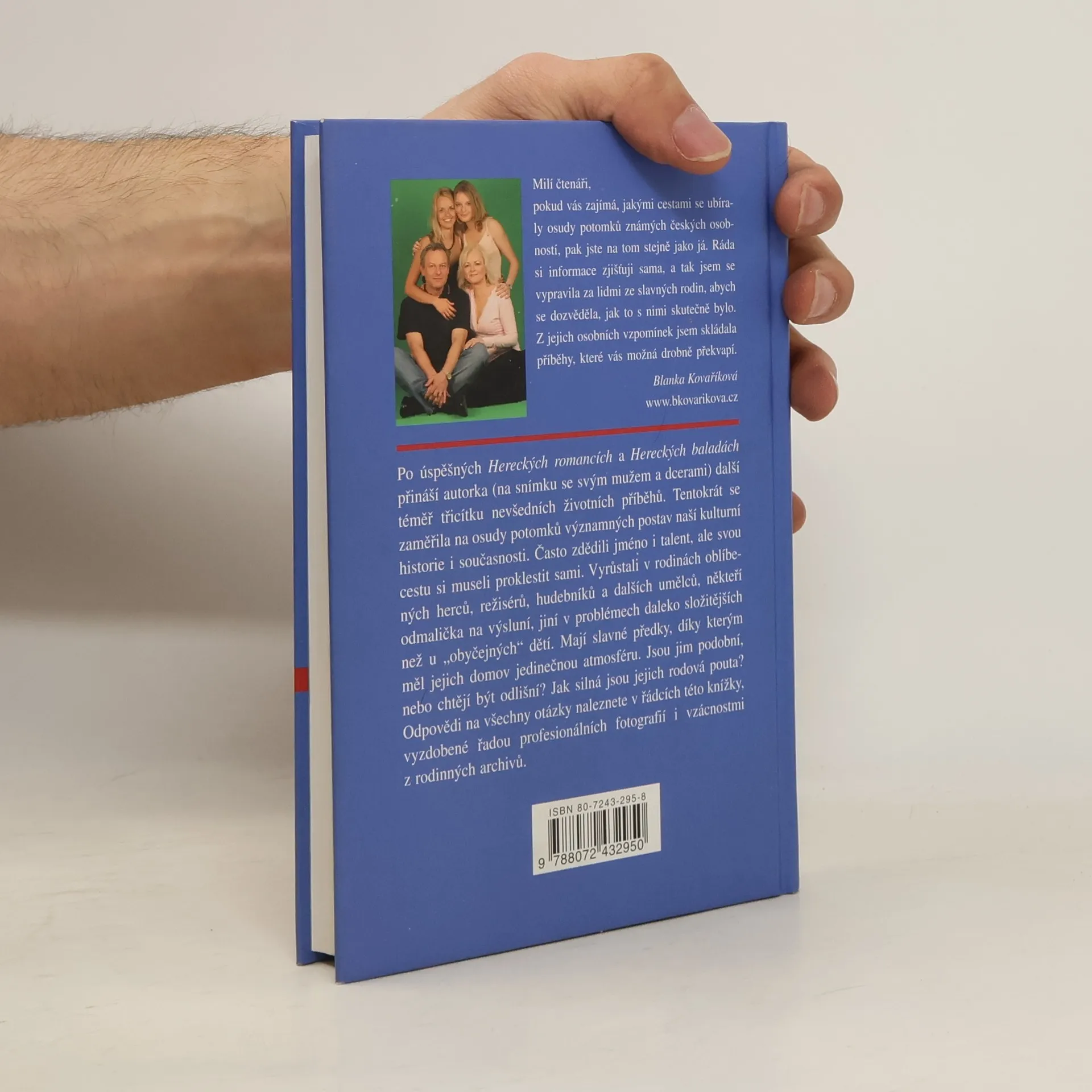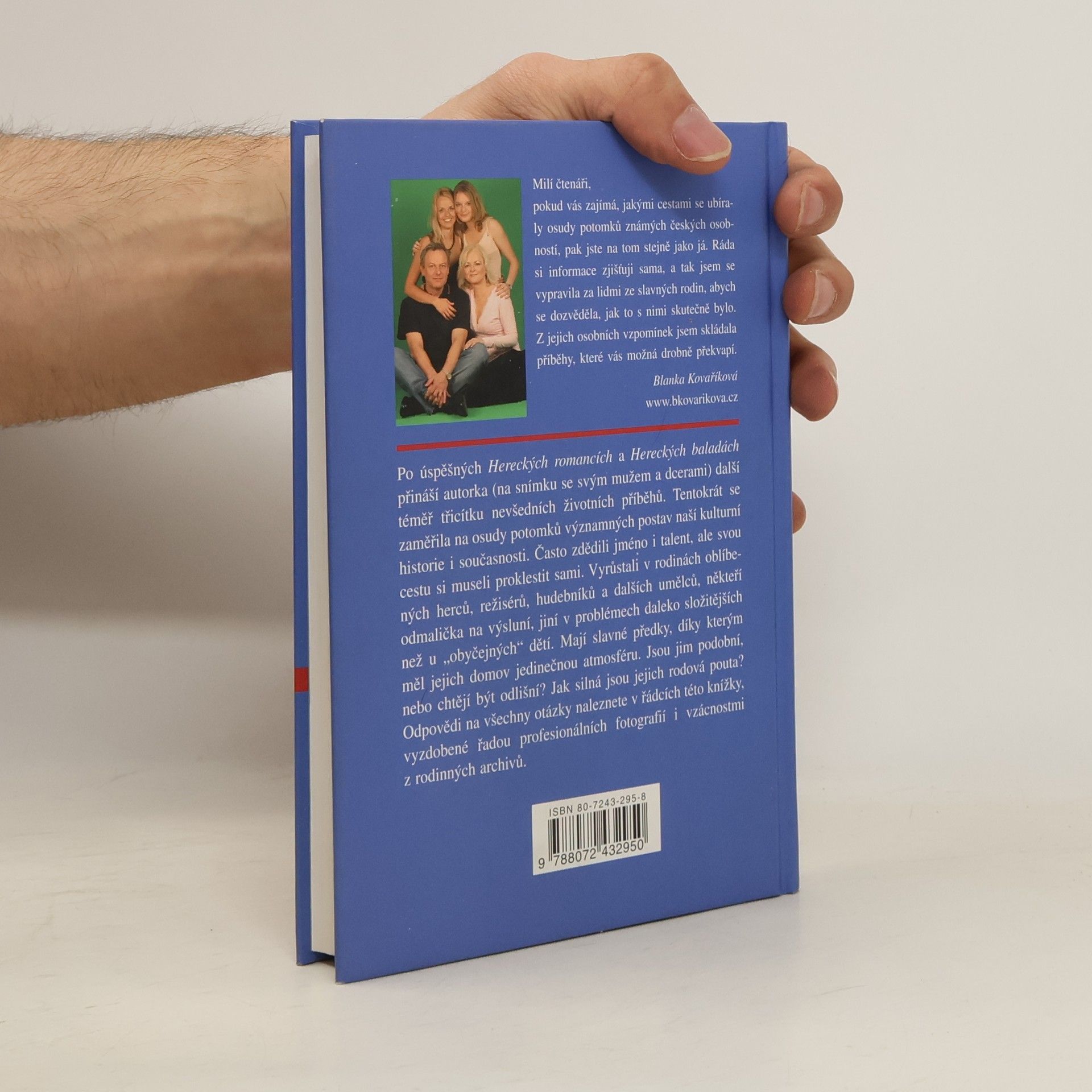 Jablko (ne)padá daleko od stromu Nahlédnutí do života potomků pozoruhodných osobností. Redaktorka časopisu Vlasta Blanka Kovaříková se po dvou předchozích knihách, v nichž se vrátila k hereckým legendám, zaměřila na potomky slavných. Spektrum oslovených je široké - od prapravnučky Boženy Němcové až po syna Gabriely Osvaldové a Ondřeje Soukupa. Z rozhovorů, které vedla s osmadvaceti oslovenými se čtenář dozví mnohé o jejich soukromí. Text doprovázejí fotografie z rodinných archivů i ze současnosti.