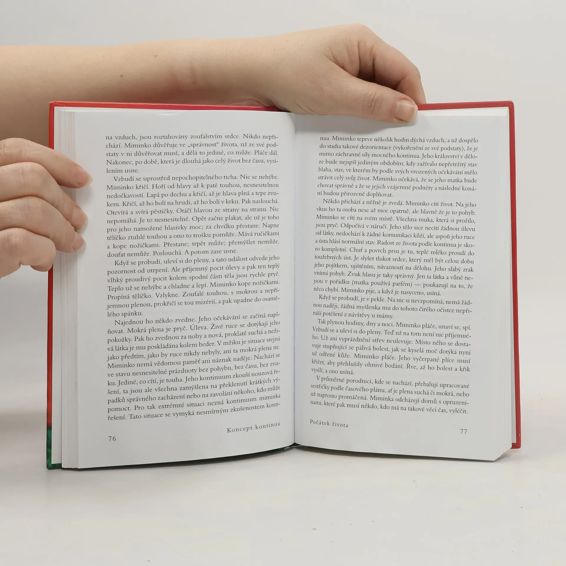 Autorka ve své světově proslulé knize odhaluje, proč jsou lidé žijící na Západě tak nespokojení a často nešťastní. Po několika expedicích mezi jihoamerické indiány rozpoznala, že tyto pocity mohou pramenit z neuspokojených potřeb miminek a malých dětí, které se na Západě snažíme vychovávat podle všemožných teorií, jen ne podle vlastní intuice a evolucí vytvořených jednoduchých pravidel a očekávání. V knize, kterou napsala již v r. 1975, velmi jasně a přesvědčivě vysvětluje, jak je potřeba zacházet s našimi nejmenšími, aby z nich vyrostly spokojené a samostatné děti a posléze dospělí lidé, kteří si nepotřebují „léčit“ své deprivace z dětství všemi možnými způsoby, počínaje drogovou závislostí a konče nezdravými partnerskými vztahy, a jsou schopni vést plnohodnotný život, jenž nebude naplněn věčnou nespokojeností a hledáním „něčeho“, co nalézt nelze. Našemu vlastnímu životu tak dává úplně nový rozměr a pomáhá lidem najít jednoduchou, a přitom málo předvídatelnou odpověď na často kladenou otázku – proč nejsme šťastní.