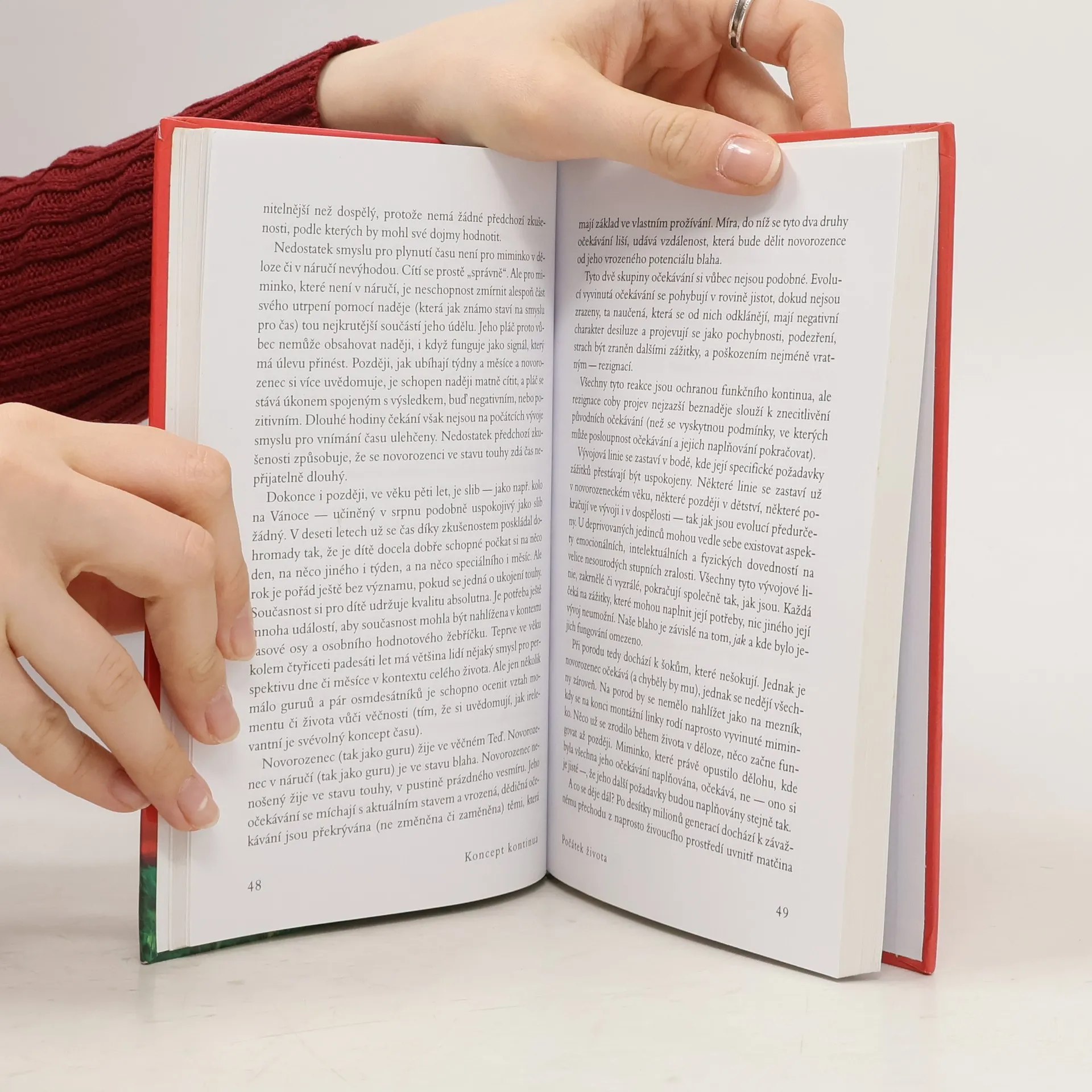 Autorka ve své světově proslulé knize odhaluje, proč jsou lidé žijící na Západě tak nespokojení a často nešťastní. Po několika expedicích mezi jihoamerické indiány rozpoznala, že tyto pocity mohou pramenit z neuspokojených potřeb miminek a malých dětí, které se na Západě snažíme vychovávat podle všemožných teorií, jen ne podle vlastní intuice a evolucí vytvořených jednoduchých pravidel a očekávání. V knize, kterou napsala již v r. 1975, velmi jasně a přesvědčivě vysvětluje, jak je potřeba zacházet s našimi nejmenšími, aby z nich vyrostly spokojené a samostatné děti a posléze dospělí lidé, kteří si nepotřebují „léčit“ své deprivace z dětství všemi možnými způsoby, počínaje drogovou závislostí a konče nezdravými partnerskými vztahy, a jsou schopni vést plnohodnotný život, jenž nebude naplněn věčnou nespokojeností a hledáním „něčeho“, co nalézt nelze. Našemu vlastnímu životu tak dává úplně nový rozměr a pomáhá lidem najít jednoduchou, a přitom málo předvídatelnou odpověď na často kladenou otázku – proč nejsme šťastní.