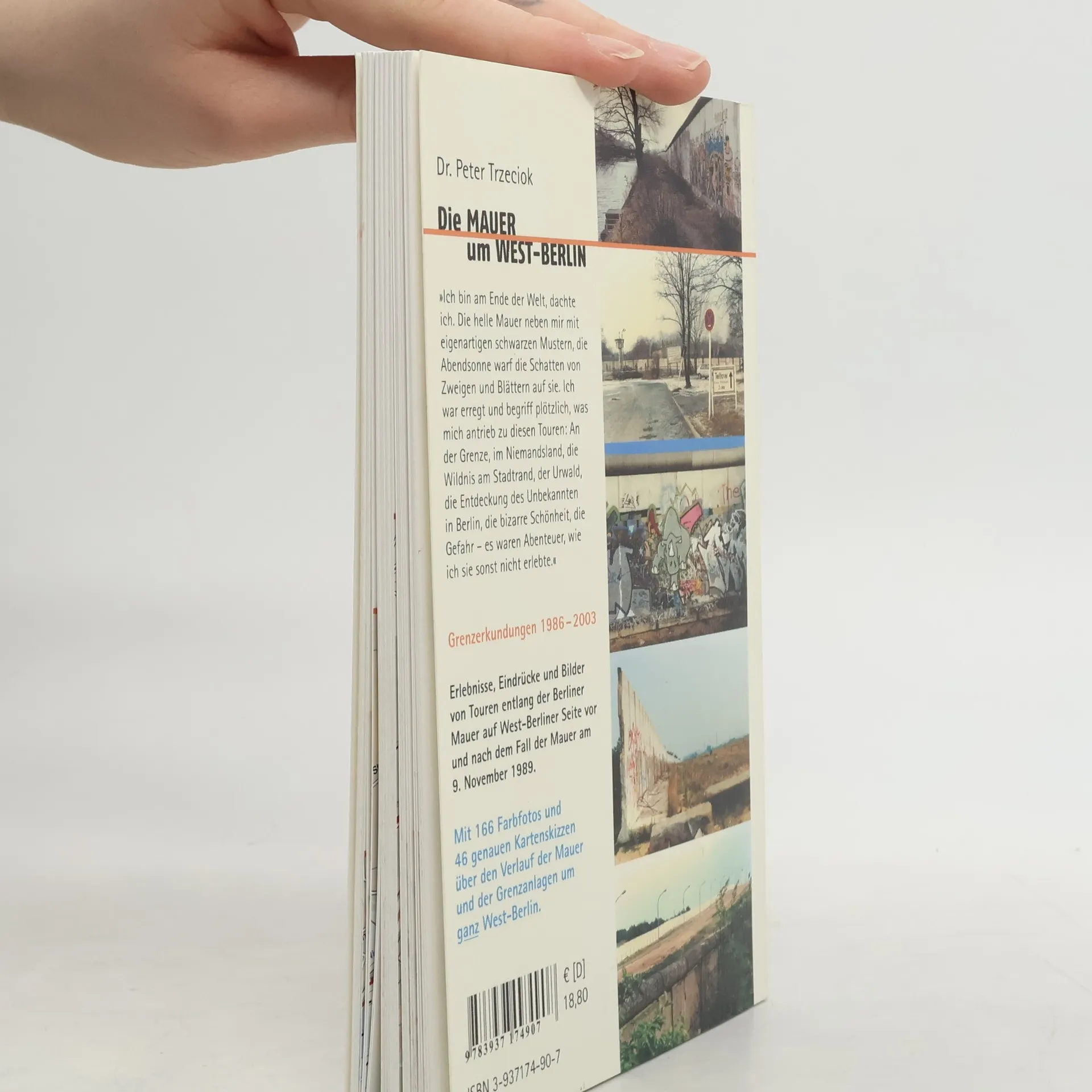 'Ich bin am Ende der Welt, dachte ich. Die helle Mauer neben mir mit eigenartigen schwarzen Mustern, die Abendsonne warf die Schatten von Zweigen und Blättern auf sie. Ich war erregt und begriff plötzlich, was mich antrieb zu diesen Touren: An der Grenze, im Niemandsland, die Wildnis am Stadtrand, der Urwald, die Entdeckung des Unbekannten in Berlin, die bizarre Schönheit, die Gefahr – es waren Abenteuer, wie ich sie sonst nicht erlebte.' Erlebnisse, Eindrücke und Bilder von Touren entlang der Berliner Mauer auf westberliner Seite vor und nach dem Fall der Mauer am 9. November 1989. Mit 166 Farbfotos und 46 genauen Kartenskizzen über den Verlauf der Mauer und der Grenzanlagen um ganz West-Berlin.