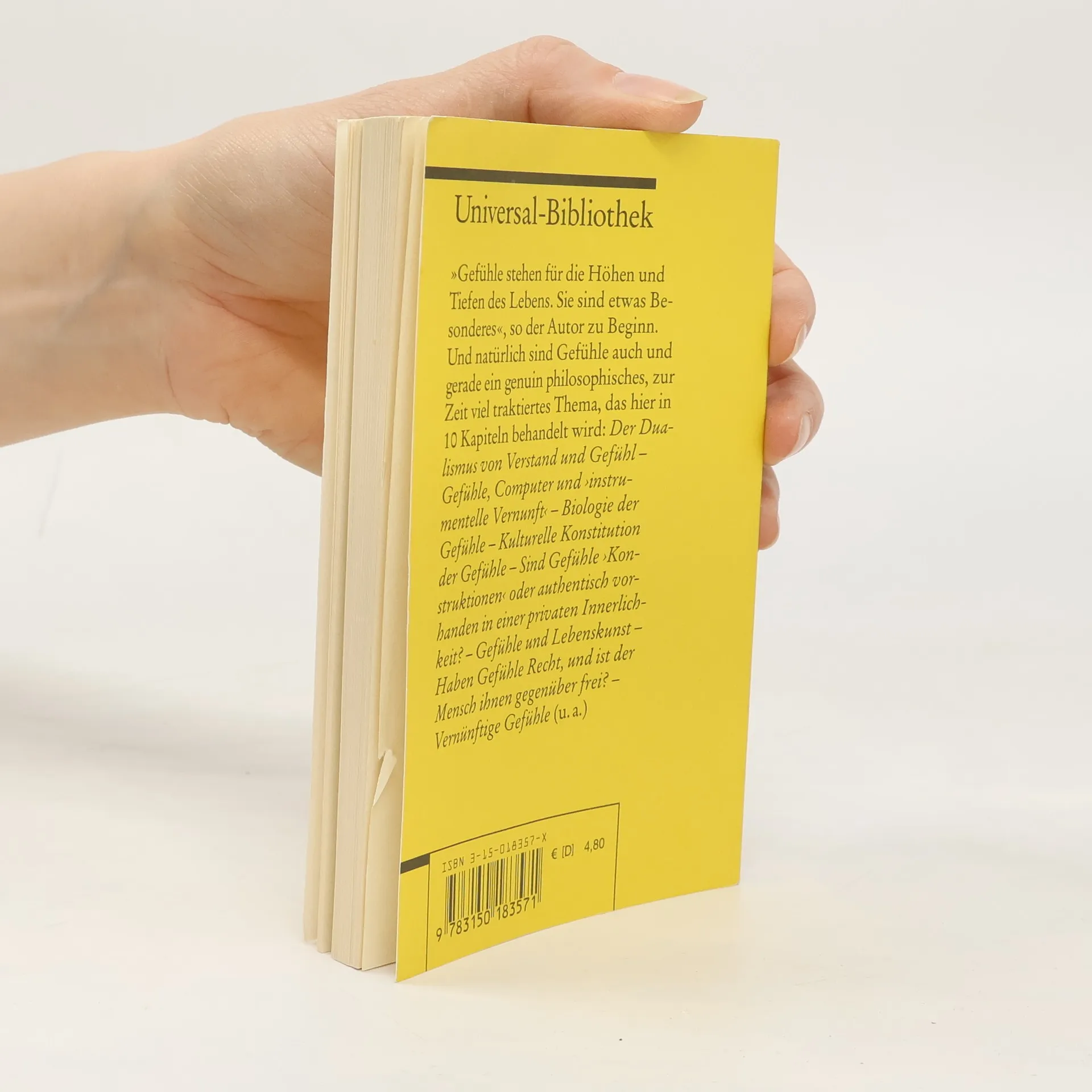 Gefühle sind nicht nur eine persönliche, sondern auch und gerade eine genuin philosophische Angelegenheit. Heiner Hastedt behandelt das Thema u. a. in folgenden Kapiteln: Der Dualismus von Verstand und Gefühl - Biologie der Gefühle - Kulturelle Konstruktion der Gefühle - Gefühle und Lebenskunst - Haben Gefühle Recht? - Vernünftige Gefühle.