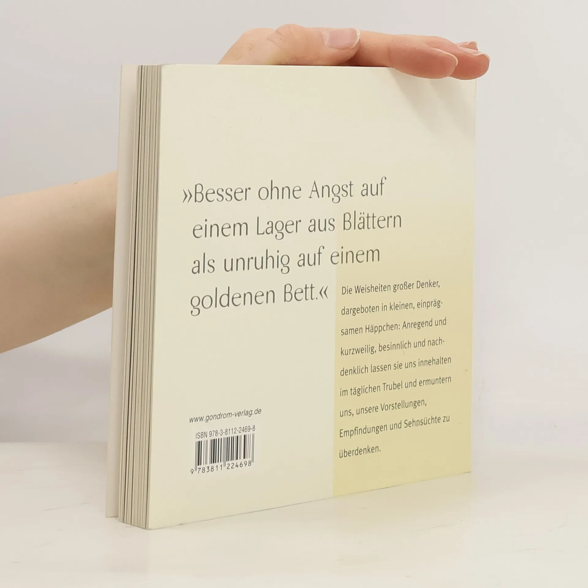 Die Weisheiten grosser Denker, dargeboten in kleinen, einprägsamen Häppchen: Anregend und kurzweilig, besinnlich und nachdenklich lassen sie uns innehalten im tägichen Trubel und ermuntern uns, unsere Vorstellungen, Empfindungen und Sehnsüchte zu überdenken.