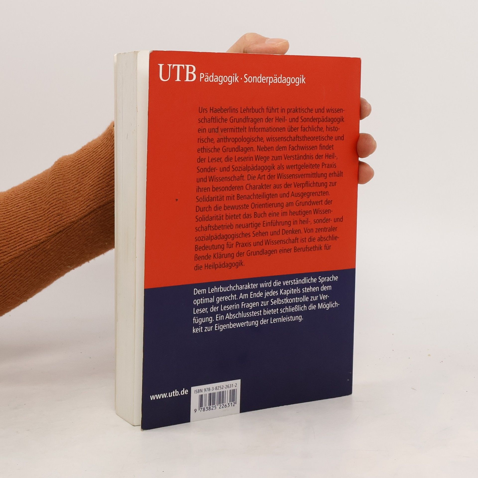 Urs Haeberlins Lehrbuch führt in praktische und wissenschaftliche Grundfragen der Heil- und Sonderpädagogik ein und vermittelt Informationen über fachliche, historische, anthropologische, wissenschaftstheoretische und ethische Grundlagen. Neben dem Fachwissen findet der Leser, die Leserin Wege zum Verständnis der Heil-, Sonder- und Sozialpädagogik als wertgeleitete Praxis und Wissenschaft. Die Art der Wissensvermittlung erhält ihren besonderen Charakter aus der Verpflichtung zur Solidarität mit Benachteiligten und Ausgegrenzten. Durch die bewusste Orientierung am Grundwert der Solidarität bietet das Buch eine im heutigen Wissenschaftsbetrieb neuartige Einführung in heil-, sonder- und sozialpädagogisches Sehen und Denken. Von zentraler Bedeutung für Praxis und Wissenschaft ist die abschließende Klärung der Grundlagen einer Berufsethik für die Heilpädagogik. Dem Lehrbuchcharakter wird die verständliche Sprache optimal gerecht. Am Ende jedes Kapitels stehen dem Leser, der Leserin Fragen zur Selbstkontrolle zur Verfügung. Ein Abschlusstest bietet schließlich die Möglichkeit zur Eigenbewertung der Lernleistung.