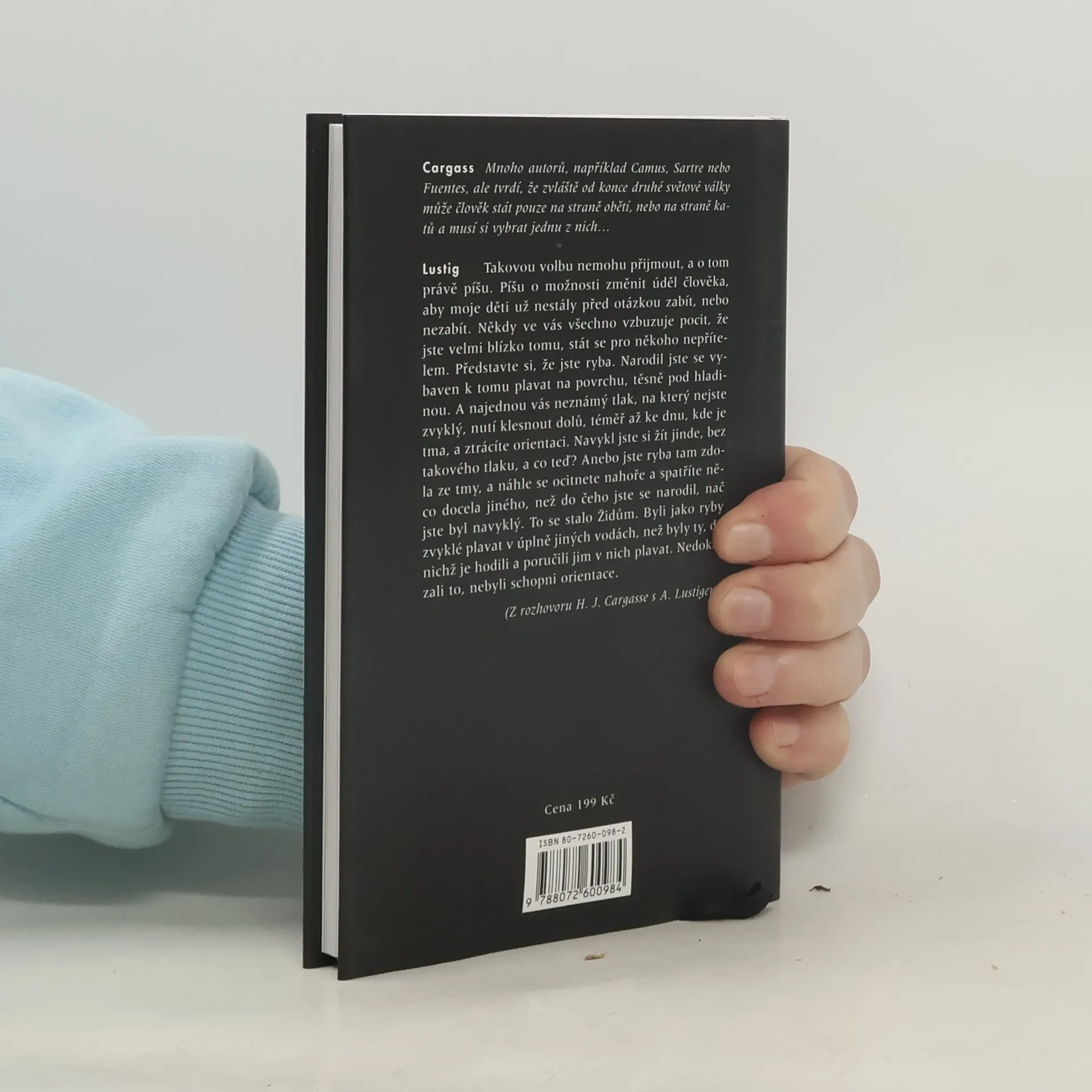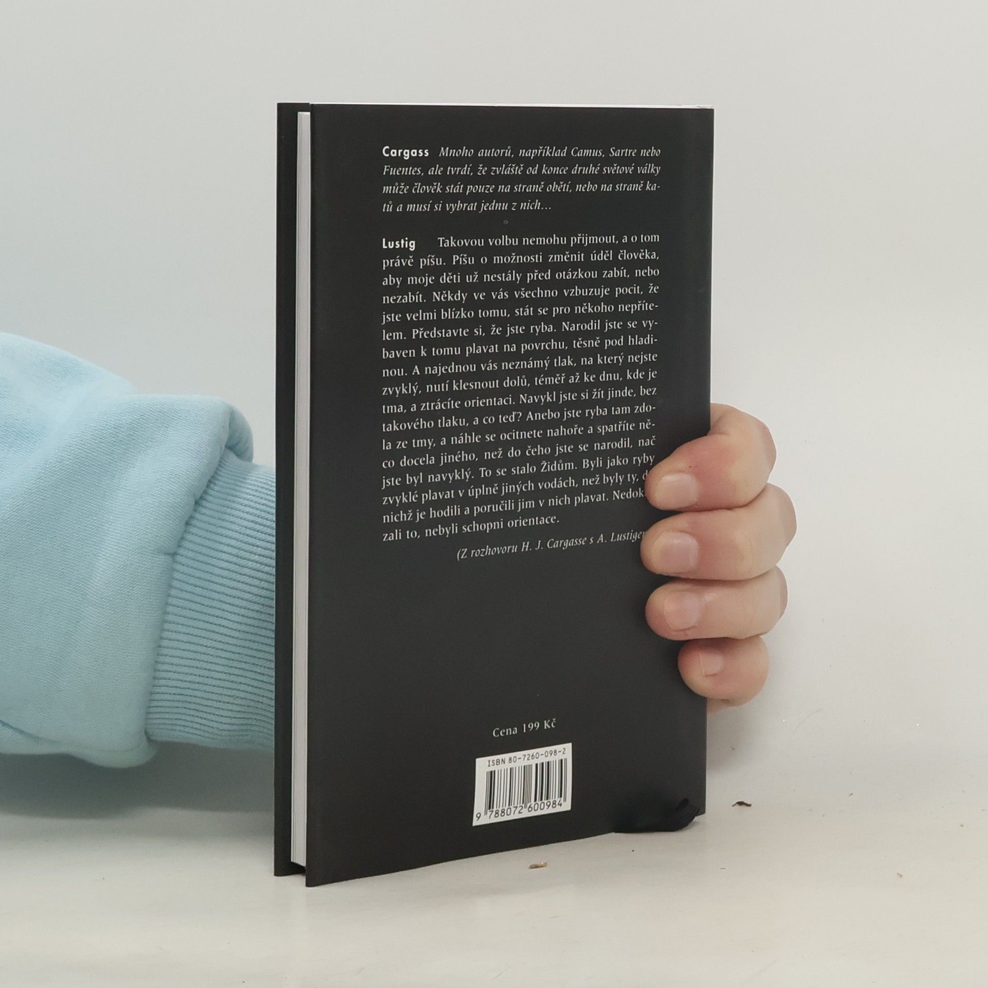 Nové, rozšířené vydání zásadních rozhovorů profesora univerzity v St. Louis Harryho Jamese Cargasse a literárního historika Michaela Bauera s českým spisovatelem a publicistou. První rozhovor, pořízený v roce 1992 a publikovaný o rok později v knize Witnesses of Catastrophe (Svědkové katastrofy), představuje Lustiga jako vnímavého svědka největší lidské tragédie 20. století. V dialogu s Michaelem Bauerem, publikovaném v roce 1998 v časopise Tvar, zastihujeme Lustiga o několik let staršího a naléhavěji uvažujícího o smyslu a poslání literárního díla. Sherwinův esej je nejstarší – vznikl už v roce 1979 –, avšak otázky, které si klade a na něž se pokouší najít odpověď, neztratily nic na své aktuálnosti. Knihu doprovázejí fotografie Lustigovy "dvorní" portrétistky Petry Růžičkové.