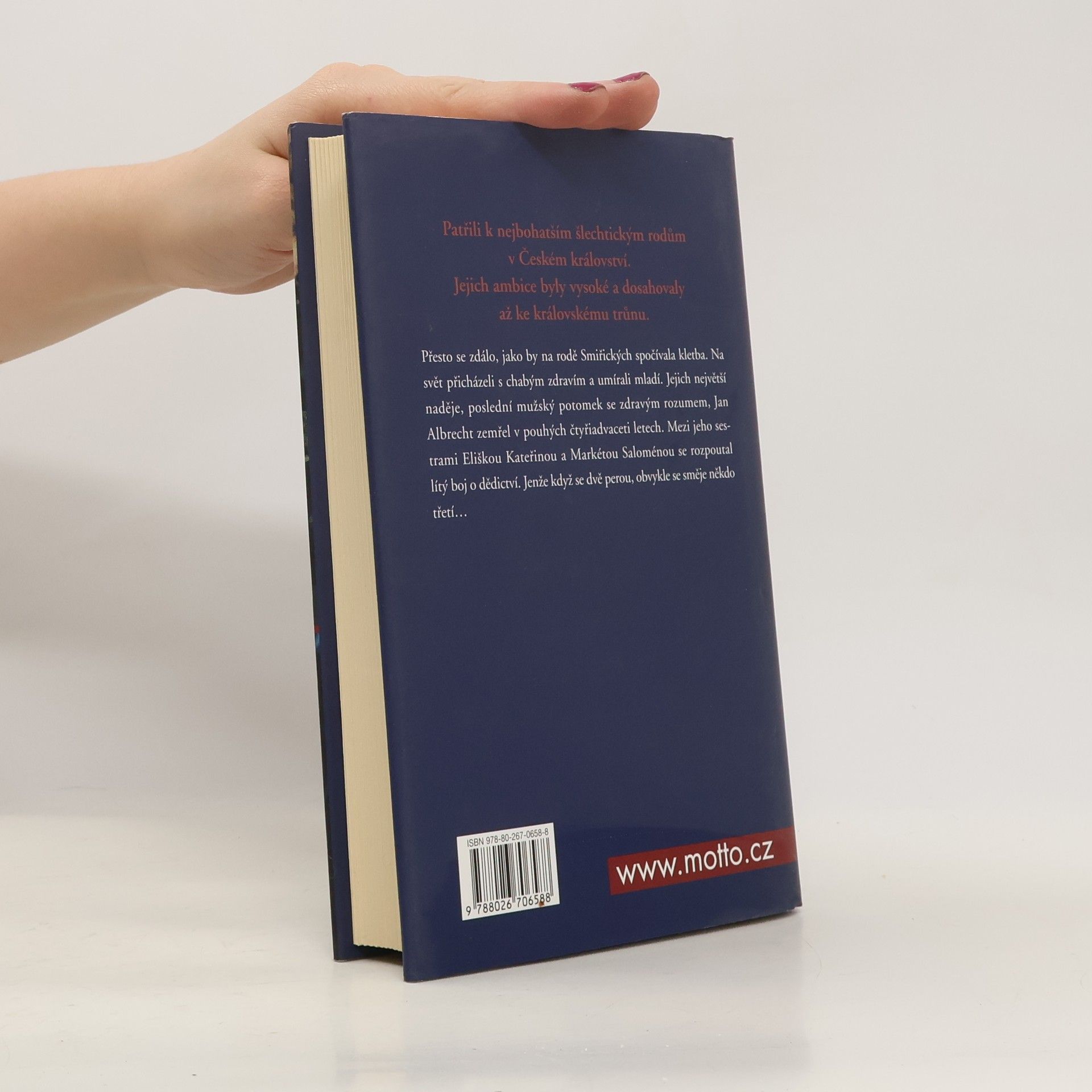 Patřili k nejbohatším šlechtickým rodům v Českém království. Jejich ambice byly vysoké a dosahovaly až ke královskému trůnu. Přesto se zdálo, jako by na rodě Smiřických spočívala kletba. Na svět přicházeli s chabým zdravím a umírali mladí. Jejich největší naděje, poslední mužský potomek se zdravým rozumem, Jan Albrecht zemřel v pouhých čtyřiadvaceti letech. Mezi jeho sestrami, Eliškou Kateřinou a Markétou Saloménou se rozpoutal lítý boj o dědictví. Jenže když se dvě perou, obvykle se směje někdo třetí…