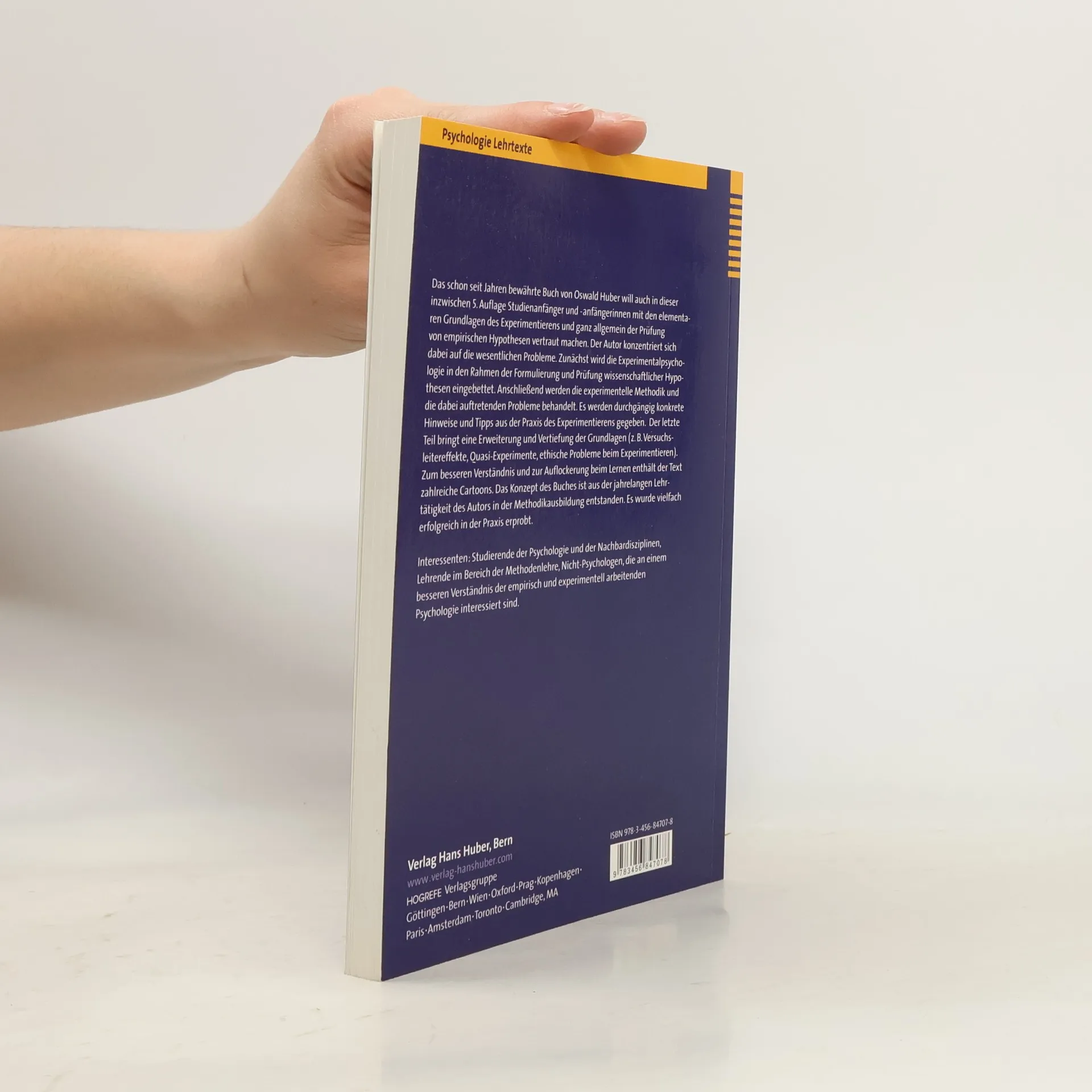 Das schon seit Jahren bewährte Buch von Oswald Huber will auch in dieser inzwischen 5. Auflage Studienanfänger und -anfängerinnen mit den elementaren Grundlagen des Experimentierens und ganz allgemein der Prüfung von empirischen Hypothesen vertraut machen. Der Autor konzentriert sich dabei auf die wesentlichen Probleme. Zunächst wird die Experimentalpsychologie in den Rahmen der Formulierung und Prüfung wissenschaftlicher Hypothesen eingebettet. Anschließend werden die experimentelle Methodik und die dabei auftretenden Probleme behandelt. Es werden durchgängig konkrete Hinweise und Tipps aus der Praxis des Experimentierens gegeben. Der letzte Teil bringt eine Erweiterung und Vertiefung der Grundlagen (z. B. Versuchsleitereffekte, Quasi-Experimente, ethische Probleme beim Experimentieren). Zum besseren Verständnis und zur Auflockerung beim Lernen enthält der Text zahlreiche Cartoons. Das Konzept des Buches ist aus der jahrelangen Lehrtätigkeit des Autors in der Methodikausbildung entstanden. Es wurde vielfach erfolgreich in der Praxis erprobt.