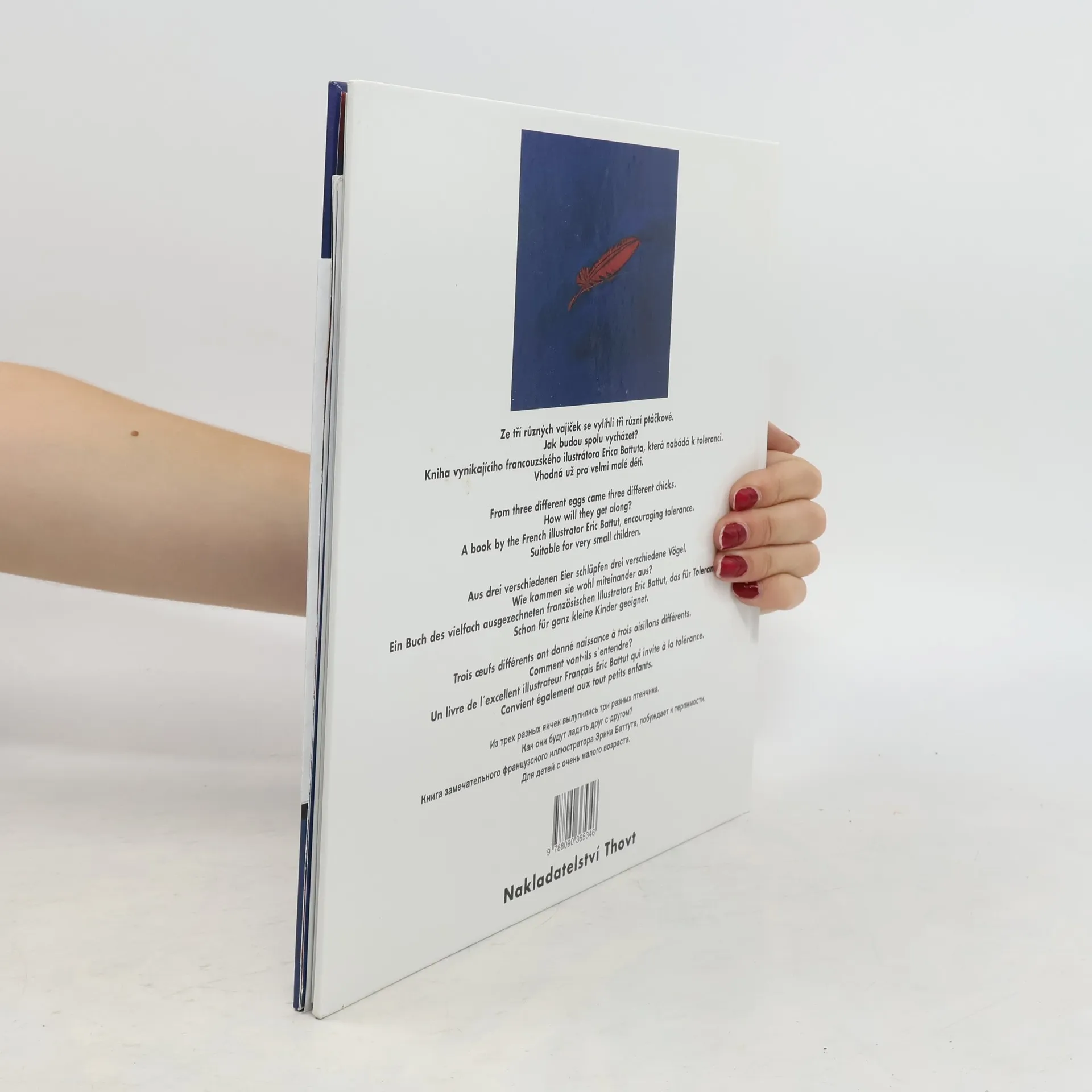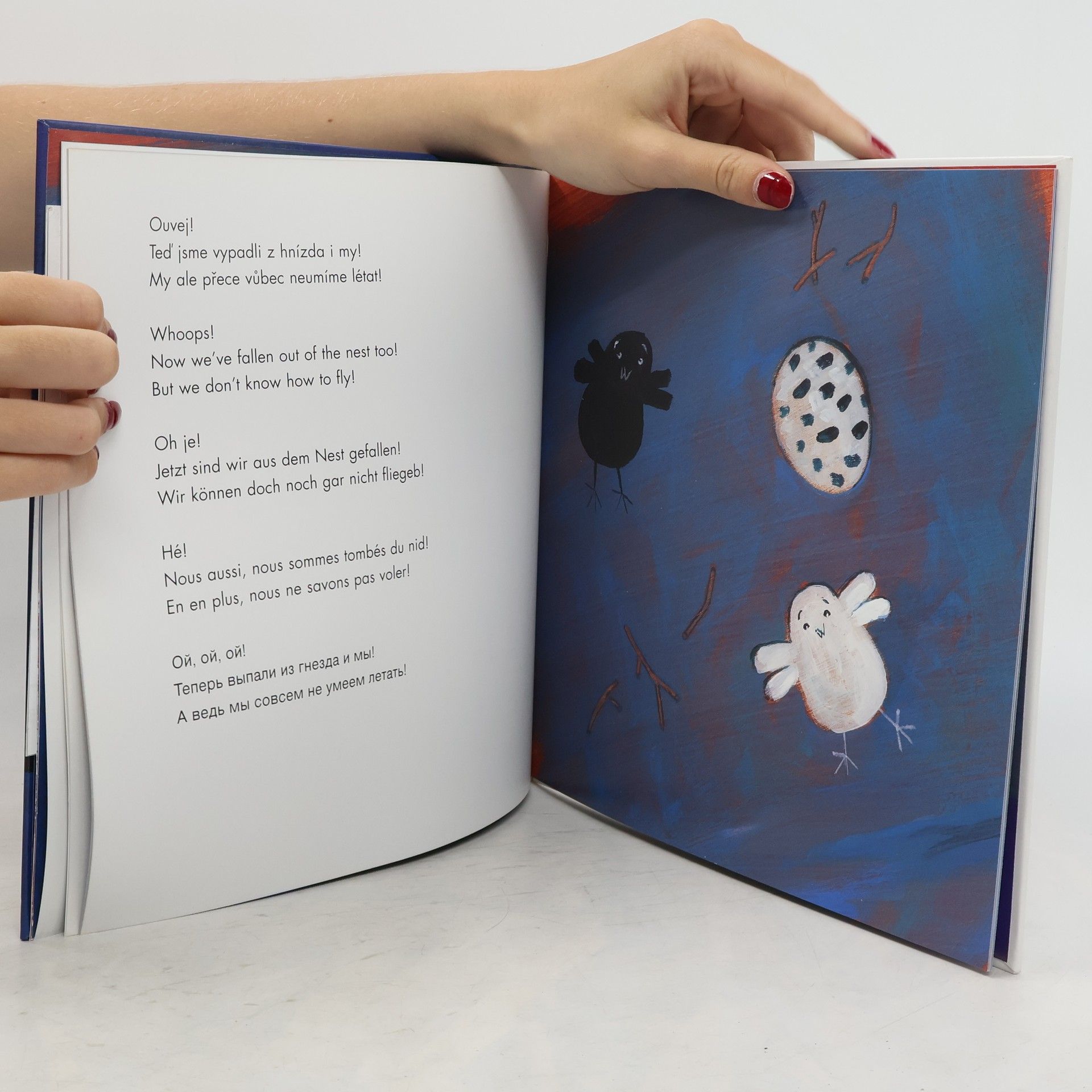 Multijazyková knížka pro malé děti, která vypráví v pěti jazycích (čeština,angličtina, němčina, francouzština, ruština) o třech různých vajíčkách, z nichž se vylíhnou tři různobarevní ptáčkové. Jak spolu asi budou malí ptačí uličníci vycházet? Nechme se překvapit…