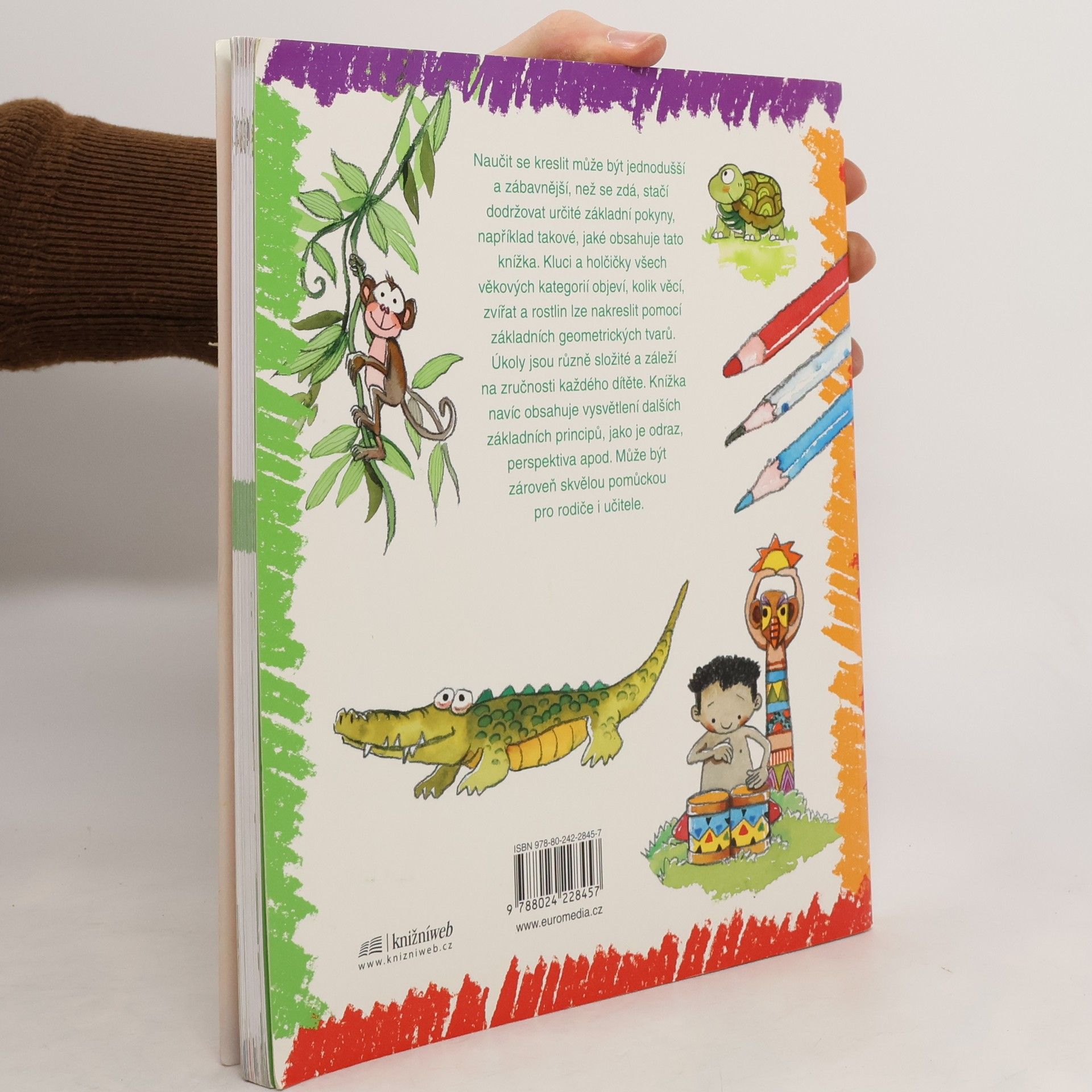 Nauč se kreslit 2. Nauč se kreslit krok za krokem zvířata a postavy z džungle. Nauč se kreslit džungli navazuje na úspěšnou knihu od stejné autorky Nauč se kreslit. Opět se zde děti učí kreslit pomocí jednoduchých tvarů, tentokrát především zvířata, o kterých se zároveň dozvídají různé zajímavosti. Stejně jako předchozí kniha i tato seznamuje s některými základními principy, například s perspektivou, a může proto sloužit jako skvělá pomůcka rodičům i učitelům.