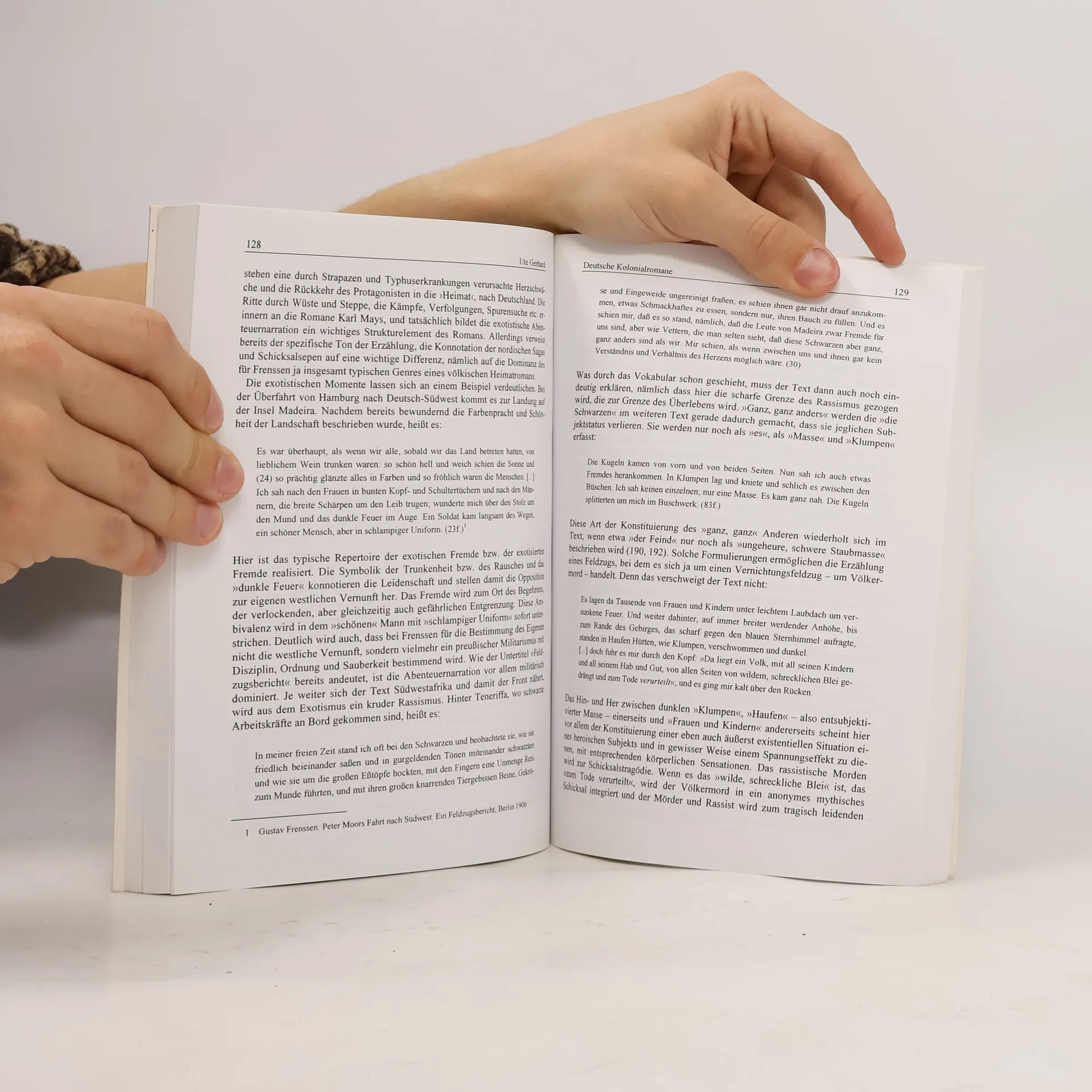 The text explores the historical, cultural, and literary dimensions of colonialism in German South-West Africa and its ongoing impact. It begins with a historical overview of the colonial wars, highlighting the significance of these events in both Germany and Namibia today. The cultural section examines the interplay between geography and colonialism, the origins of scouting influenced by colonial warfare, and the duality of memory surrounding figures like the "Südwester Reiter." In the realm of literary history, the text discusses the representation of German South-West Africa in colonial literature, analyzing the balance between propaganda and a sense of homeland. It critiques the continuation of colonial narrative patterns in German literature, particularly regarding the Herero War, and reflects on how colonial propaganda shaped perceptions during the Nazi era. The contemporary literature section addresses the themes of foreignness and experience in the works of authors like Uwe Timm and Gerhard Seyfried, while also considering the haunting presence of colonial ghosts in modern narratives. Personal reflections on encounters with Africa and the remnants of German colonialism further enrich the discourse. The annotation concludes with a brief mention of the contributors and the conference program, underscoring the multifaceted exploration of this complex subject.