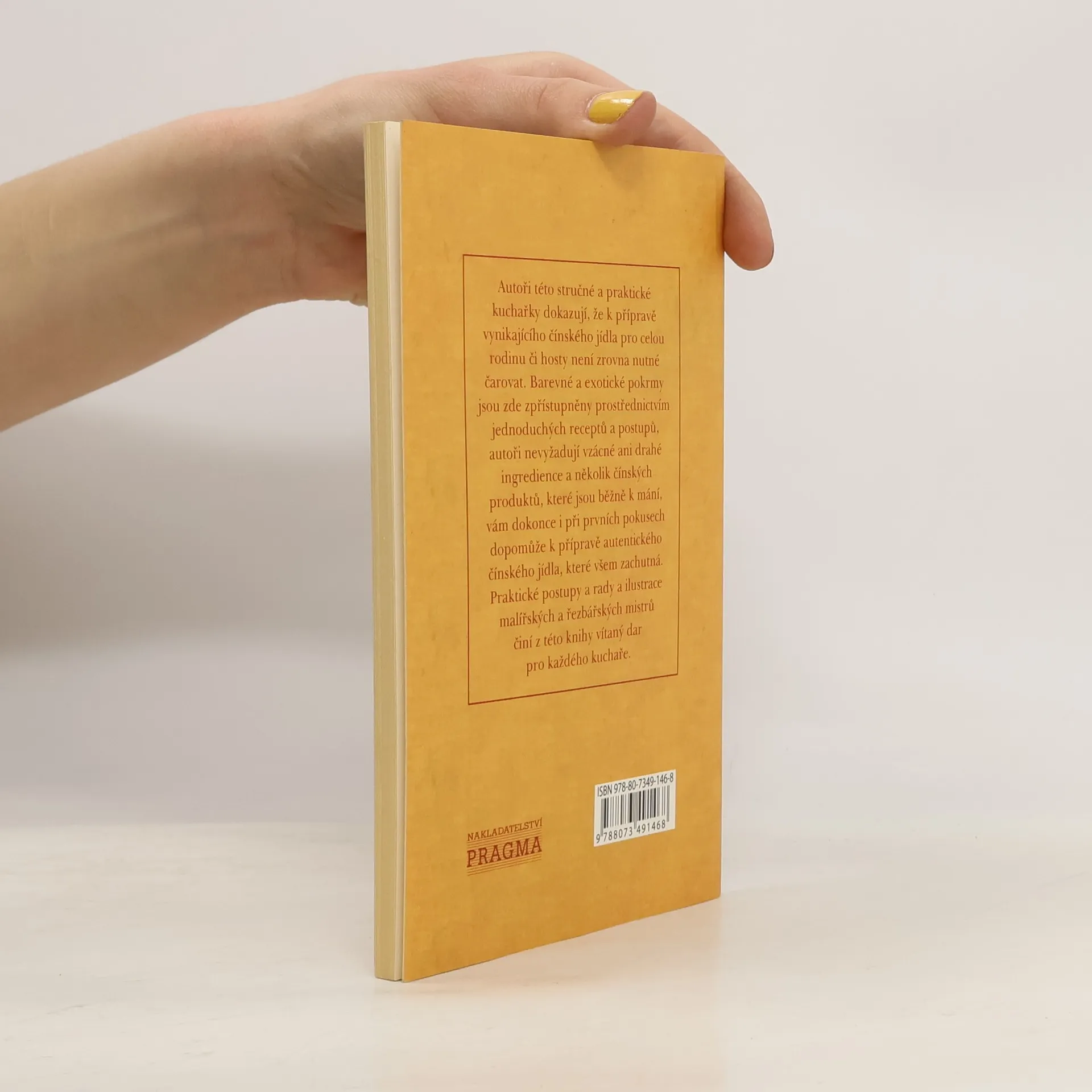 Autoři této stručné a praktické kuchařky dokazují, že k přípravě vynikajícího čínského jídla pro celou rodinu či hosty není zrovna nutné čarovat. Barevné a exotické pokrmy jsou zde zpřístupněny prostřednictvím jednoduchých receptů a postupů, autoři nevyžadují vzácné ani drahé ingredience a několik čínských produktů, které jsou běžně k mání, vám dokonce i při prvních pokusech dopomůže k přípravě autentického čínského jídla, které všem zachutná. Ilustrace malířských a řezbářských mistrů a praktické postupy a rady činí z této knihy vítaný dar pro každého kuchaře.