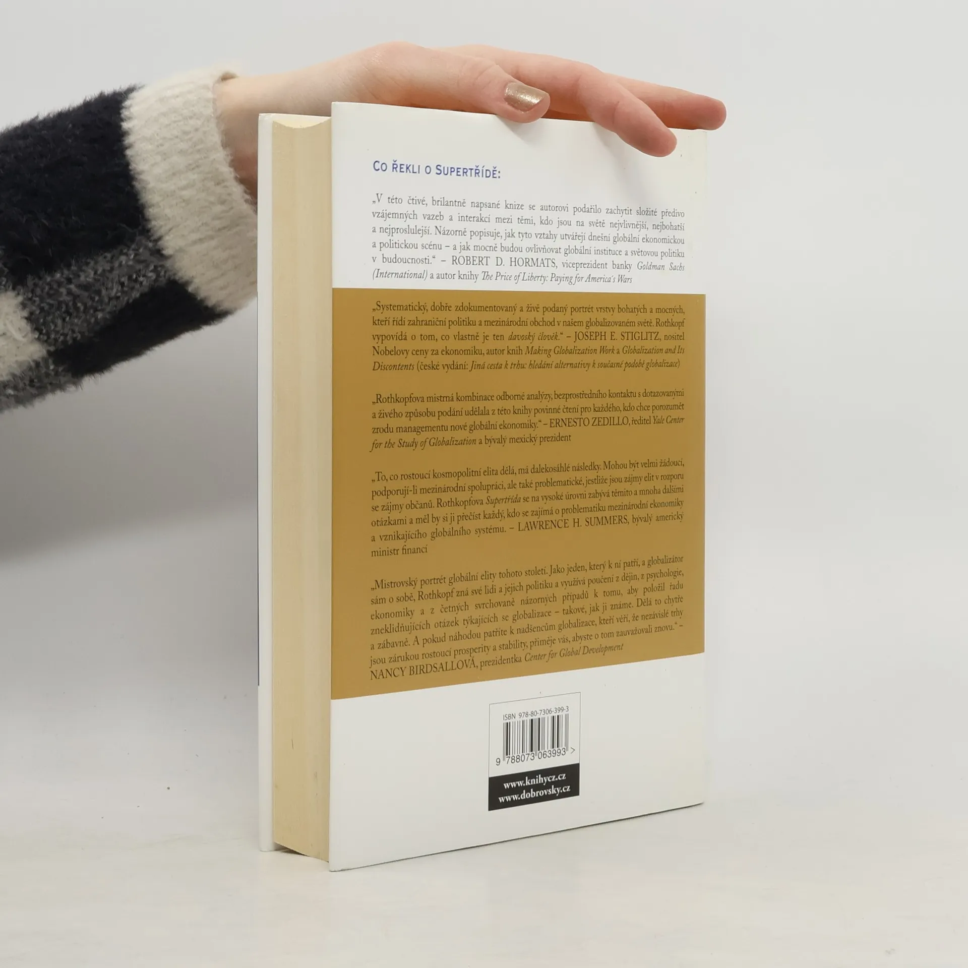 Je jich šest tisíc a závisí na nich životy šesti miliard tvořících celé lidstvo. Ovládají trhy, rozhodují o příjmech a mzdách, daních a úrocích, o práci – kde bude a odkud zmizí –, dosazují vlády, drží v rukou páky mezinárodní politiky. Postarali se o nevídaný růst globálního bohatství – hlavně ovšem svého. Na tuto kosmopolitní elitu – bankéře, manažery a správní rady mezinárodních společností, ruské oligarchy, naftové šejky, magnáty mediálního a zábavního průmyslu, esa mezinárodní politiky – na to, jak (si) žijí a jak „to dělají“, vrhá břitce kritický (i sebekritický) pohled člověk, který k nim měl blízko – někdejší člen Clintonova týmu, Kissingerův obchodní partner a bývalý vysoký úředník amerického ministerstva obchodu.