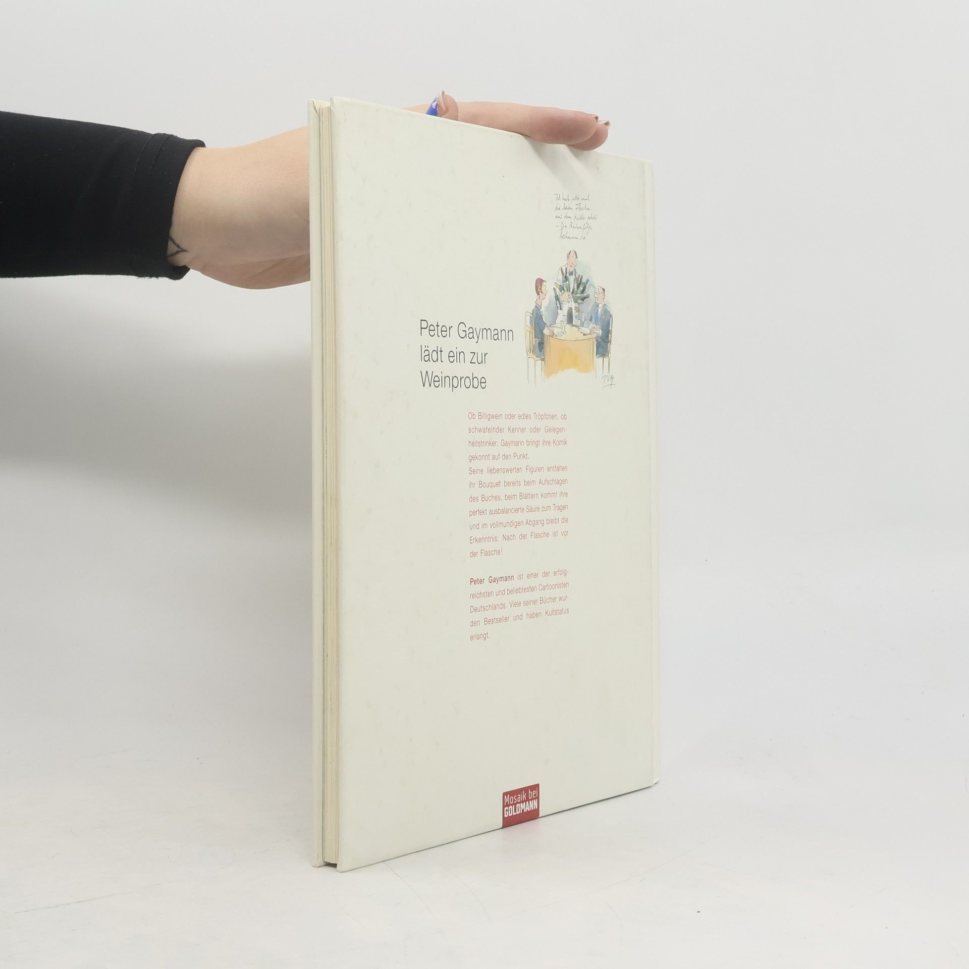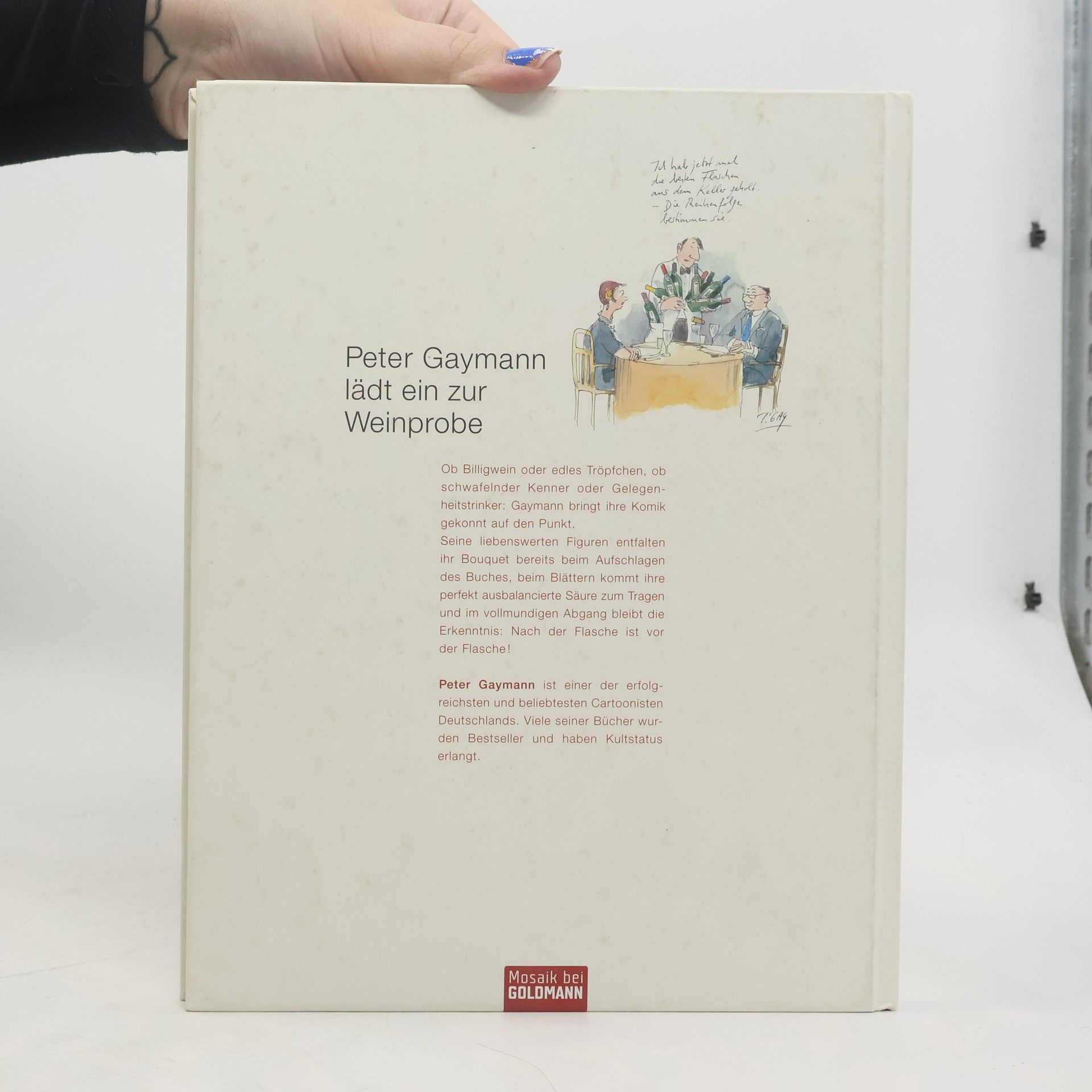 Spritzige Cartoons – In vino veritas! Der Geist aus der Flasche bringt so manche Wahrheit ans Licht und ermöglicht einen Blick auf unser wahres Wesen. Mit spitzer Feder, frechen Sprüchen und seinem unverwechselbaren Zeichenstil hat Peter Gaymann die (Un-)Sitten der Weintrinker, -kenner und –hasser in amüsante Cartoons verwandelt. Gaymann legt in seinem neuen Buch ca. 80 Zeichnungen vor, die Genießer, Verkoster und andere Menschen bei einem guten Tropfen und in allen möglichen und unmöglichen Lebenslagen zeigen. Von trocken bis spritzig – Gaymanns Humor trifft immer wieder ins Schwarze. Das ideale Geschenk für nette Zeitgenossen – statt oder zu der Flasche Wein. Ausstattung: durchgehend 4-farbig, 88 farbige Abbildungen