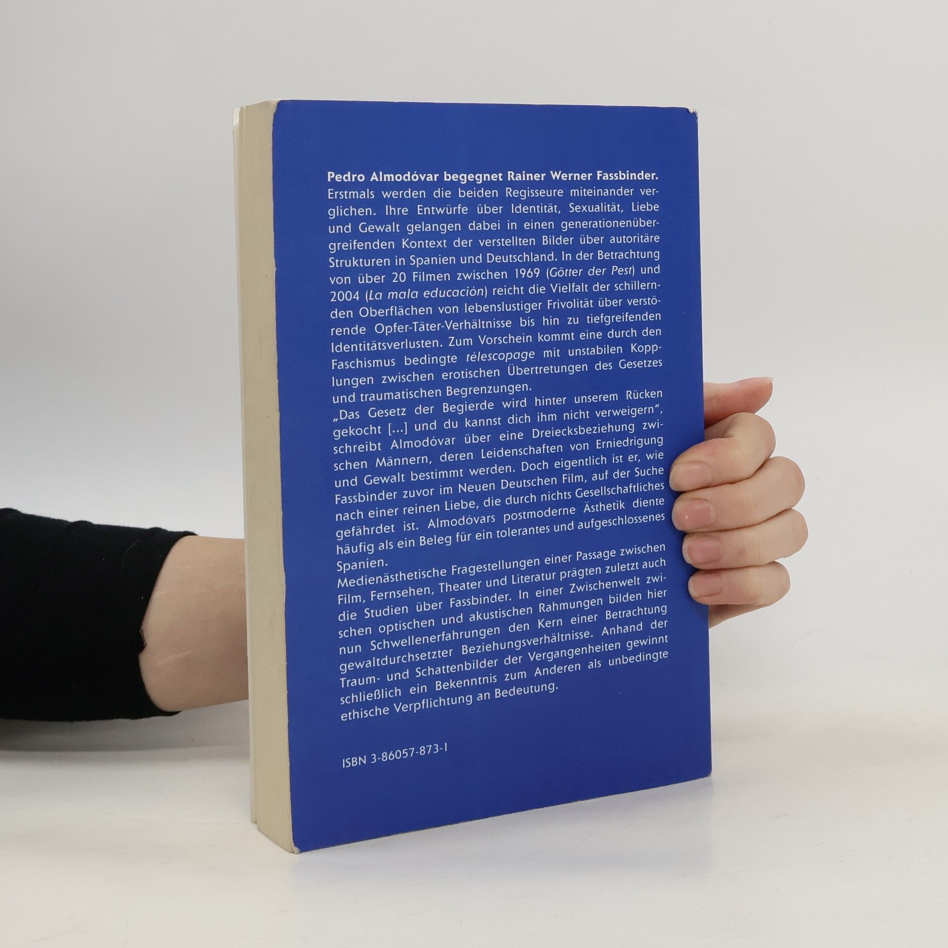 Pedro Almodóvar begegnet Rainer Werner Fassbinder und vergleicht erstmals die beiden Regisseure. Ihre Entwürfe zu Identität, Sexualität, Liebe und Gewalt werden in einen generationenübergreifenden Kontext autoritärer Strukturen in Spanien und Deutschland eingeordnet. Über 20 Filme von 1969 bis 2004 zeigen eine Vielfalt von lebenslustiger Frivolität bis zu verstörenden Opfer-Täter-Verhältnissen und tiefgreifenden Identitätsverlusten. Die durch den Faschismus bedingte télescopage offenbart instabile Verbindungen zwischen erotischen Übertretungen und traumatischen Begrenzungen. Almodóvar beschreibt in einer Dreiecksbeziehung zwischen Männern, deren Leidenschaften von Erniedrigung und Gewalt geprägt sind: „Das Gesetz der Begierde wird hinter unserem Rücken gekocht [...] und du kannst dich ihm nicht verweigern.“ Wie Fassbinder im Neuen Deutschen Film sucht er nach einer reinen Liebe, die nicht durch gesellschaftliche Normen gefährdet ist. Almodóvars postmoderne Ästhetik wird oft als Zeichen eines toleranten Spaniens interpretiert. Medienästhetische Fragestellungen zu Film, Fernsehen, Theater und Literatur prägten auch die Studien über Fassbinder. In dieser Zwischenwelt bilden Schwellenerfahrungen den Kern einer Analyse gewaltdurchsetzter Beziehungen, während Traum- und Schattenbilder der Vergangenheit ein Bekenntnis zum Anderen als ethische Verpflichtung hervorheben.