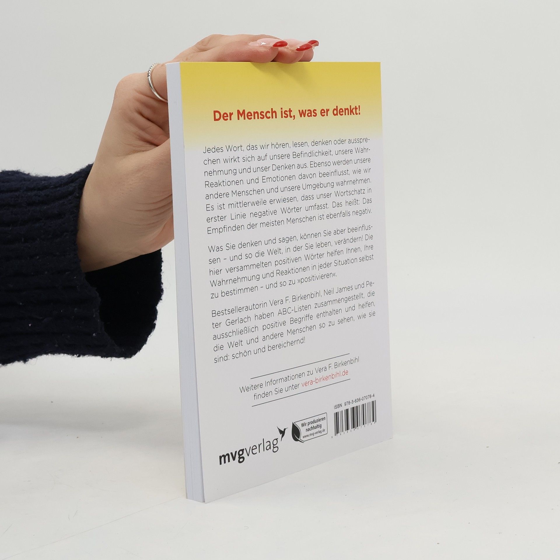 Jedes Wort wirkt sich auf die Befindlichkeit, Wahrnehmung und das Denken eines Menschen aus. Ebenso werden unsere Reaktionen und Emotionen davon beeinflusst, wie wir andere Menschen und die nähere Umgebung wahrnehmen. Es ist mittlerweile erwiesen, dass unser Wortschatz primär negative Wörter umfasst, d. h. die Wahrnehmung der meisten Menschen ist ebenfalls negativ. Vera F. Birkenbihl, Neil James und Peter Gerlach haben ABC-Listen zusammengestellt, die ausschließlich positive Begriffe enthalten und helfen, die Welt und andere Menschen so zu sehen, wie sie sind: schön und bereichernd!