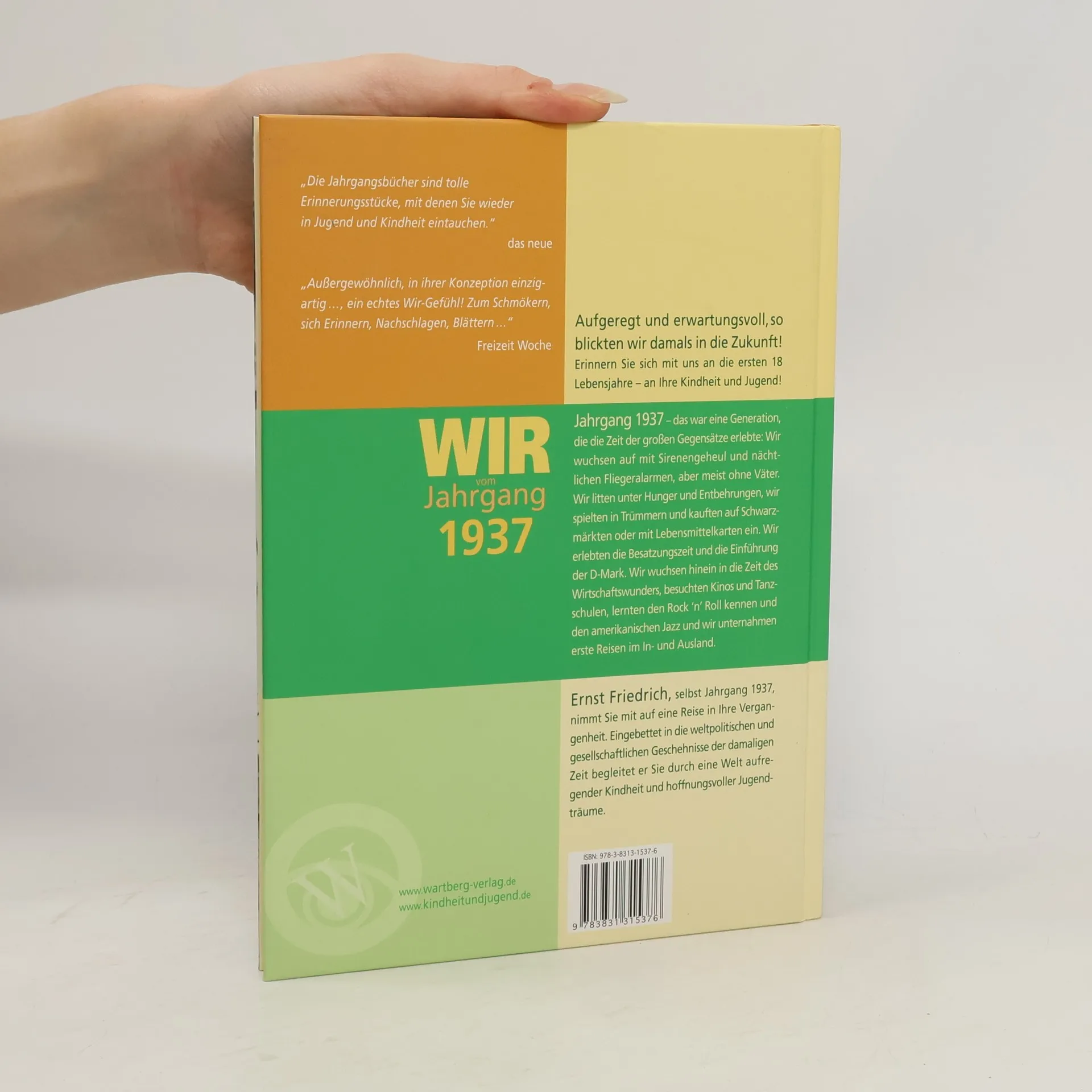 Aufgeregt und erwartungsvoll, so blickten wir damals in die Zukunft! Erinnern Sie sich mit uns an die ersten 18 Lebensjahre – an Ihre Kindheit und Jugend! Jahrgang 1937 - das war eine Generation, die die Zeit der großen Gegensätze erlebte: Wir wuchsen auf mit Sirenengeheul und nächtlichen Fliegeralarmen, aber meist ohne Väter. Wir litten unter Hunger und Entbehrungen, wir spielten in Trümmern und kauften auf Schwarzmärkten oder mit Lebensmittelkarten ein. Wir erlebten die Besatzungszeit und die Einführung der D-Mark. Wir wuchsen hinein in die Zeit des Wirtschaftswunders, besuchten Kinos und Tanzschulen, lernten den Rock 'n' Roll kennen und den amerikanischen Jazz und wir unternahmen erste Reisen im In- und Ausland.