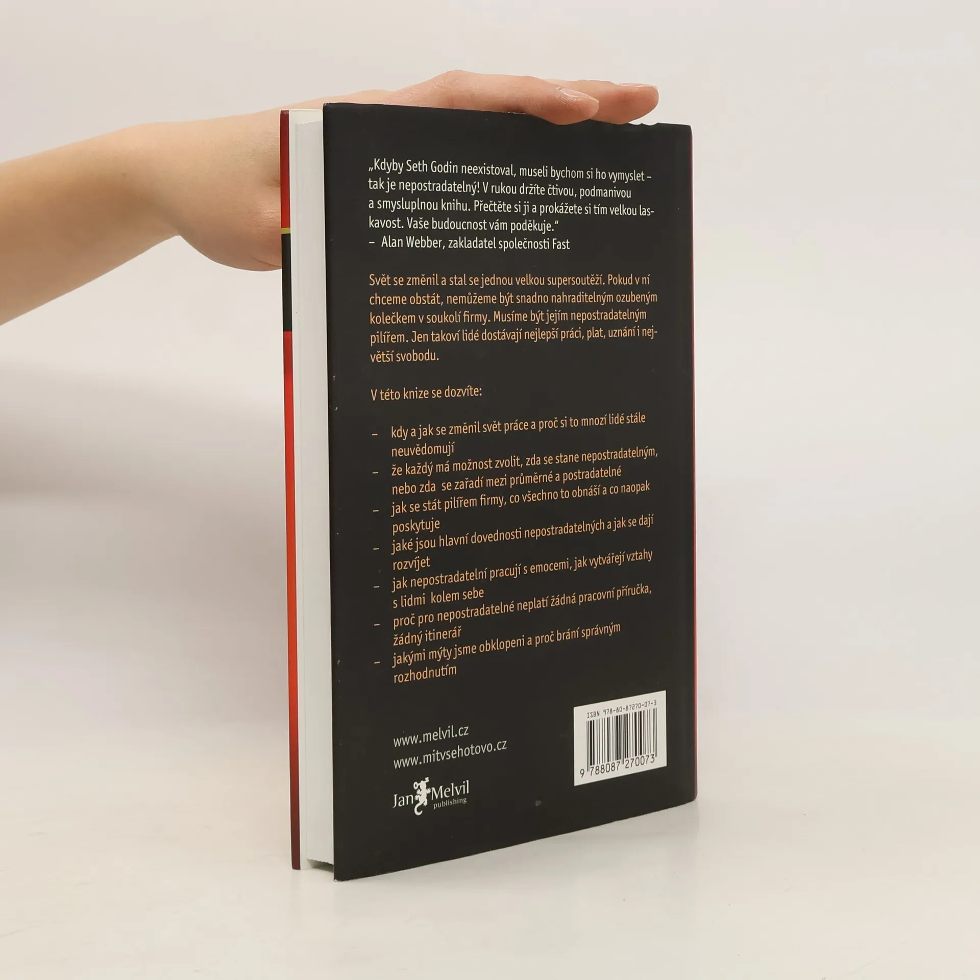 Nepostradatelní jsou základními stavebními kameny prosperující firmy. Tak jako může na pár skrytých pilířích stát dům nebo most, stejně tak ani oni nemusejí být vidět, ale jsou tu a jsou skutečně nepostradatelní. A v dnešním světě dostávají právě ta nejlepší pracovní místa a s nimi i nejvíc svobody. V této knize se dozvíte: - kdy a jak se změnil svět práce a proč si to mnozí lidé stále neuvědomují že každý má možnost zvolit, zda se stane nepostradatelným, nebo zda se zařadí mezi průměrné a postradatelné - jak se stát pilířem firmy, co všechno to obnáší a co naopak poskytuje - jaké jsou hlavní dovednosti nepostradatelných a jak se dají rozvíjet - jak nepostradatelní pracují s emocemi, jak vytvářejí vztahy s lidmi kolem sebe - proč pro nepostradatelné neplatí žádná pracovní příručka, žádný itinerář - jakými mýty jsme obklopeni a proč brání správným rozhodnutím