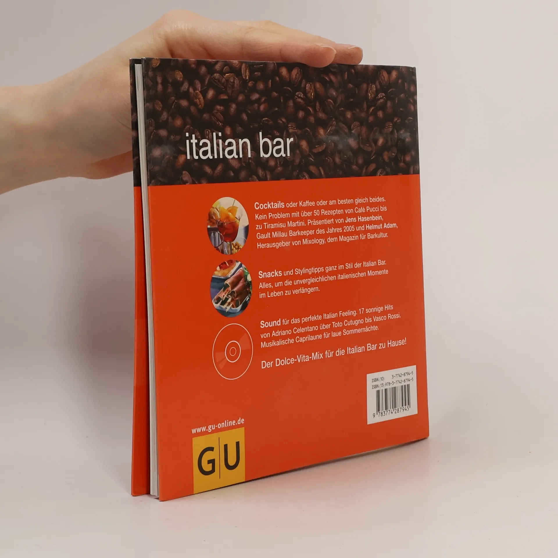 Morgens vor der Arbeit flink noch einen Espresso und ein Hörnchen, mittags dann ein Tramezzini mit einem Campari Soda und abends mit allen Amici und Ragazzi auf einen schicken Cocktail – Bienvenuto in der Italian Bar! In Italian Bar gibt es alles was für die italienischen Momente im Leben braucht und das rund im die Uhr: Rezepte für die beliebtesten Kaffeespezialitäte, leckere Snacks und für 50 Cocktails a l’italiana; von Klassikern wie Americano oder Bellini zu trendigen Drinks wie Hazelnut Martini oder Cosmopolitan a Fragola. Und fürs richtige Dol-ce-vita-Ambiente sorgen viele Inszenierungstipps und natür-lich die passende Musik: Gepflegter Italopop und gefühlvolle Balladen von Eros Ramazotti, Adriano Celentano, Gianna Nanini und Paolo Conte.