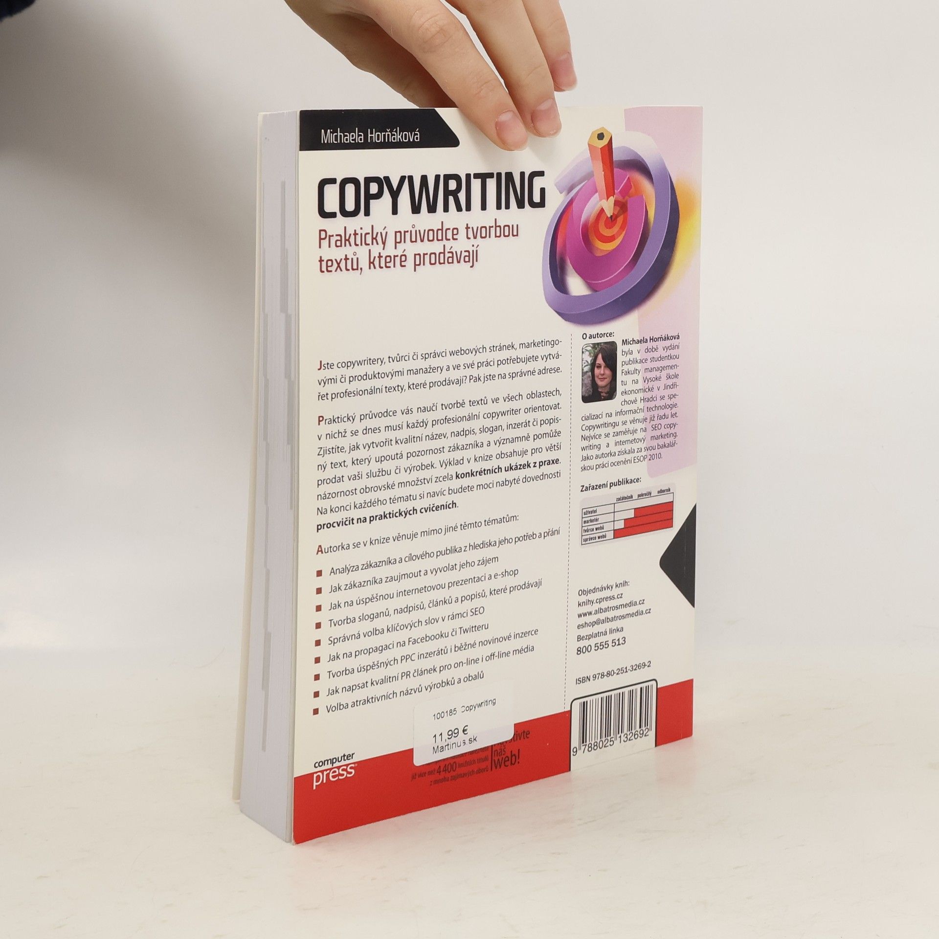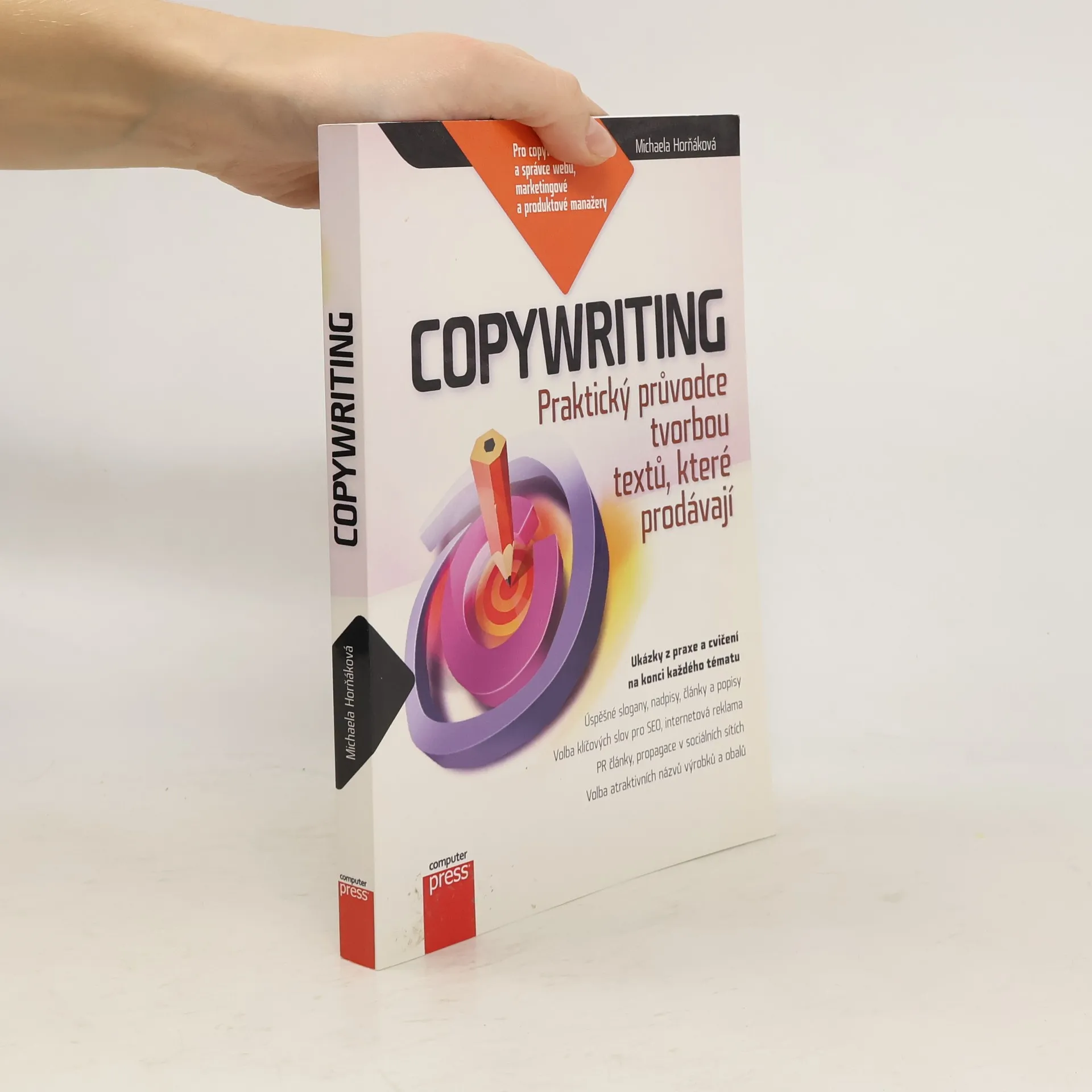 Podrobný průvodce tvorbou textů, které prodávají. Jste copywritery, tvůrci či správci webových stránek, marketingovými či produktovými manažery a ve své práci potřebujete vytvářet profesionální texty, které prodávají? Pak jste na správné adrese. Praktický průvodce vás naučí tvorbě textů ve všech oblastech, v nichž se dnes musí každý profesionální copywriter orientovat. Zjistíte, jak vytvořit kvalitní název, nadpis, slogan, inzerát či popisný text, který upoutá pozornost zákazníka a významně pomůže prodat vaši službu či výrobek. Výklad v knize obsahuje pro větší názornost obrovské množství zcela konkrétních ukázek z praxe. Na konci každého tématu si navíc budete moci nabyté dovednosti procvičit na praktických cvičeních. Autorka se v knize věnuje mimo jiné těmto tématům: Analýza zákazníka a cílového publika z hlediska jeho potřeb a přání Jak zákazníka zaujmout a vyvolat jeho zájem Jak na úspěšnou internetovou prezentaci a e-shop Tvorba sloganů, nadpisů, článků a popisů, které prodávají Správná volba klíčových slov v rámci SEO Jak na propagaci na Facebooku či Twitteru Tvorba úspěšných PPC inzerátů i běžné novinové inzerce Jak napsat kvalitní PR článek pro on-line i off-line média Volba atraktivních názvů výrobků a obalů