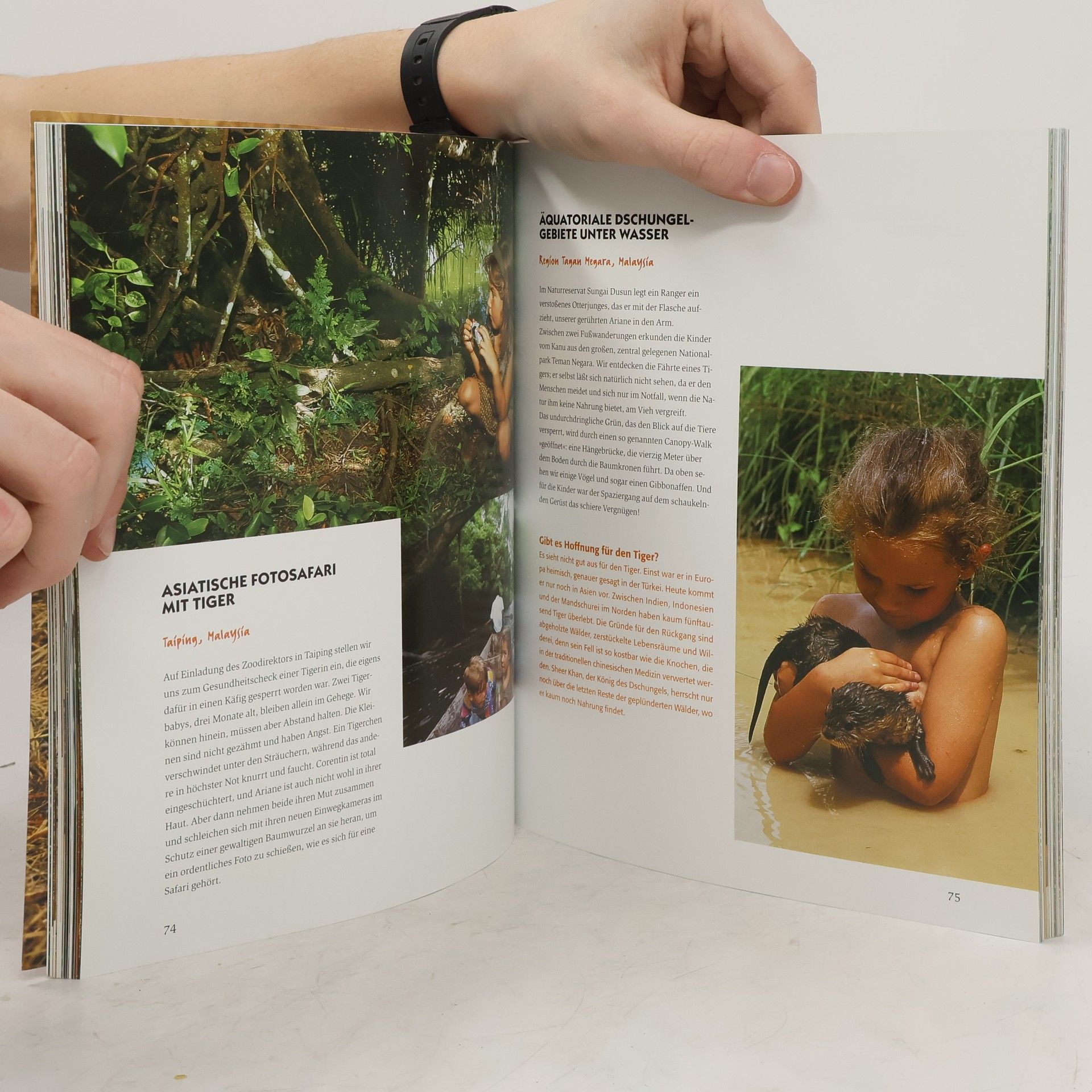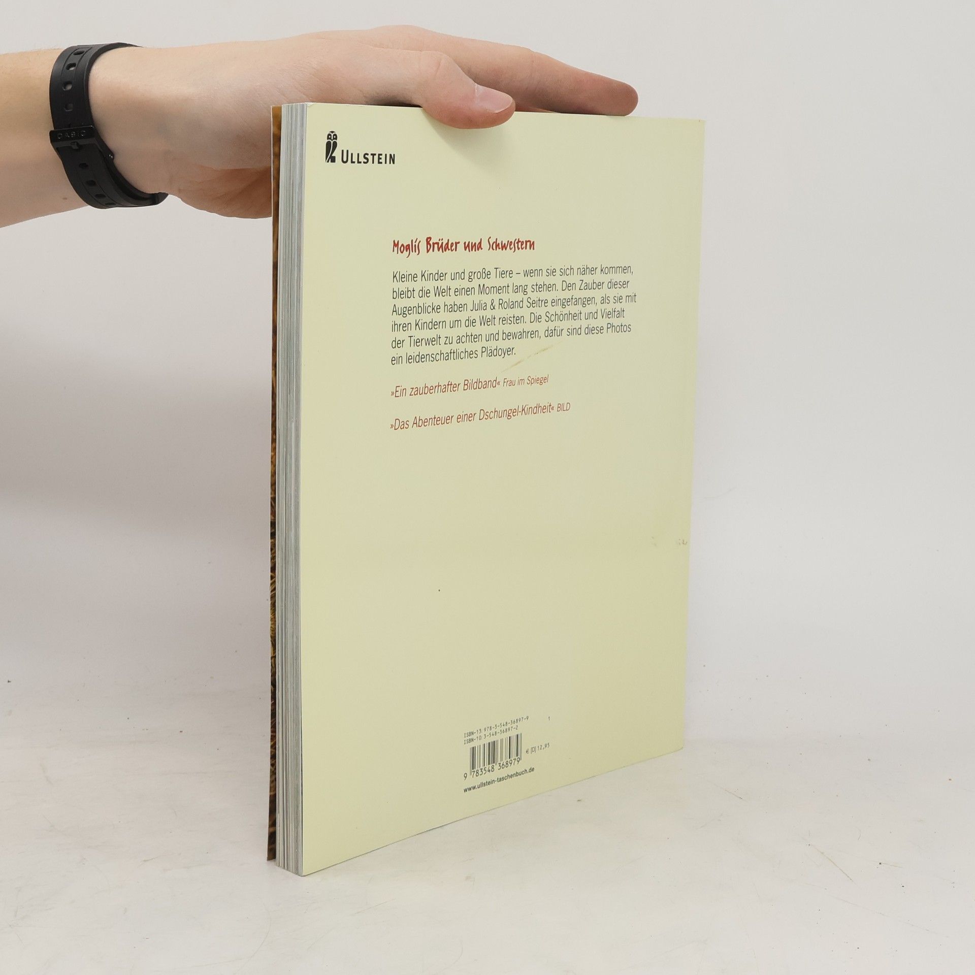 'Mit der Familie um die ganze Welt! Diesen Traum haben sich die Tierärzte und Tierphotographen Julia und Roland Seitre erfüllt. Seit über zehn Jahren reisen sie von Kontinent zu Kontinent. Bereits als Baby entdeckte die älteste Tochter Ariane die wilden Tiere Afrikas und Amazoniens. Sie tollte mit einem Nashorn im Schlamm herum, spielte mit Giraffen und badete mit Elefanten; später schmuste ihr kleiner Bruder Corentin in Australien mit Koalabären, Kängurus und exotischen Papageien. Inzwischen hat auch die kleinste Tochter Mahaut ihre Siebenmeilenstiefel angezogen, um den Planeten Erde zu erkunden. Die farbenprächtigen und anrührenden Photos, die Julia und Roland Seitre aus Afrika, aus Nord- und Südamerika, aus Australien, Asien, Madagaskar, aus der Antarktis und aus Europa mitbrachten, erzählen von der besonderen Beziehung zwischen Kindern und wilden Tieren, sie öffnen den Blick für den unerschöpflichen Reichtum der Natur, aber auch für ihre Zerstörung durch den Menschen sowie für das Verschwinden zahlreicher Tier- und Pflanzenarten. Eine Hymne an die paradiesische Schönheit der Welt und eine Botschaft der Liebe.'