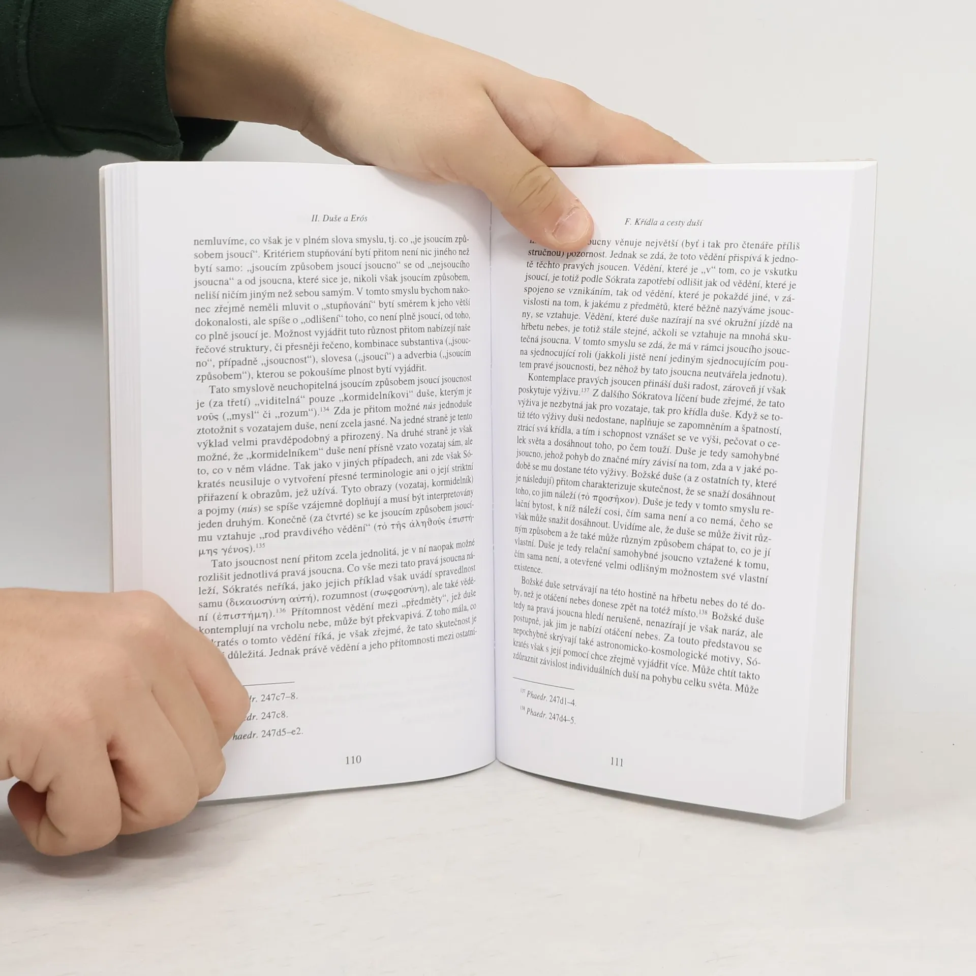 Duše a krása v dialogu Faidros Kniha Duše a krása v dialogu Faidros se zaměřuje na paralelu mezi řečí a tělem a ukazuje nejen šance, ale také rizika lidské vzájemnosti. Krásné tělo i krásná řeč jsou schopny v lidské duši vyvolat hnutí lásky, kterou Platón pojímá jako rozpomínku na skutečnou krásu. Tělo i řeč se tedy mohou stát médiem rozpomínky na to, co skutečně je, a tak příležitostí k překonání naší zaslepenosti, mohou však být také zaměněny za to, po čem duše touží a na co se jejich prostřednictvím rozpomíná. Právě v této ambivalenci představují řeč a tělo prostor, v němž se uskutečňuje lidský život pojatý jako mnohoznačný pohyb vtělených duší přispívající k utváření celku kosmu.