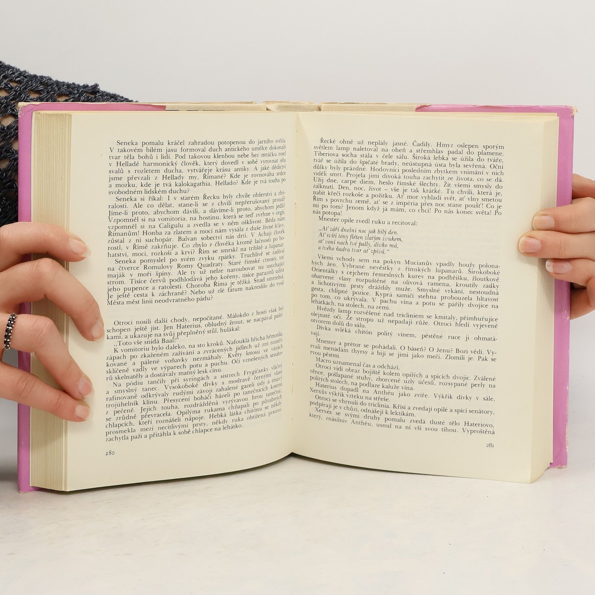 Román vypráví o Římě za vlády císařů Tiberia a Caliguly, o době, kdy Řím vládl ještě celému antickému světu, ale nebyl již schopen vládnout sám sobě. V bohatém dějovém pletivu defilují před námi oba krutí císařové a jejich oblíbenci, rozmařilá a hýřivá římská smetánka a její milostnice, zbabělí i nepoddajní senátoři, ale také filozof Seneka a římský lid, jehož mluvčím je herec Fabius. Všechny postavy románového děje jsou vylíčeny s dokonalou znalostí jejich psychologie, myšlení a cítění. Národní umělec Josef Toman nám předvedl minulost s takovým pochopením pro lidi, prostředí a dobovou atmosféru, že jeho dílo je více než jen historickým románem. Je i velikým estetickým zážitkem a hlubokou etikou podloženým poučením, jež může mnoho sdělit i dnešnímu čtenáři. (nakladatel; kráceno)