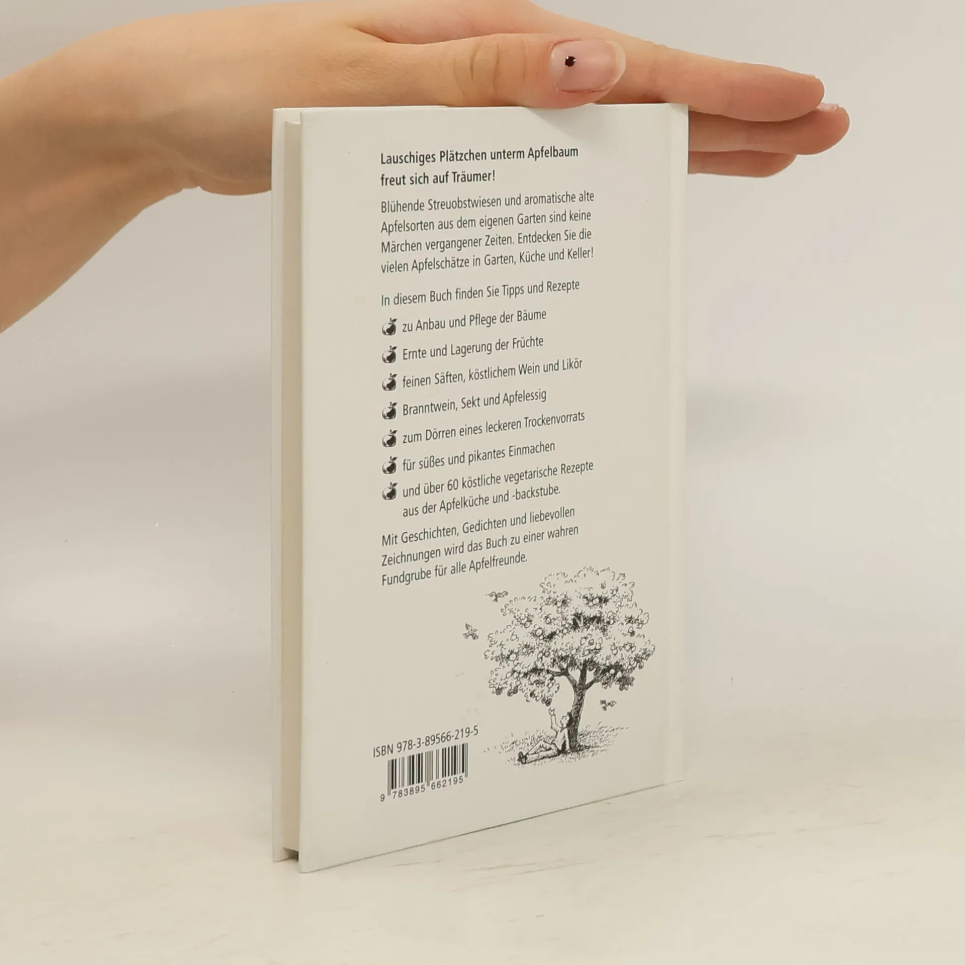 Das Buch bietet viele praktische Informationen rund um den Apfel. Die Autoren geben Tipps zu Anbau, Ernte und Lagerung. Sie erklären, wie aus Äpfeln feiner Saft, Wein und Likör, Branntwein, Sekt oder Essig wird. Weitere Themen sind das süße und pikante Einmachen und das Dörren von Äpfeln. Über 60 vegetarische Rezepte sorgen dafür, dass in der Apfelküche und –backstube keine Langeweile aufkommt. Mit Geschichten, Gedichten und liebevollen Zeichnungen wird das Buch zu einer wahren Fundgrube für alle Apfelfreunde.