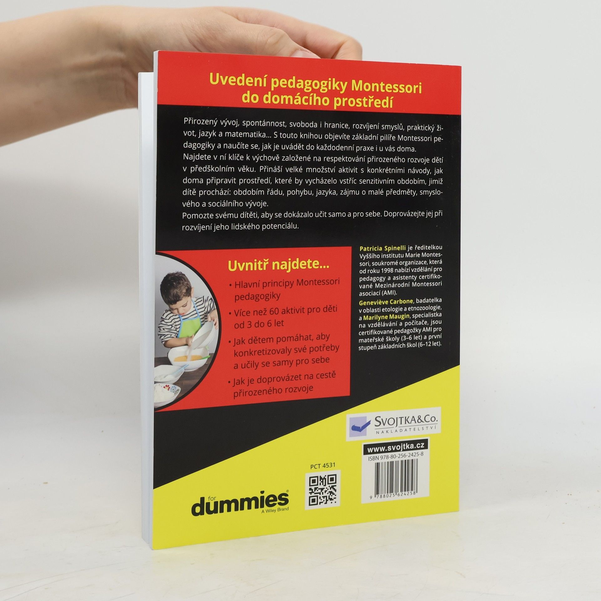 Objevte, jaký potenciál se skrývá ve vašem dítěti v předškolním věku. Tato kniha vám bude spolehlivým průvodcem po aktivitách, jež lze s malými dětmi podnikat. Objevte, co vše dokáže dítě mezi 3. a 6. rokem samostatně utvářet. Aktivity v knize sledují 2 linie: vytváření prostředí, které bude ze sociálního a materiálního hlediska odpovídat dětským potřebám; a příprava inteligentních a zábavných aktivit, které budou myšlení a kreativitu dítěte rozvíjet. Kniha se zaměřuje na čas, který rodiče sdílí s dětmi. Co dělat společně každý den, po návratu ze školky, odpoledne, o víkendech nebo na dovolených? Když dítě chodí do školky, stávají se z rodinného života poklady, ze kterých bude čerpat sebedůvěru. Navrhovaný přístup vede k tomu vidět v pohybujícím se dítěti myslící bytost, jejíž akce slouží k procvičování ruky i myšlení. Jak vést dítě k samostatnosti? Jde o víc než naučit dítě navléknout si kabát nebo vybarvovat bez přetahování. Ve věku od 3 do 6 let se jeho myšlení utváří právě skrze samostatný pohyb. Tato kniha se obrací k rodičům dětí, které čeká vstup do školy, už chodí do školky Montessori nebo jiné. Kniha je zajímavá také pro ty, kdo tráví čas s dítětem pouze v rámci rodiny.
