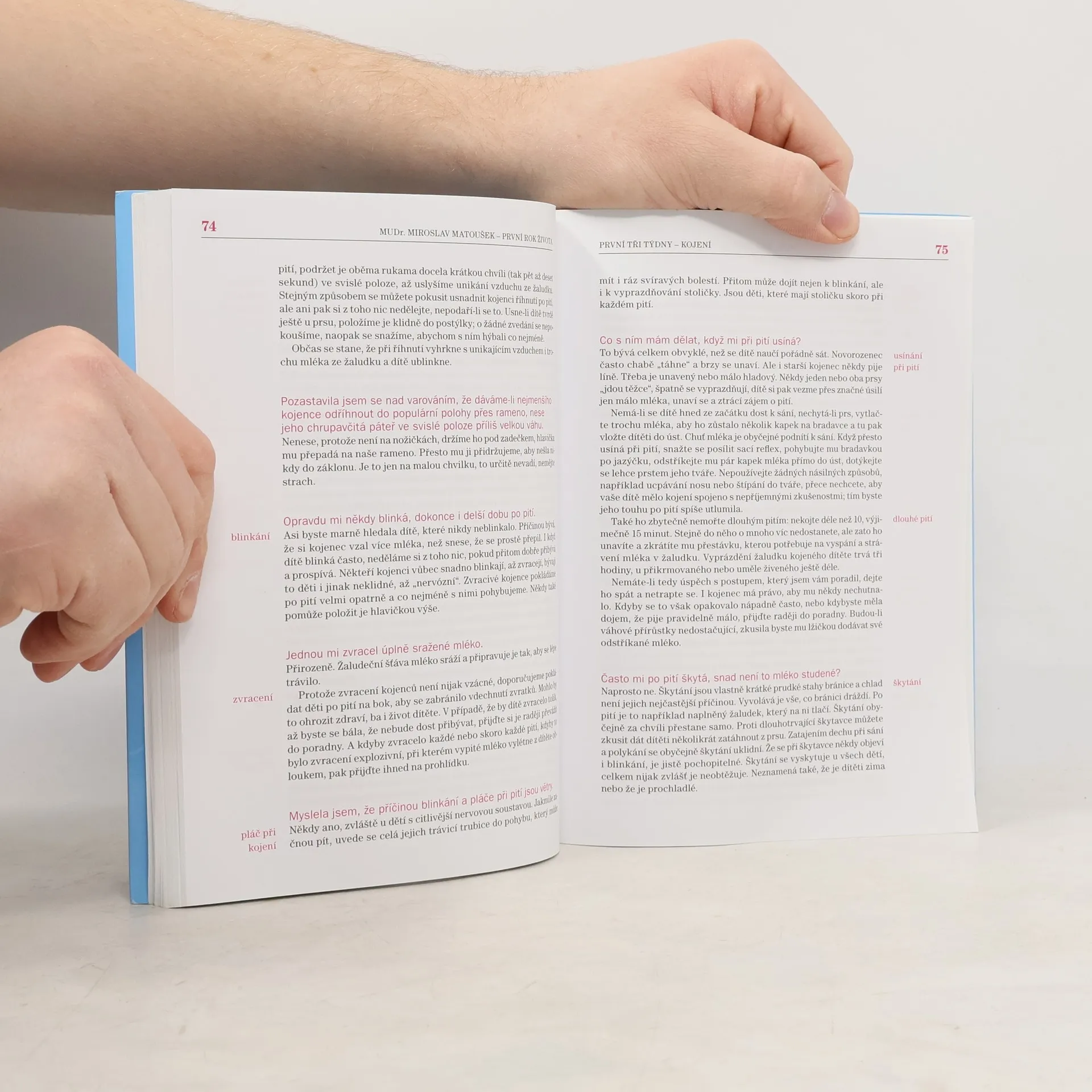 Na český knižní trh se dostala nová velmi praktická knížka od českého autora, která formou otázek matky a odpovědí dětského lékaře instruktivně seznamuje s péčí o kojence od prvních dnů až do jednoho roku, od zdánlivých banalit až po první pomoc a náhlých stavů malých dětí. Kniha Miroslava Matouška – „První rok života“ aneb průvodce inteligentní ženy po prvním roce jejího dítěte, se snaží jak novopečeným matkám tak i celému okolí jasně a přehledně přiblížit, co se s miminkem odehrává, jak se zachovat ve zdánlivě nových a překvapivých situacích i na co si během denních rituálů dát pozor. Text přehledně uspořádaný podle stáří novorozence a rozčleněn formou otázek a odpovědí vychází z téměř padesátileté praxe MUDr. Miroslava Matouška a MUDr. Hany Málkové. Praxe autorů tak zaručuje nejen informace relevantní v kontextu českých reálií i pediatrických postupů, ale i fakt, že metody v textu navrhované jen slepě nekopírují módní trendy, které přicházejí stejně rychle jako jsou vyvraceny.
