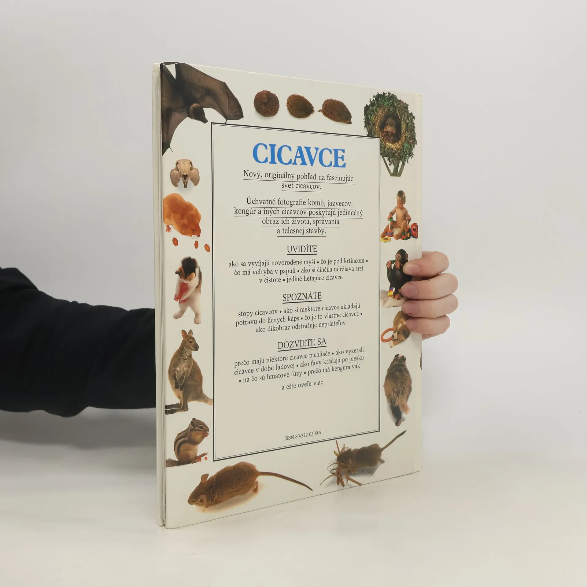 Nový, originálny pohľad na fascinujúci svet cicavcov. Úchvatné fotografie komb, jazvecov, kengúr a iných cicavcov poskytujú jedinečný obraz ich života, správania a telesnej stavby. Kapitoly: Svet cicavcov, Klasifikácia cicavcov, Vývoj cicavcov, Ďalší rozvoj cicavcov, Zmysly cicavcov, Lietajúce cicavce, Kožuchy, Maskovanie, Pichľavý kožuch, Spôsoby obrany, Na čo je chvost ?, Predčasný pôrod, Rýchle rozmnožovanie, Pôrod, Jedinečné pre cicavce, Rast, Hra života, Čistota, Potrava, Trháky a žuvacie zuby, Zásoba potravy, Domov v hniezde, Život v podzemí, Prsty cicavcov, Stopy cicavcov, Pátranie po cicavcoch.