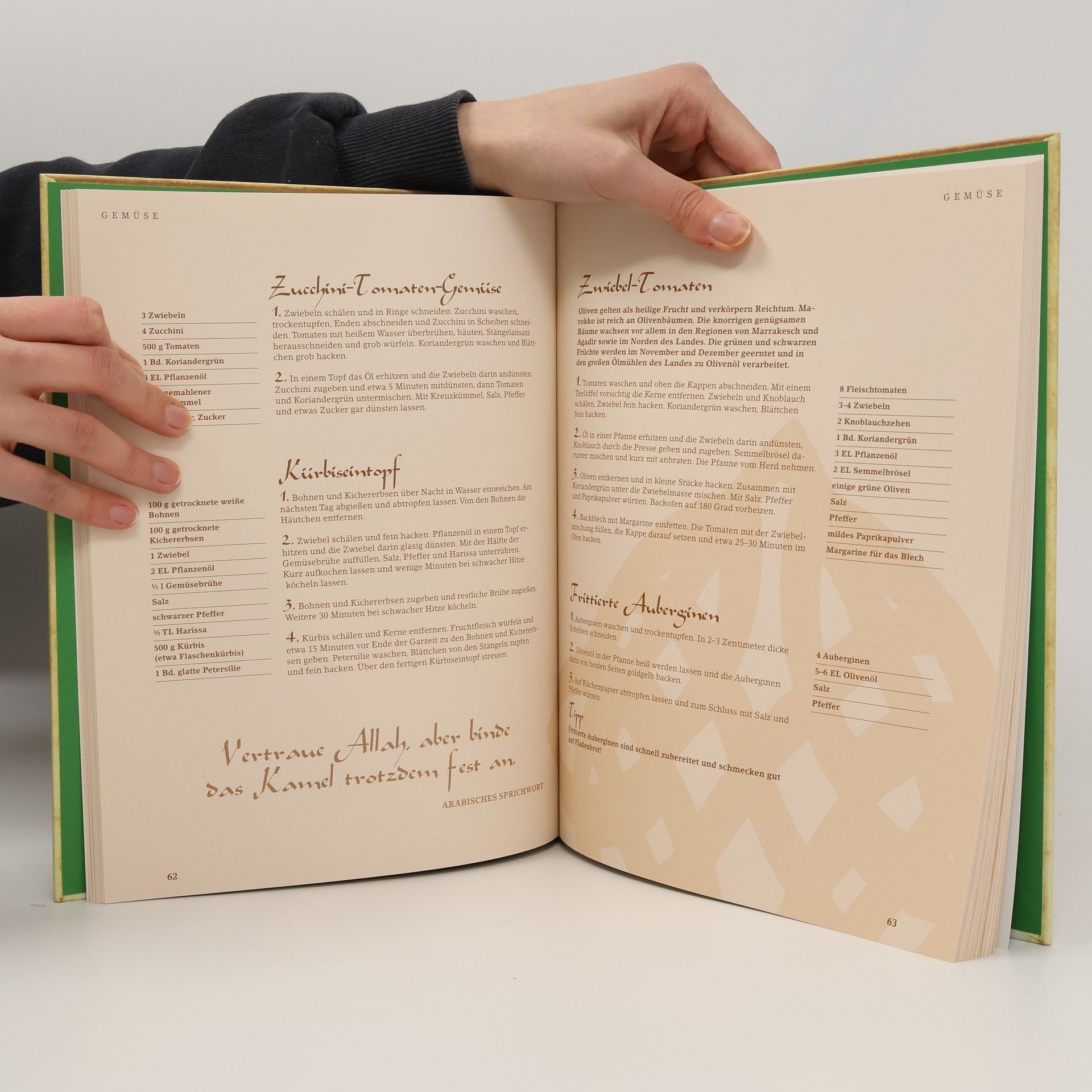 Der aufregende Geschmack erlesener Gewürze und Kräuter, köstliche Gerichte mit frischem Fisch, zartem Fleisch und knackigem Gemüse, Desserts mit Orangenblüten- oder Rosenwasser verfeinert: Über 120 landestypische, erprobte Rezepte schmeicheln dem Gaumen und betören die Sinne.