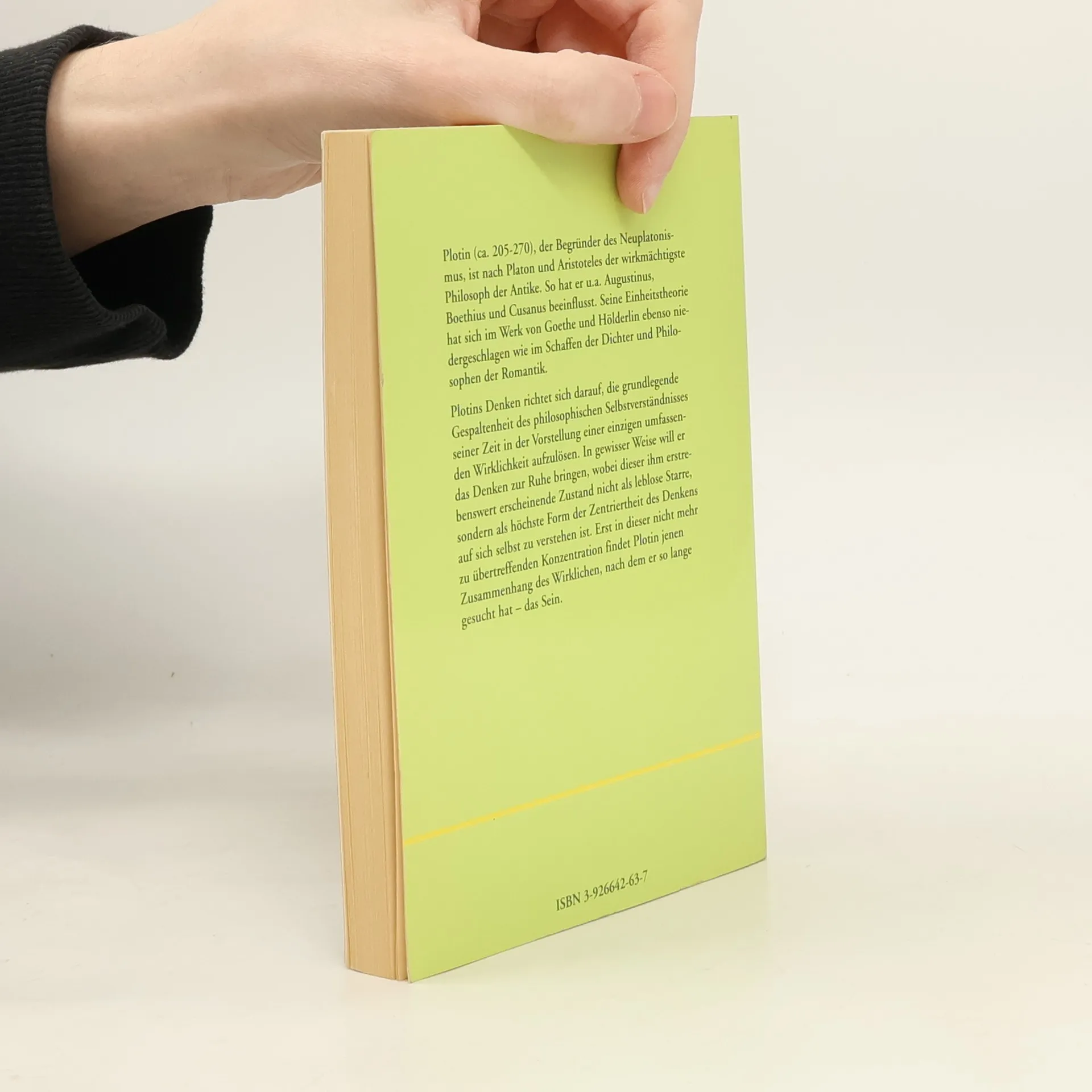 Plotin, der Begründer des Neuplatonismus, ist nach Platon und Aristoteles der bedeutendste Philosoph der Antike. Ausgangspunkt seiner Lehre ist das All-Eine, das Urgute, aus dem alle weiteren Erscheinungsformen hervorgehen. Seine Einheitstheorie hat u. a. Augustinus und Cusanus beeinflusst und sich im Werk von Goethe und Hölderlin ebenso niedergeschlagen, wie im Schaffen der großen Dichter und Philosophen der Romantik.