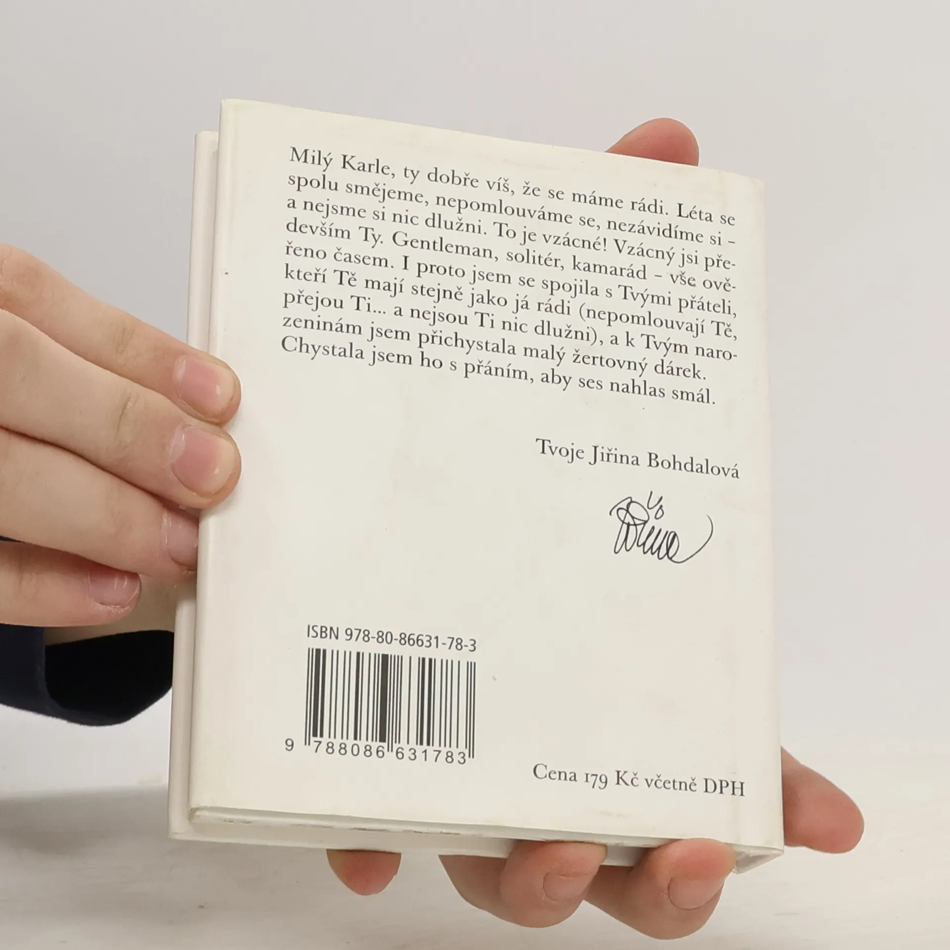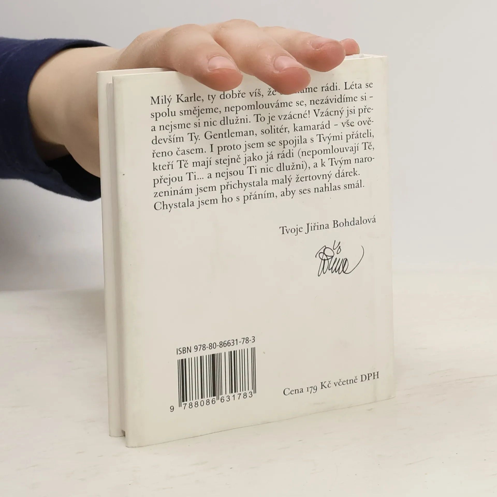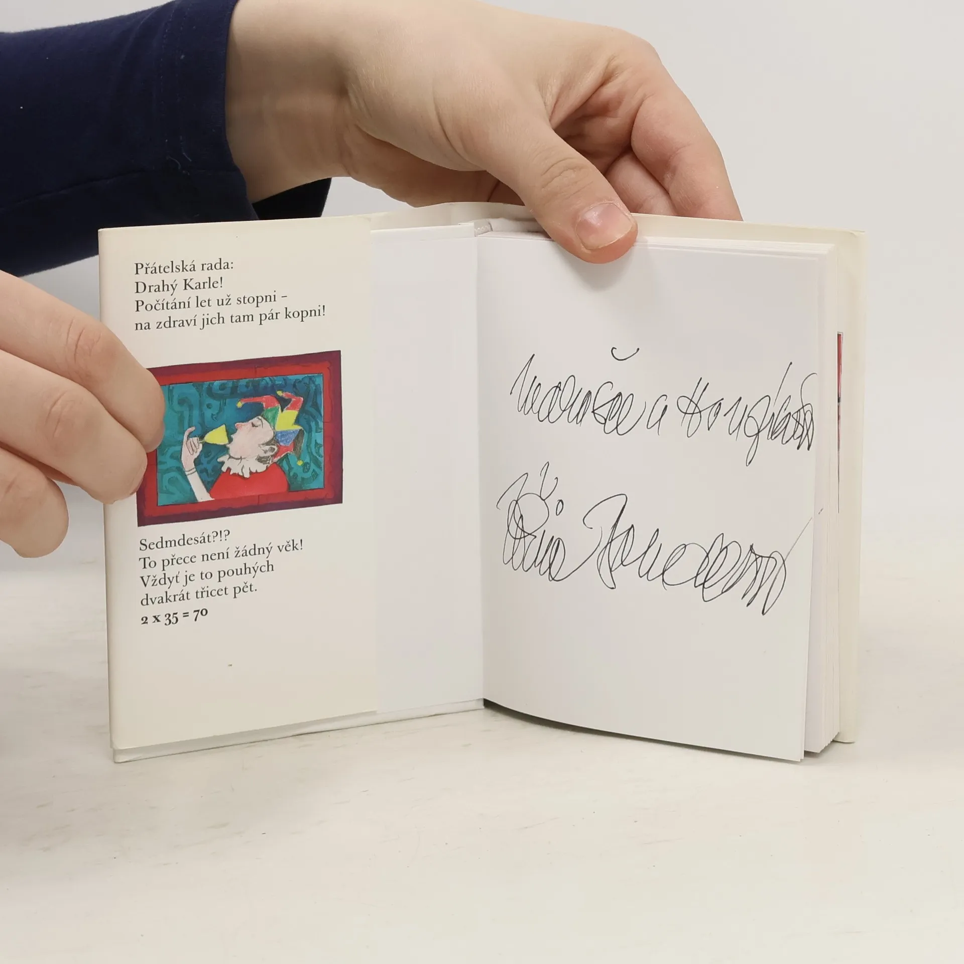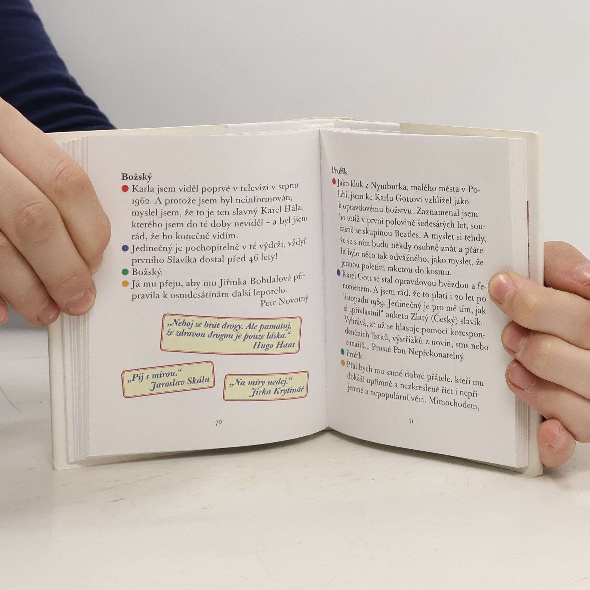 balíček legrace pro sedmdesátníka Karla Gotta z pera Jiřiny Bohdalové a Slávky Kopecké (ilustrace Pavel Skalník) s přispěním mnoha osobních přátel Mistra. Milý Karle, ty dobře víš, že se máme rádi. Léta se spolu smějeme, nepomlouváme se, nezávidíme si a nejsme si nic dlužni. To je vzácné! Vzácný jsi především Ty. Gentleman, solitér, kamarád vše ověřeno časem. I proto jsem se spojila s Tvými přáteli, kteří Tě mají stejně jako já rádi (nepomlouvají Tě, přejou Ti a nejsou Ti nic dlužni) a k Tvým narozeninám jsem přichystala malý žertovný dárek. Chystala jsem ho s přáním, aby ses nahlas smál. Říct Ti to musím: moc ráda Tě poslouchám, ale nade vše miluju chvíle, kdy se tak trochu zakloníš a pak řveš smíchy.