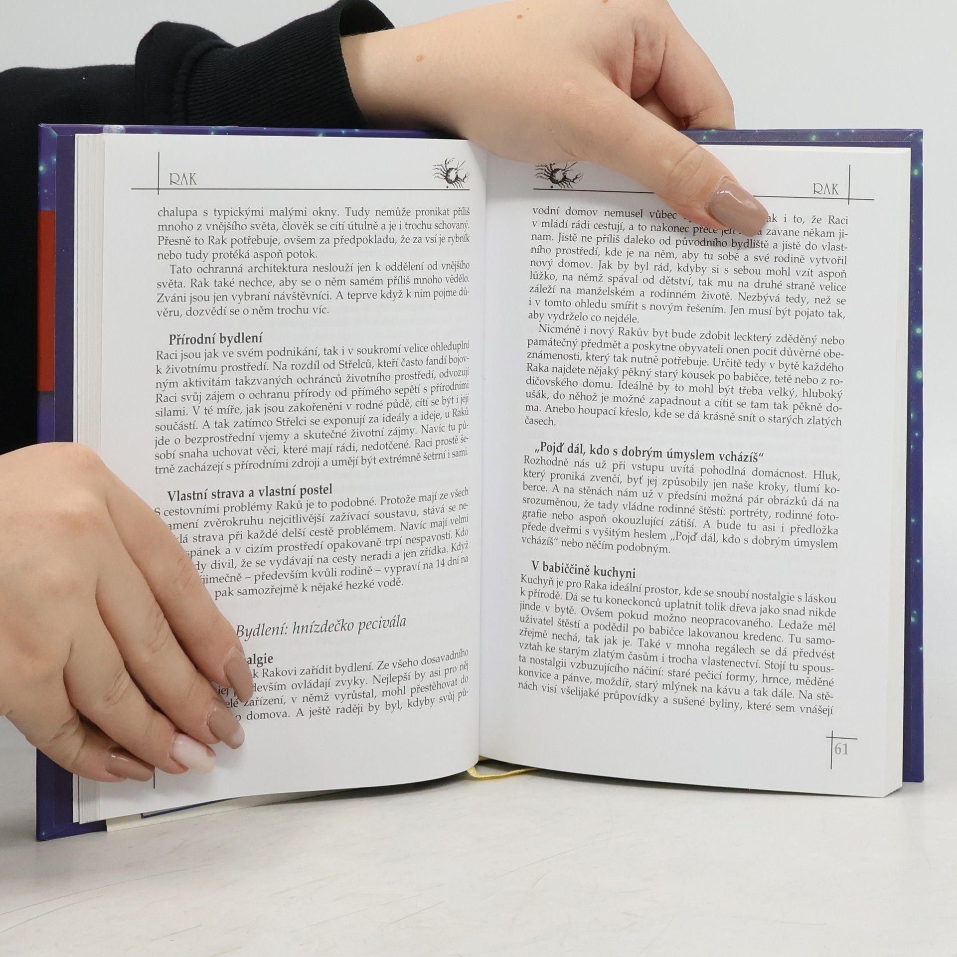 Astrologický místopis, který vám odhalí z hvězdné perspektivy, proč ten člověk dělá nebo upřednostňuje to a ten zase tohle, a získáte tak solidní a vtipnou sondu do nitra lidské povahy. Víte, jaké prostředí si zvolí pro svou dovolenou Štír? Nebo jak si zařídí pokoj Lev? A proč si Raci nejraději vybírají bydlení u vody a u lesa co nejblíže k přírodě? Na to zná odpovědi knížka Gerdy Rogersové. Ale poskytne i něco navíc: solidní a vtipně napsanou sondu do nitra lidské povahy. Dozvíme se, proč pro některé lidi platí, že nejdříve je povinnost a pak zábava, proč zase pro některé pořádek není tou nejdůležitější věcí na světě nebo proč je pro někoho krásně upravený stůl větším potěšením než obsah talíře. Autorka zkoumá z hvězdné perspektivy, proč ten má rád to a ten zas tohle a z jejího zkoumání si můžeme ledacos vzít k srdci a obohatit nejen své okolí, ale i sebe.