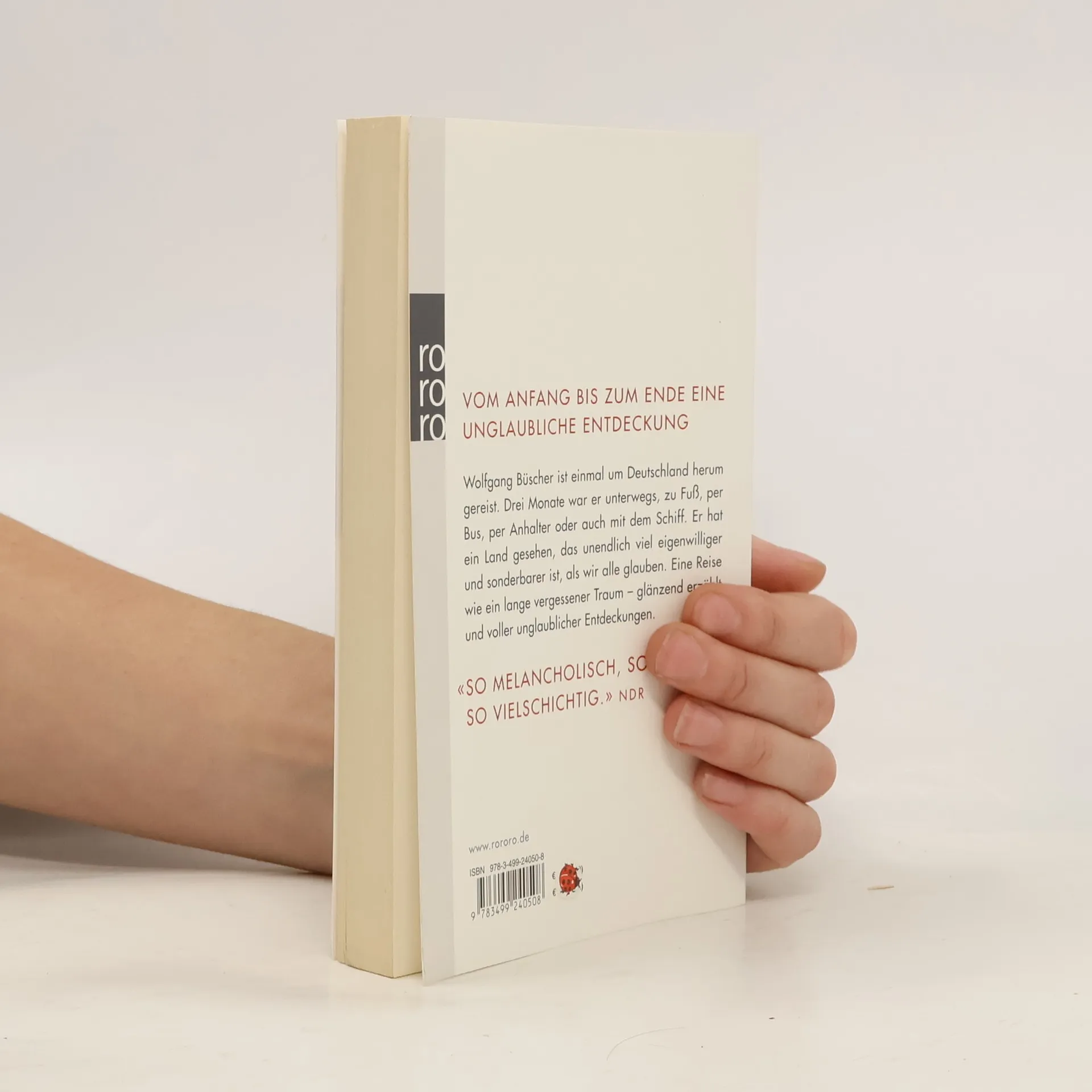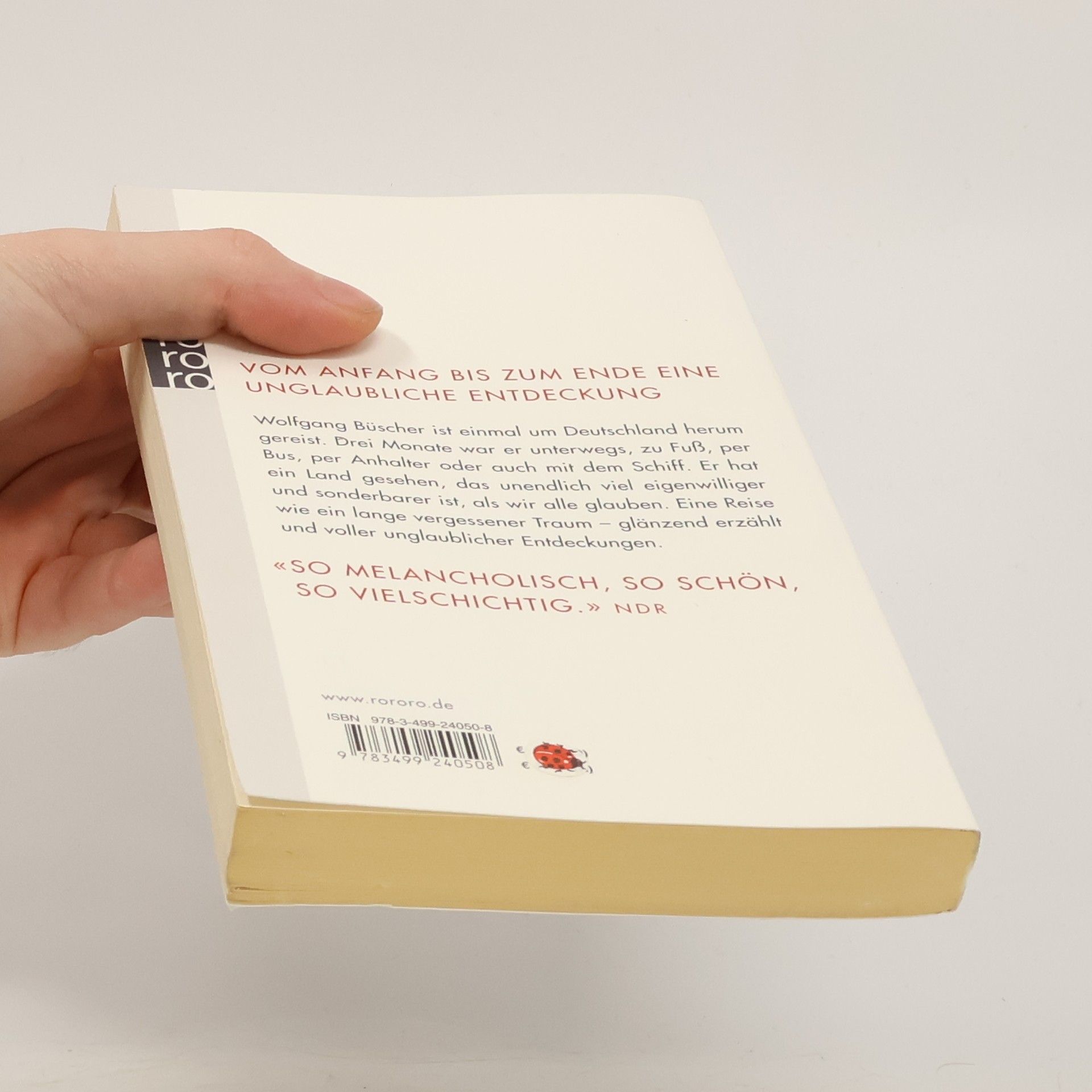 Vom Anfang bis zum Ende eine unglaubliche EntdeckungWolfgang Büscher ist einmal um Deutschland herum gereist. Drei Monate war er unterwegs, zu Fuß, per Bus, per Anhalter oder auch mit dem Schiff. Er hat ein Land gesehen, das unendlich viel eigenwilliger und sonderbarer ist, als wir alle glauben. Eine Reise wie ein lange vergessener Traum – glänzend erzählt und voller unglaublicher Entdeckungen.«So melancholisch, so schön, so vielschichtig.» (NDR)