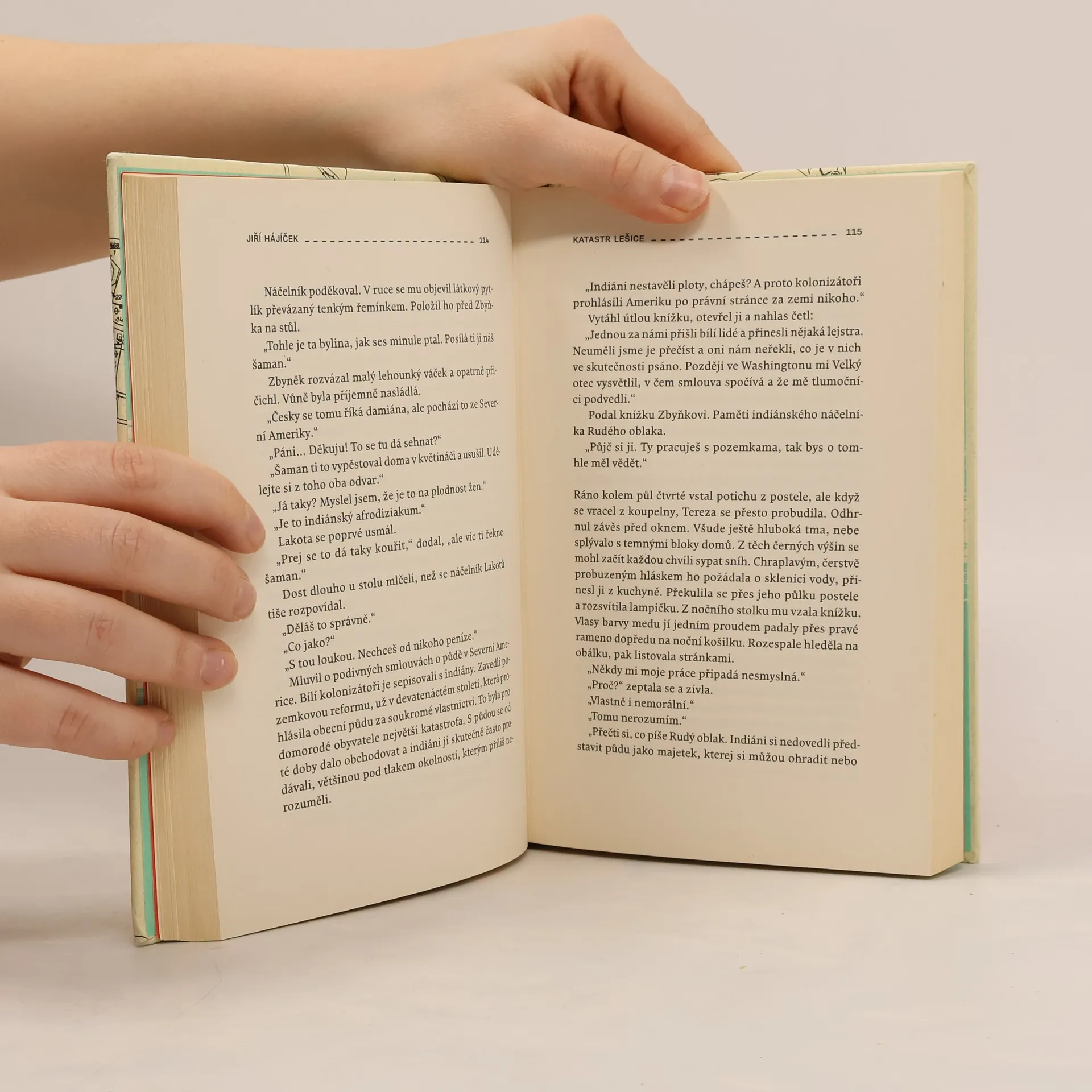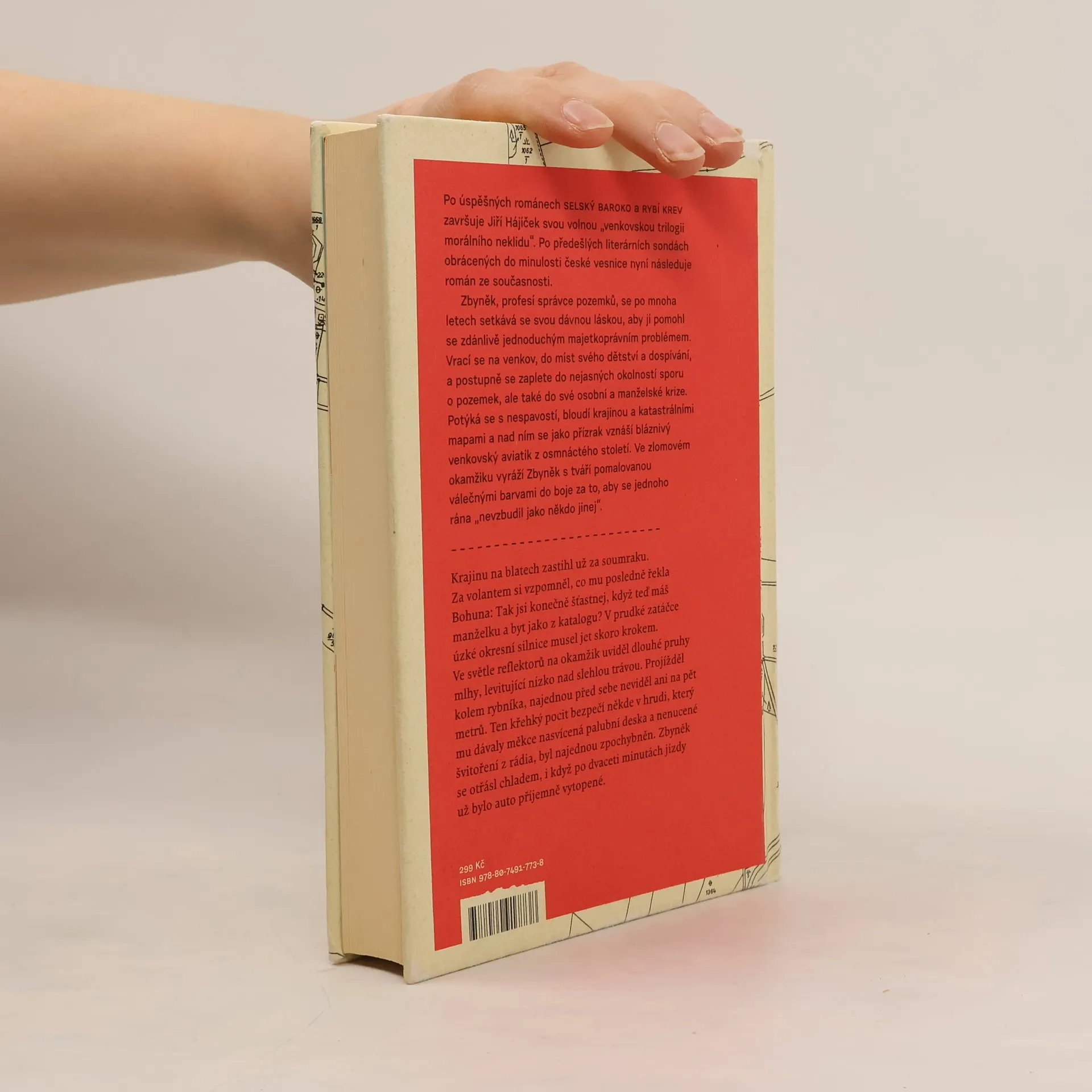Po úspěšných románech Selský baroko a Rybí krev završuje Jiří Hájíček svou volnou „venkovskou trilogii morálního neklidu“. Předešlé literární sondy obrácené do minulosti české vesnice následuje nyní román ze současnosti. Opět silný příběh, v němž kromě lidí tentokrát hrají důležitou roli pozemky — zděděná pole a spory kolem jejich vlastnictví. Venkovská krajina jihočeských blat je vůbec v textu silně přítomna a kromě jedinečné atmosféry dodává příběhu i historický kontext a také nepřímo vstupuje do osudů hlavních postav. Zbyněk, profesí správce pozemků, se po mnoha letech setkává se svou dávnou láskou, aby jí pomohl se zdánlivě jednoduchým majetkoprávním problémem. Vrací se na venkov, na místa svého dětství a dospívání, a zamotává se do nejasných okolností pozemkového sporu, ale také do osobní a manželské krize. Potýká se s nespavostí, bloudí krajinou a katastrálními mapami a nad ním se jako přízrak vznáší bláznivý venkovský aviatik z osmnáctého století. Ve zlomovém okamžiku jde Zbyněk s tváří pomalovanou válečnými barvami do boje. Za to, co považuje za správné, za sny dětství a „aby se jednoho rána neprobudil jako někdo jiný“.