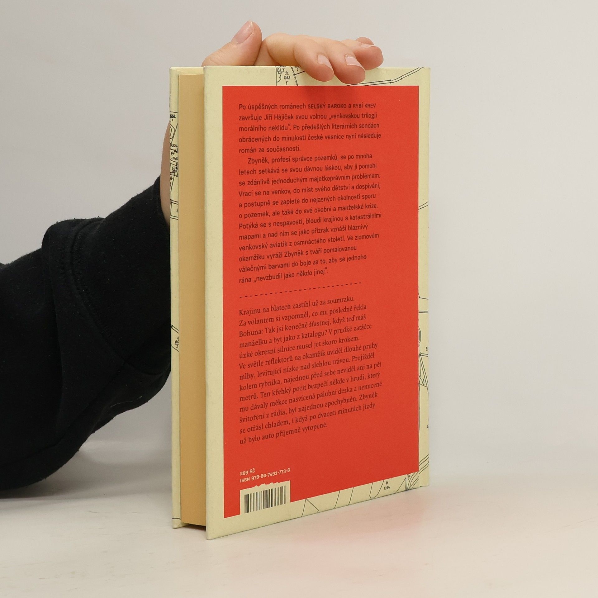 Po úspěšných románech Selský baroko a Rybí krev završuje Jiří Hájíček svou volnou „venkovskou trilogii morálního neklidu“. Předešlé literární sondy obrácené do minulosti české vesnice následuje nyní román ze současnosti. Opět silný příběh, v němž kromě lidí tentokrát hrají důležitou roli pozemky — zděděná pole a spory kolem jejich vlastnictví. Venkovská krajina jihočeských blat je vůbec v textu silně přítomna a kromě jedinečné atmosféry dodává příběhu i historický kontext a také nepřímo vstupuje do osudů hlavních postav. Zbyněk, profesí správce pozemků, se po mnoha letech setkává se svou dávnou láskou, aby jí pomohl se zdánlivě jednoduchým majetkoprávním problémem. Vrací se na venkov, na místa svého dětství a dospívání, a zamotává se do nejasných okolností pozemkového sporu, ale také do osobní a manželské krize. Potýká se s nespavostí, bloudí krajinou a katastrálními mapami a nad ním se jako přízrak vznáší bláznivý venkovský aviatik z osmnáctého století. Ve zlomovém okamžiku jde Zbyněk s tváří pomalovanou válečnými barvami do boje. Za to, co považuje za správné, za sny dětství a „aby se jednoho rána neprobudil jako někdo jiný“.
