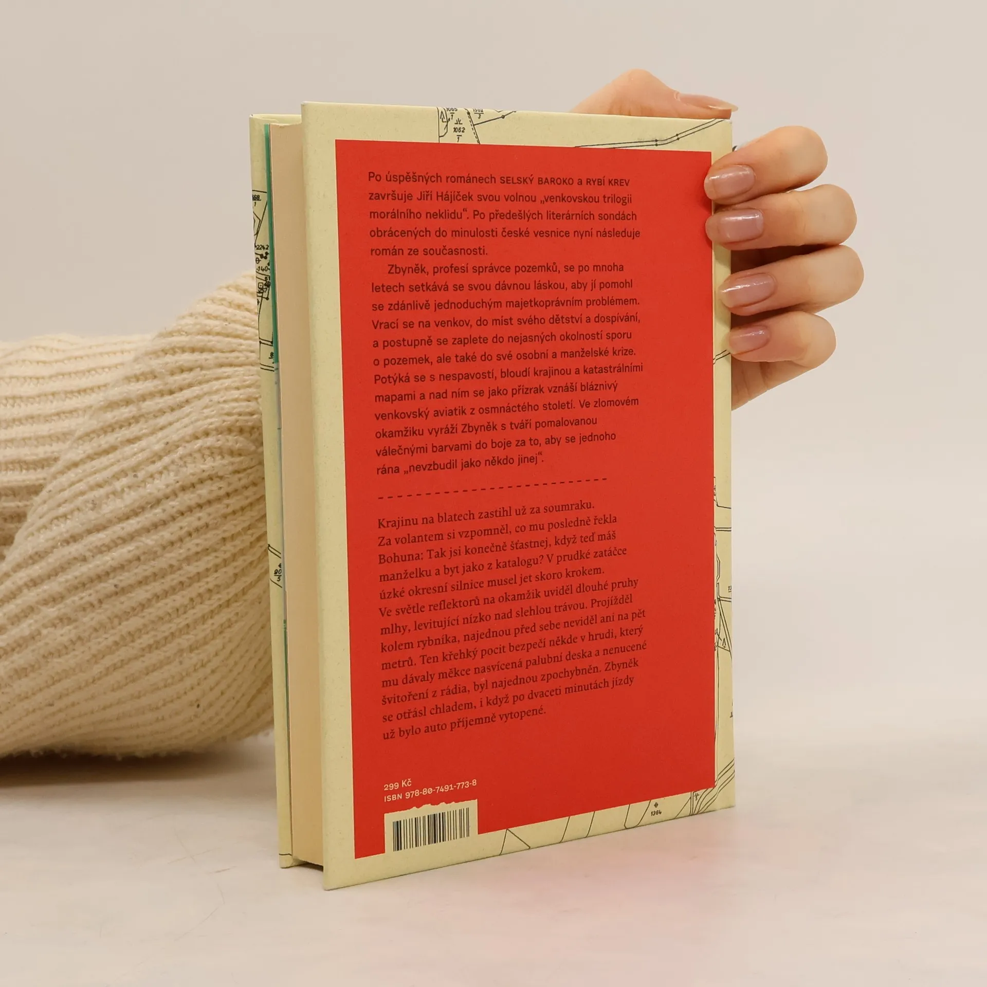 Po úspěšných románech Selský baroko a Rybí krev završuje Jiří Hájíček svou volnou „venkovskou trilogii morálního neklidu“. Předešlé literární sondy obrácené do minulosti české vesnice následuje nyní román ze současnosti. Opět silný příběh, v němž kromě lidí tentokrát hrají důležitou roli pozemky — zděděná pole a spory kolem jejich vlastnictví. Venkovská krajina jihočeských blat je vůbec v textu silně přítomna a kromě jedinečné atmosféry dodává příběhu i historický kontext a také nepřímo vstupuje do osudů hlavních postav. Zbyněk, profesí správce pozemků, se po mnoha letech setkává se svou dávnou láskou, aby jí pomohl se zdánlivě jednoduchým majetkoprávním problémem. Vrací se na venkov, na místa svého dětství a dospívání, a zamotává se do nejasných okolností pozemkového sporu, ale také do osobní a manželské krize. Potýká se s nespavostí, bloudí krajinou a katastrálními mapami a nad ním se jako přízrak vznáší bláznivý venkovský aviatik z osmnáctého století. Ve zlomovém okamžiku jde Zbyněk s tváří pomalovanou válečnými barvami do boje. Za to, co považuje za správné, za sny dětství a „aby se jednoho rána neprobudil jako někdo jiný“.