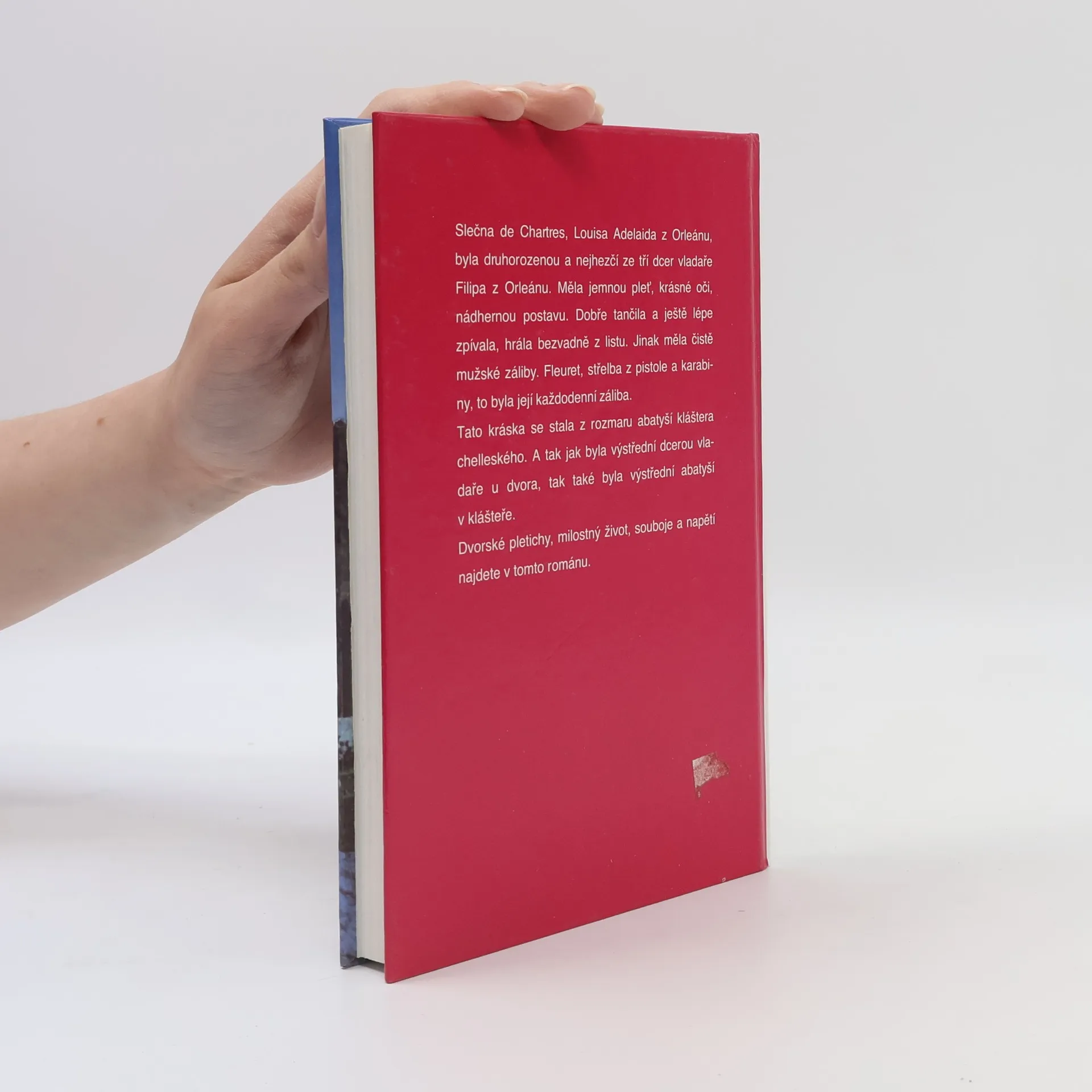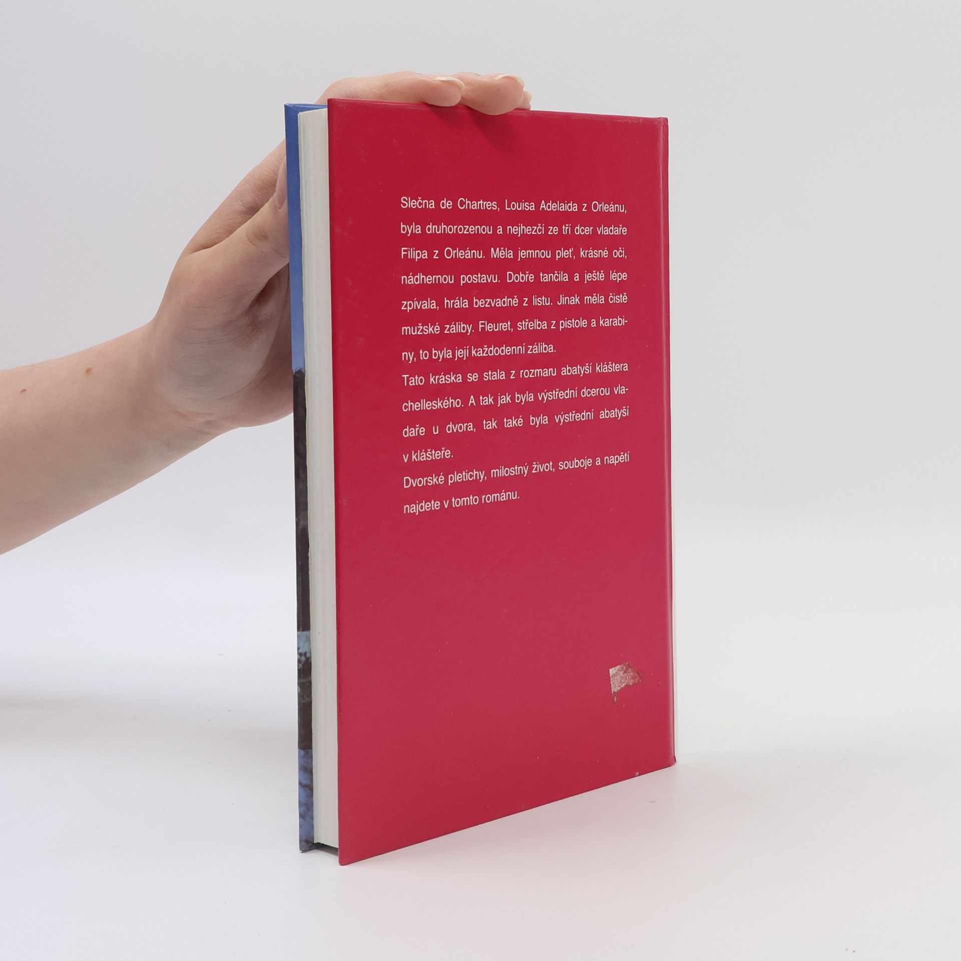 Slečna de Chartres, Louisa Adelaida z Orleánu, byla druhorozenou a nejhezčí ze tří dcer vladaře Filipa z Orleánu. Měla jemnou pleť, krásné oči, nádhernou postavu. Dobře tančila a ještě lépe zpívala, hrála bezvadně z listu. Jinak měla čistě mužské záliby. Fleuret, střelba z pistole a karabiny, to byla její každodenní záliba. Tato kráska se stala z rozmaru abatyší kláštera chelleského. A tak jak byla výstřední dcerou vladaře u dvora, tak také byla výstřední abatyší v klášteře. Dvorské pletichy, milostný život, souboje a napětí najdete v tomto románu.