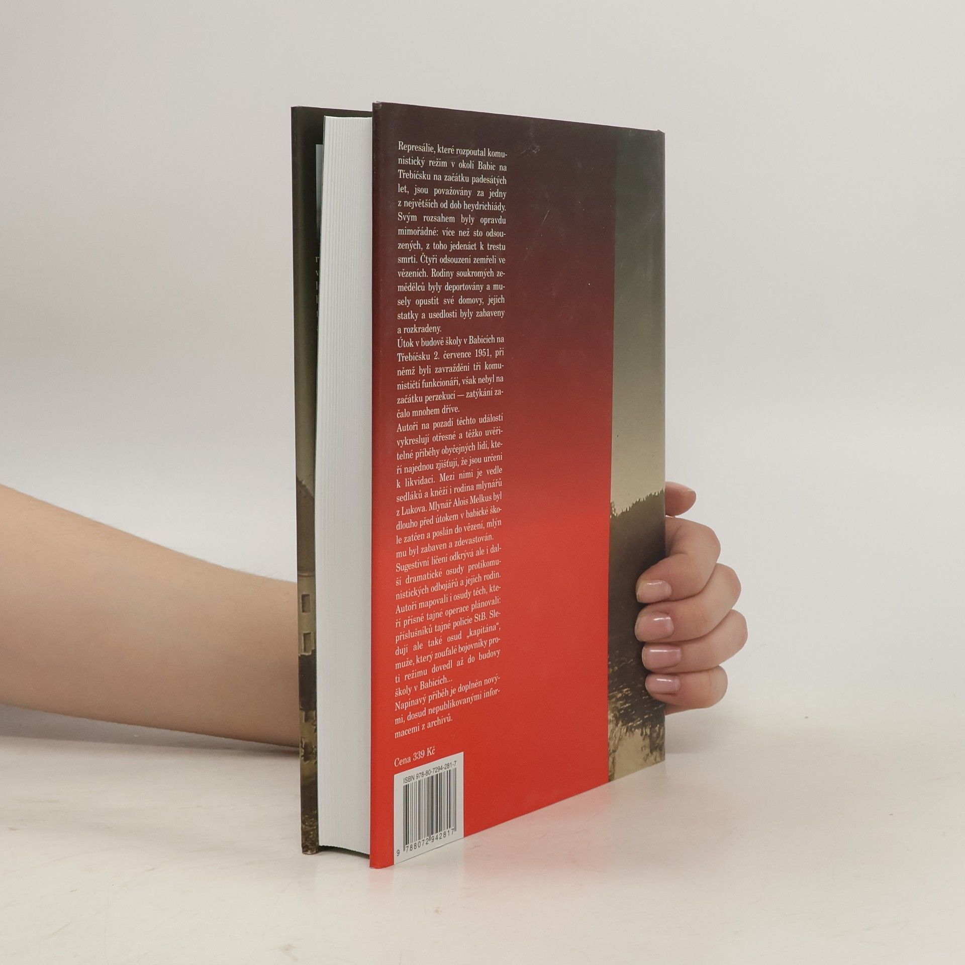 Nová fakta o osudovém dramatu padesátých let. Represálie, které rozpoutal komunistický režim v okolí Babic na Třebíčsku na začátku padesátých let, jsou považovány za jedny z největších od dob heydrichiády. Svým rozsahem byly opravdu mimořádné: více než sto odsouzených, z toho jedenáct k trestu smrti. Čtyři odsouzení zemřeli ve vězeních. Rodiny soukromých zemědělců byly deportovány a musely opustit své domovy, jejich statky a usedlosti byly zabaveny a rozkradeny. Útok v budově školy v Babicích na Třebíčsku 2. července 1951, při němž byli zavražděni tři komunističtí funkcionáři, však nebyl na začátku perzekucí - zatýkání začalo mnohem dříve. Autoři na pozadí těchto událostí vykreslují otřesné a těžko uvěřitelné příběhy obyčejných lidí, kteří najednou zjišťují, že jsou určeni k likvidaci. Mezi nimi je vedle sedláků a kněží i rodina mlynářů z Lukova. Mlynář Alois Melkus byl dlouho před útokem v babické škole zatčen a poslán do vězení, mlýn mu byl zabaven a zdevastován. Sugestivní líčení odkrývá ale i další dramatické osudy protikomunistických odbojářů a jejich rodin. Autoři mapovali i osudy těch, kteří přísně tajné operace plánovali: příslušníků tajné policie StB. Sledují ale také osud „kapitána", muže, který zoufalé bojovníky proti režimu dovedl až do budovy školy v Babicích... Kniha je doplněna řadou fotografií a archivních materiálů, z nichž některé jsou uveřejněny poprvé.