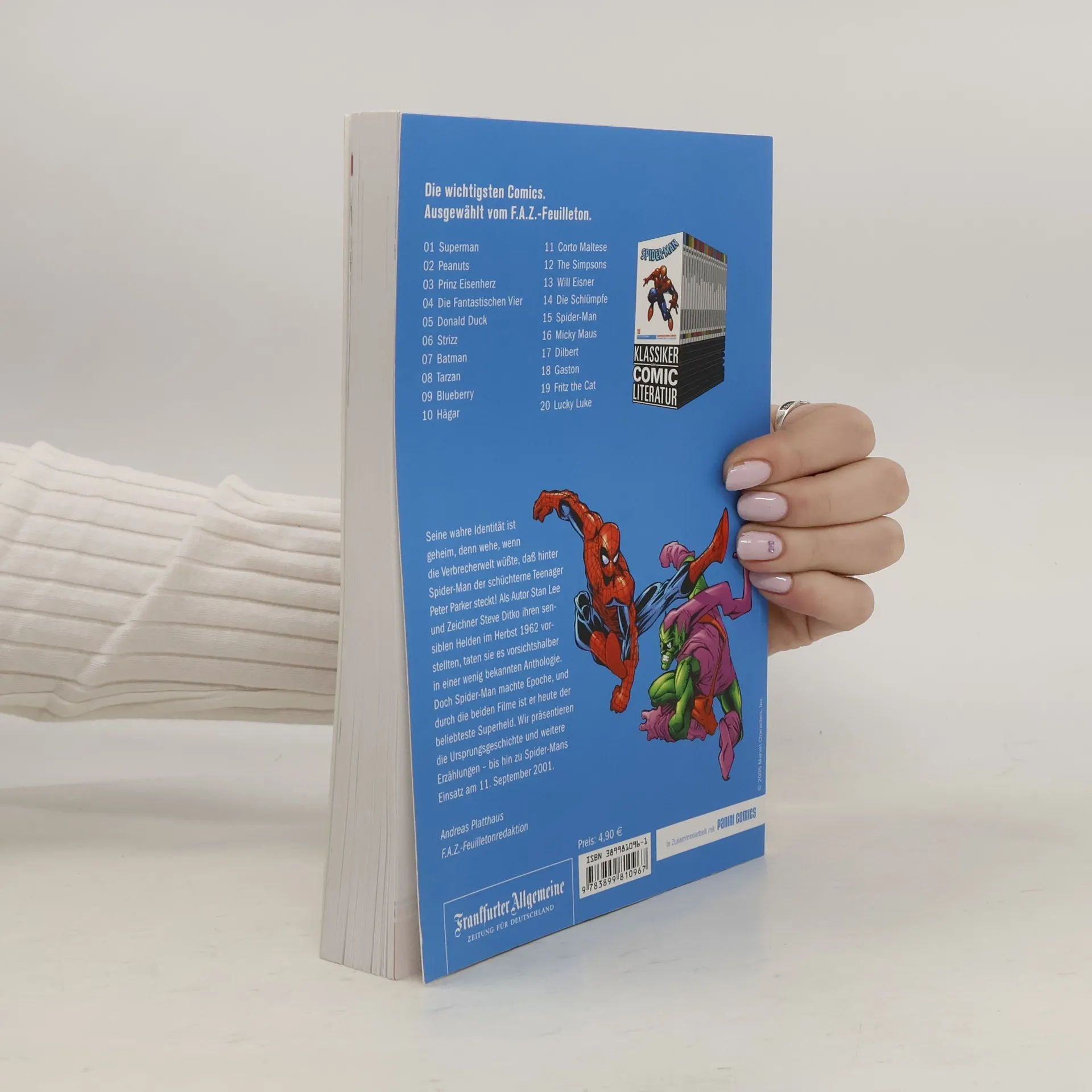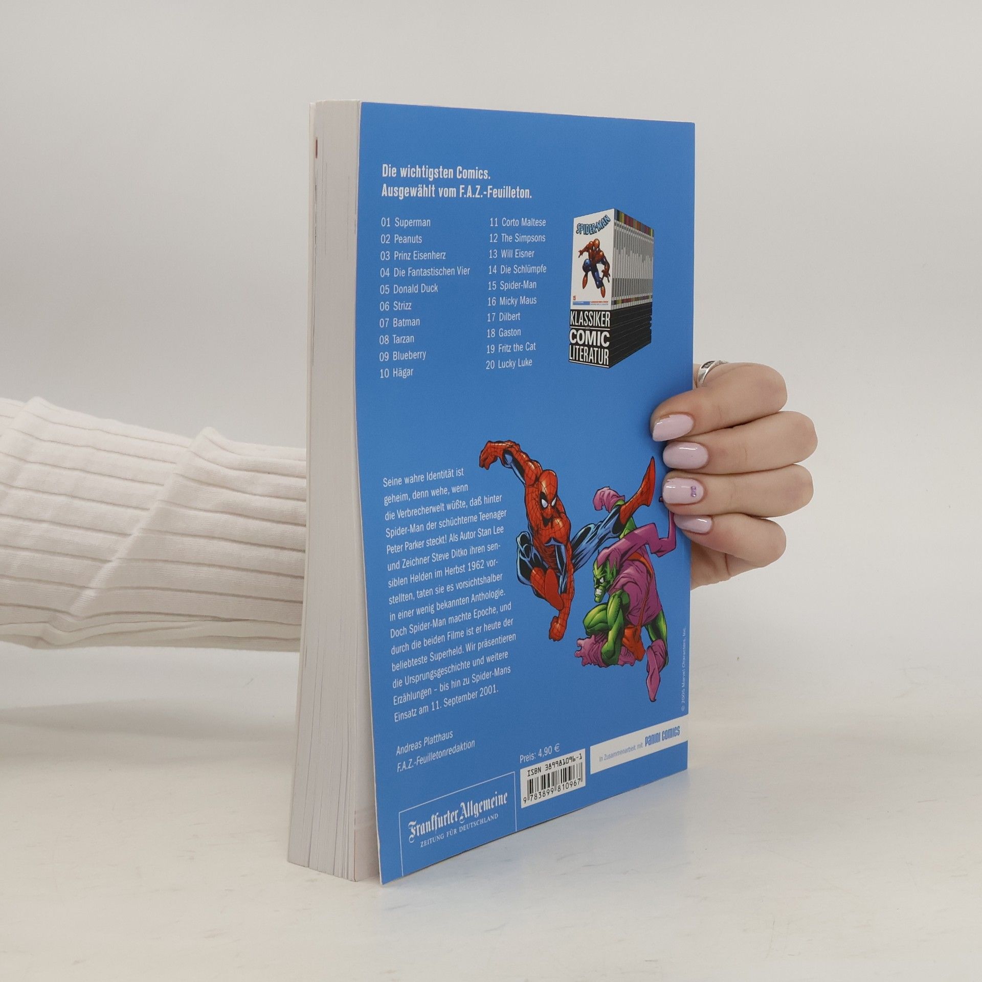 Seine wahre Identität ist geheim, denn wehe, wenn die Verbrecherwelt wüßte, daß hinter Spider-Man der schüchterne Teenager Peter Parker steckt. Als Autor Stan Lee und Zeichner Steve Ditko ihren sensiblen Helden 1963 vorstellten, taten sie es vorsichtshalber in einer abseitigen Anthologie. Doch Spider-Man machte Epoche, und durch die beiden Filme ist er heute der beliebteste Superheld. Wir präsentieren die Ursprungsgeschichte und weitere Erzählungen – bis hin zu Spider-Mans Einsatz am 11. September 2001.