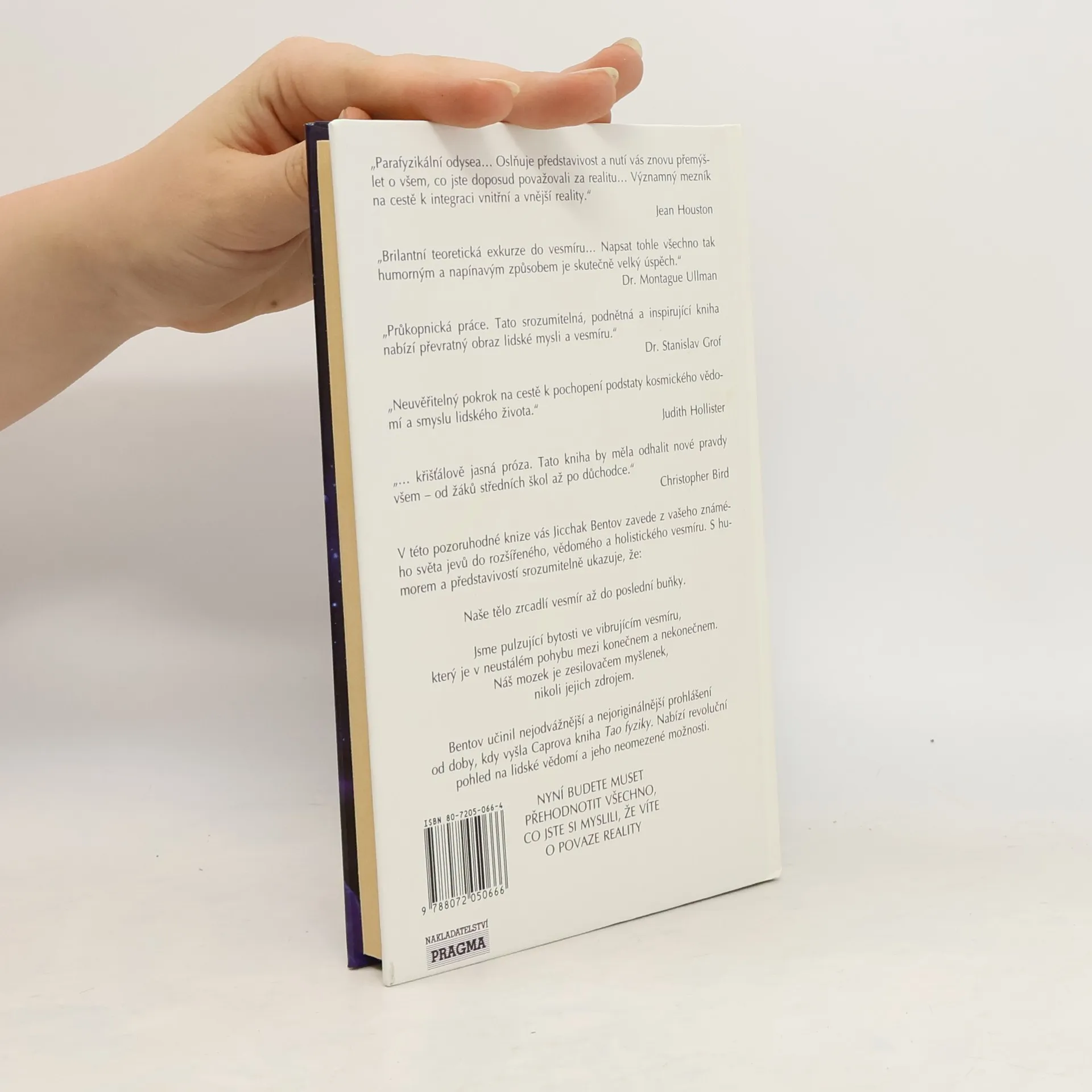 Náš názor na člověka, na vesmír a na naše vzájemné vztahy se radikálně změní. Naše představa o člověku již zaznamenává určité změny, začínáme zdůrazňovat lidskou jednotu a spojitost s vesmírem. Zdá se, že všechno je ve vzájemném vztahu se vším, a to nejen na čistě hmotné úrovni, ale na mnoha dalších úrovních; čím více pronikáme do těchto úrovní, tím více si uvědomujeme, že jsme integrální součástí jediné bytosti.Tato kniha je významným krokem vpřed, protože tuto skutečnost jasně vyjadřuje - a tím prohlubuje naše chápání budoucího vývoje. Jicchak Bentov nás v ní zavede z našeho známého světa jevů do rozšířeného, vědomého a holistického vesmíru.... celý text