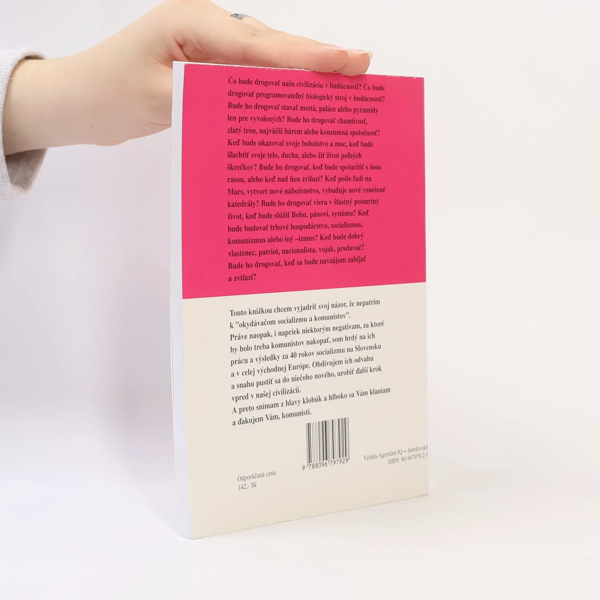 Čo bude drogovať našu civilizáciu v budúcnosti? Čo bude drogovať programovateľný biologický stroj v budúcnosti? Bude ho drogovať stavať mestá, paláce alebo pyramídy len pre vyvolených? Bude ho drogovať chamtivosť, zlatý trón, najväčší hárem alebo konzumná spoločnosť? Keď bude ukazovať svoje bohatstvo a moc, keď bude šľachtiť svoje telo, ducha, alebo žiť život poľných škrečkov? Bude ho drogovať, keď bude spolucítiť s inou rasou, alebo keď nad ňou zvíťazí? Keď pošle ľudí na Mars, vytvorí nové náboženstvo, vybuduje nové vznešené katedrály? Bude ho drogovať viera v šťastný posmrtný život, keď bude slúžiť Bohu, pánovi, systému? Keď bude budovať trhové hospodárstvo, socializmus, komunizmus alebo iný -izmus? Keď bude dobrý vlastenec, patriot, nacionalista, vojak, predavač? Bude ho drogovať, keď sa bude navzájom zabíjať a zvíťazí? Touto knižkou chcem vyjadriť svoj názor, že nepatrím k “okydávačom socializmu a komunistov”. Práve naopak, i napriek niektorým negatívam, za ktoré by bolo treba komunistov nakopať, som hrdý na ich prácu a výsledky za 40 rokov socializmu na Slovensku a v celej východnej Európe. Obdivujem ich odvahu a snahu pustiť sa do niečoho nového, urobiť ďalší krok vpred v našej civilizácii. A preto snímam z hlavy klobúk a hlboko sa Vám klaniam a ďakujem Vám, komunisti.