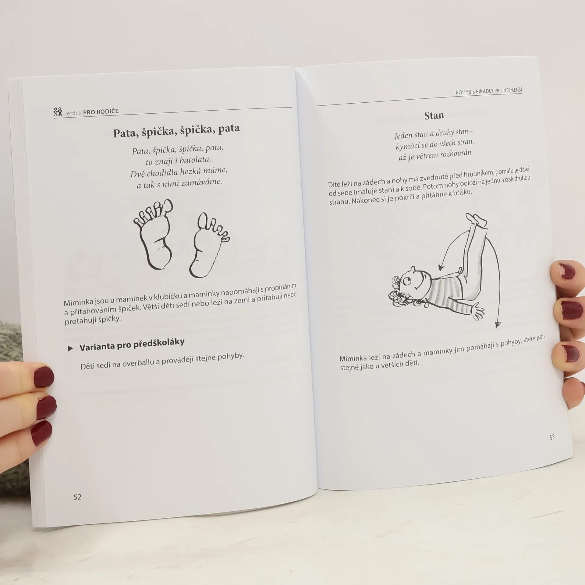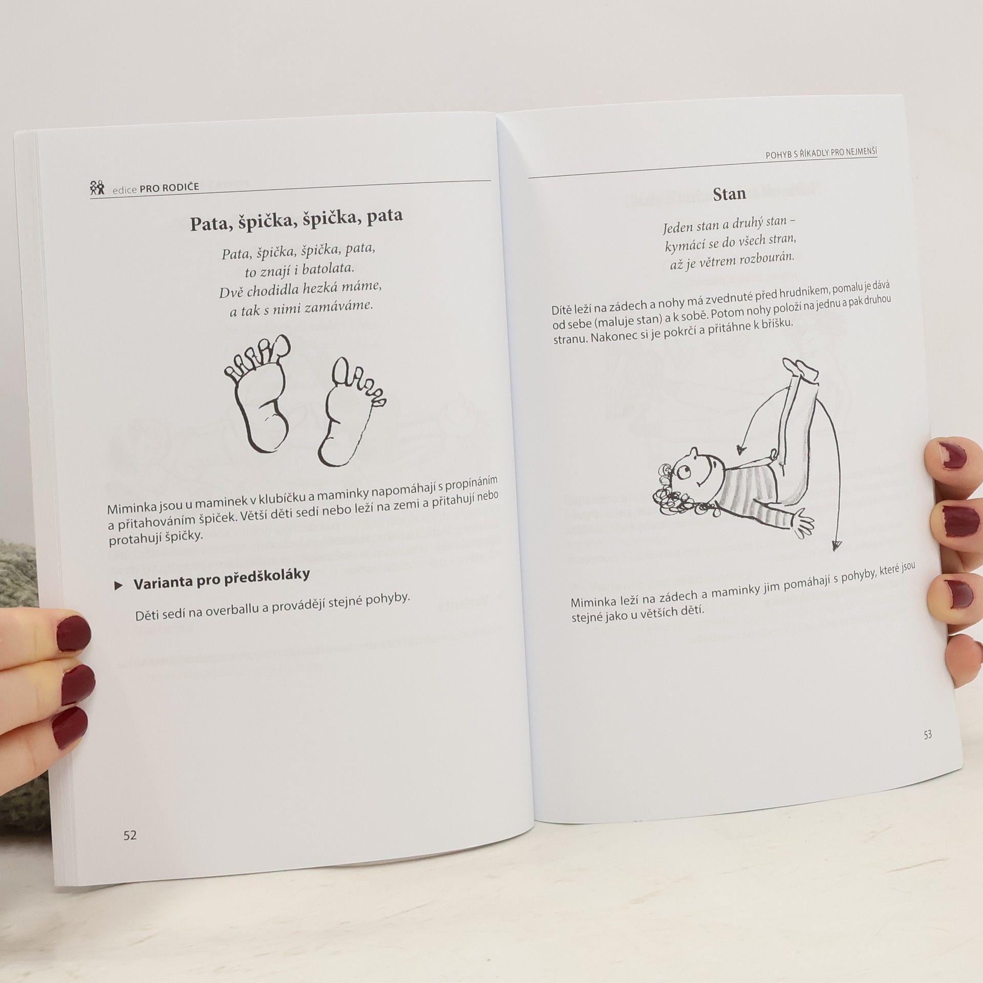 Již v prenatálním období můžeme u dětí pozorovat pohybové aktivity, které se po narození dále rozvíjejí. Přinášíme vám proto knihu plnou námětů, říkanek a praktických ukázek, jak vést své ratolesti zajímavou formou k pohybu již od útlého věku. Ptáte se, jaký mají říkanky vliv na rozvoj pohybových vlastností? Význam říkanek není pouze v tom, že je s nimi cvičení pro děti veselejší, ale i ve velkém vlivu na psychický vývoj dítěte. Děti se díky nim učí snáze mluvit a osvojí si rytmus řeči, který je tak potřebný pro získávání školních dovedností, zejména psaní a čtení. Doufáme, že se vám říkanky budou líbit a přejeme vám mnoho úspěchů při cvičení s vašimi dětmi.