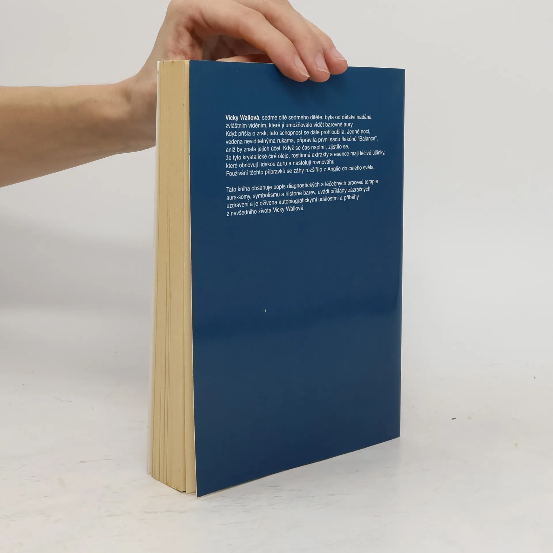 Aura-soma jako zrcadlo duše. Kniha autorky, která přišla o zrak, obsahuje popis diagnostických a léčebných procesů terapie aura-somy, symbolismu a historie barev, příklady uzdravení díky rostlinným extraktům autorky, které obnovují lidskou auru, a životní příběhy autorky.