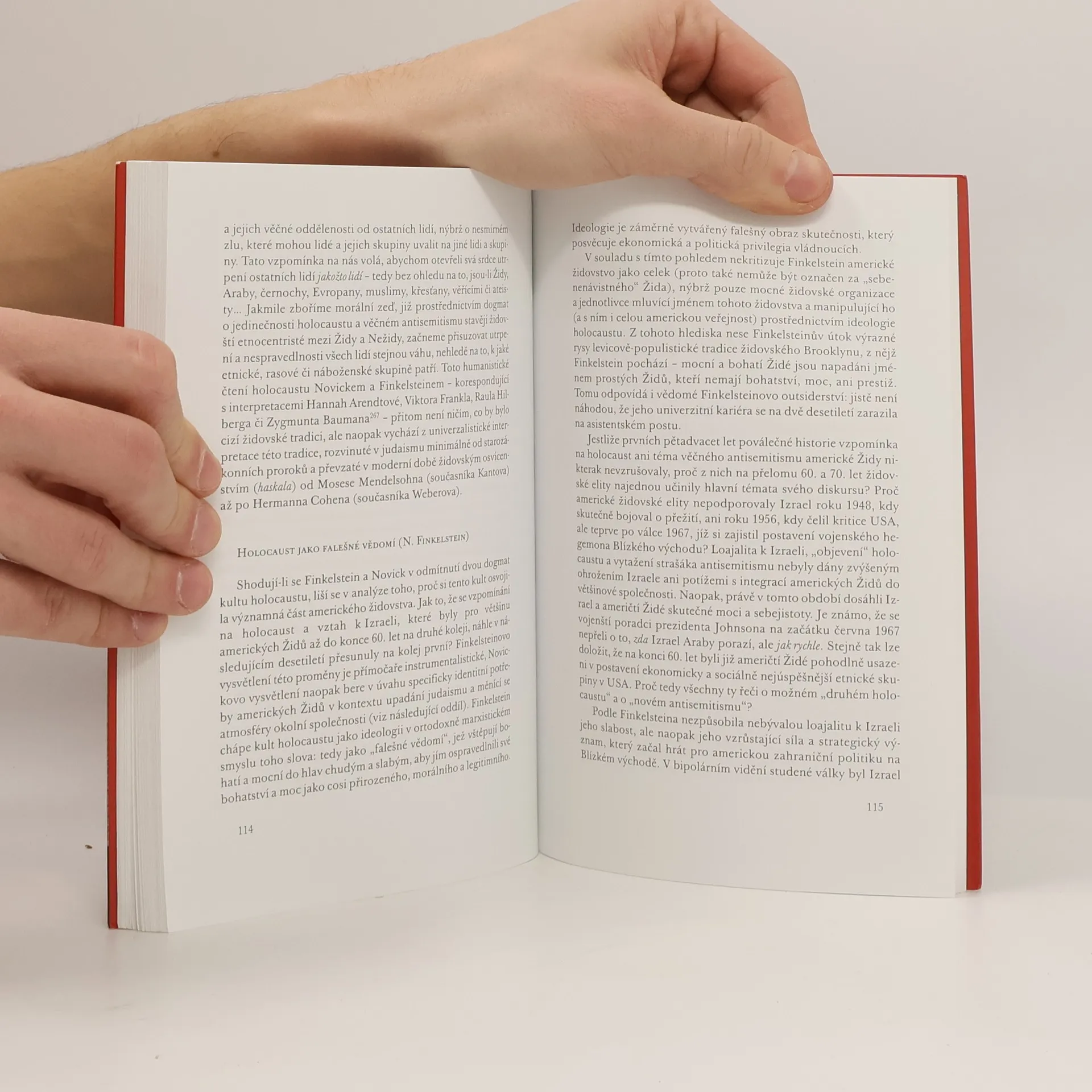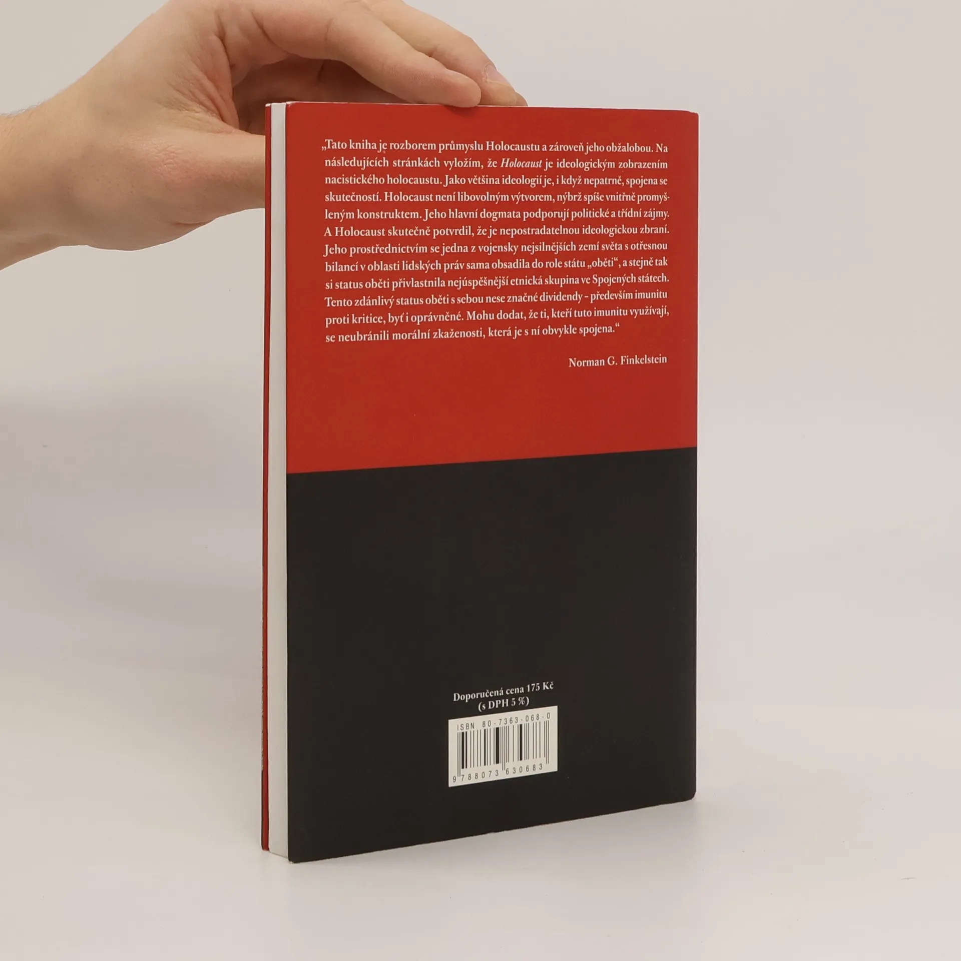 Podtitul: Úvahy o zneužívání židovského utrpení Americký politolog kritizuje současný trend mocenského zneužívání utrpení židovského obyvatelstva za 2.světové války. V současnosti se holocaust stal nepostradatelnou ideologickou zbraní pro určité izraelské a židovské kruhy. Podle autora se tezí o historické výjimečnosti holocaustu Izrael, jedna z vojensky nejsilnějších zemí světa s otřesnou bilancí v oblasti lidských práv, obsadil do role permanentní oběti a stejný status si přivlastnila i nejúspěšnější etnická skupina ve Spojených státech. Hlavní motivy k oživování této historické události Finkelstein odhaluje dva. Na straně jedné si židovské organizace díky umělému udržování problematiky holocaustu neustále nárokují od určitých států finanční odškodnění. Druhým motivem je ospravedlňování zahraniční politiky Izraele, který se díky historické genocidě snaží na věčné časy stylizovat do role "státu-oběti"...