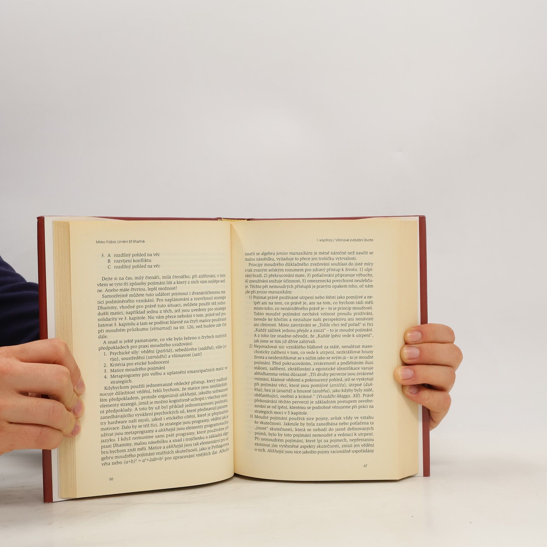 Kniha předkládá čtenáři řadu strategií a svépomocných metod, jejichž cílem je umění zvládat život. Šťastný život není ani tak záležitostí „vlastnictví štěstí“ jako spíše schopností žít šťastně. Štěstí znamená dovednost, které se můžeme naučit. Tato kniha těmto dovednostem všímavého, šťastného a moudrého života učí, je praktickým návodem pro čtenáře, který si může sám na sobě tyto postupy vlastní zkušeností ověřit a přesvědčit se o smysluplnosti a praktické využitelnosti této metody. Toto „umění žít šťastně“ využívá starodávného psychologického vědění Abhidhammy (abhi – vysoké, dhamma – učení), která je základem Buddhovy metody tréninku mysli a léčení a která je nyní opět objevována moderní psychologií, resp. psychoterapií.Vědecký rámec této knihy je slučitelný s přístupy a teoriemi psychologů a psychoterapeutů, jako jsou C. R. Rogers, G. Bateson, E. Fromm, E. Gendlin, J. L. Moreno či C. Naranjo.