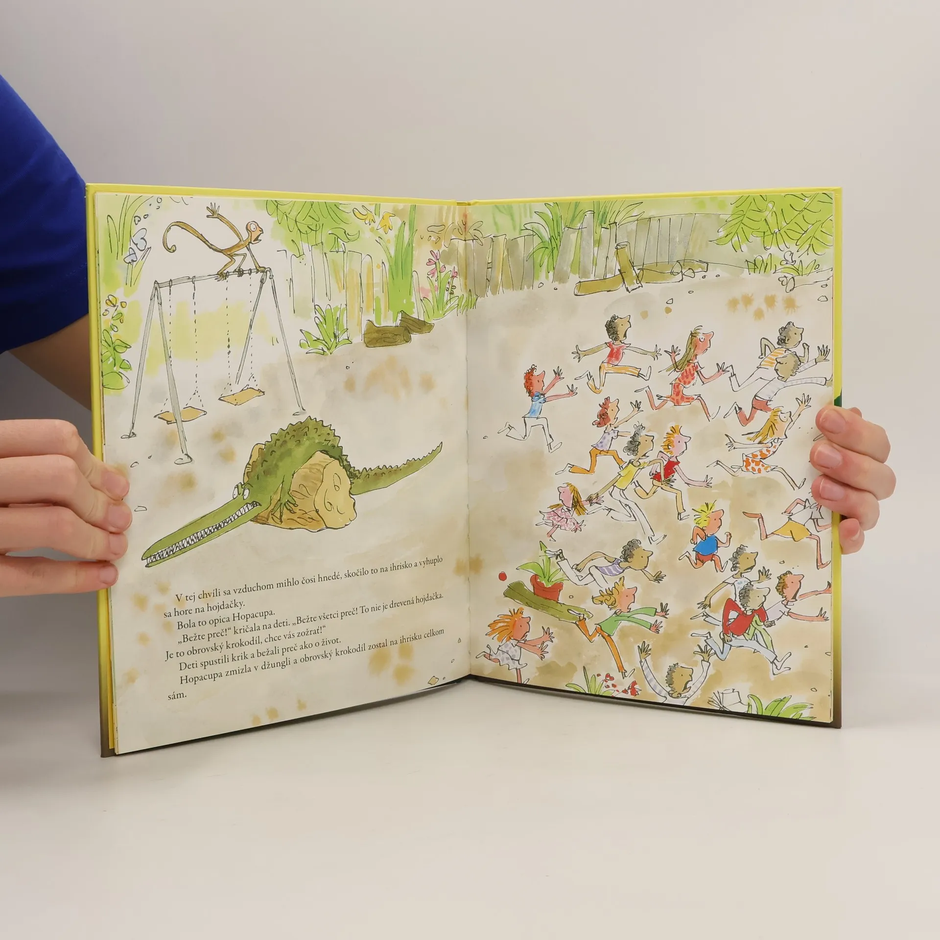Krásne ilustrovaný príbeh o krokodílovi. Obrovský krokodíl sa vystatuje, že si dá k obedu jedno z detí a vymýšľa triky, ako by ich oklamal. Prestrojí sa za palmu, keď mu to nevyjde, tvári sa, že je hojdačka... No jeho zákernosti a prestrojenia odhalia zvieratá z džungle - hlavne slon Bimbalón.