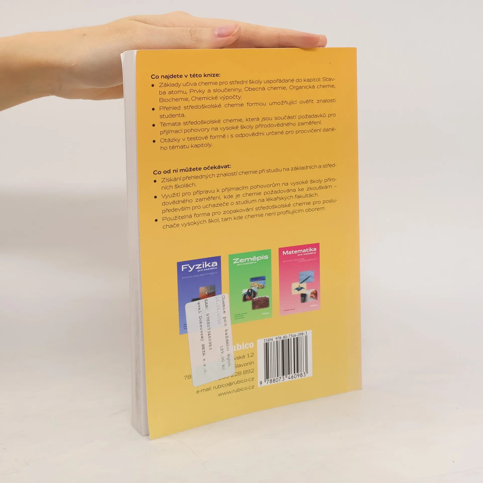 Tato kniha je upravená a rozšířená verze publikace „Rychlokurz chemie“, která vyšla v nakladatelství Rubico v roce 2000. Kniha obsahuje šest kapitol, které zahrnují stručný přehled učiva chemie vyučované na základní a střední škole. Témata jsou koncipována podle osnov středoškolské chemie, vyučované na gymnáziích. Některé části kapitol jsou doplněny tématy, které jsou přednášeny na vysoké škole, kde chemie není hlavním oborem studia. Každá kapitola je doplněna otázkami v testové formě i s odpověďmi, které jsou určeny k procvičení daného tématu kapitoly.