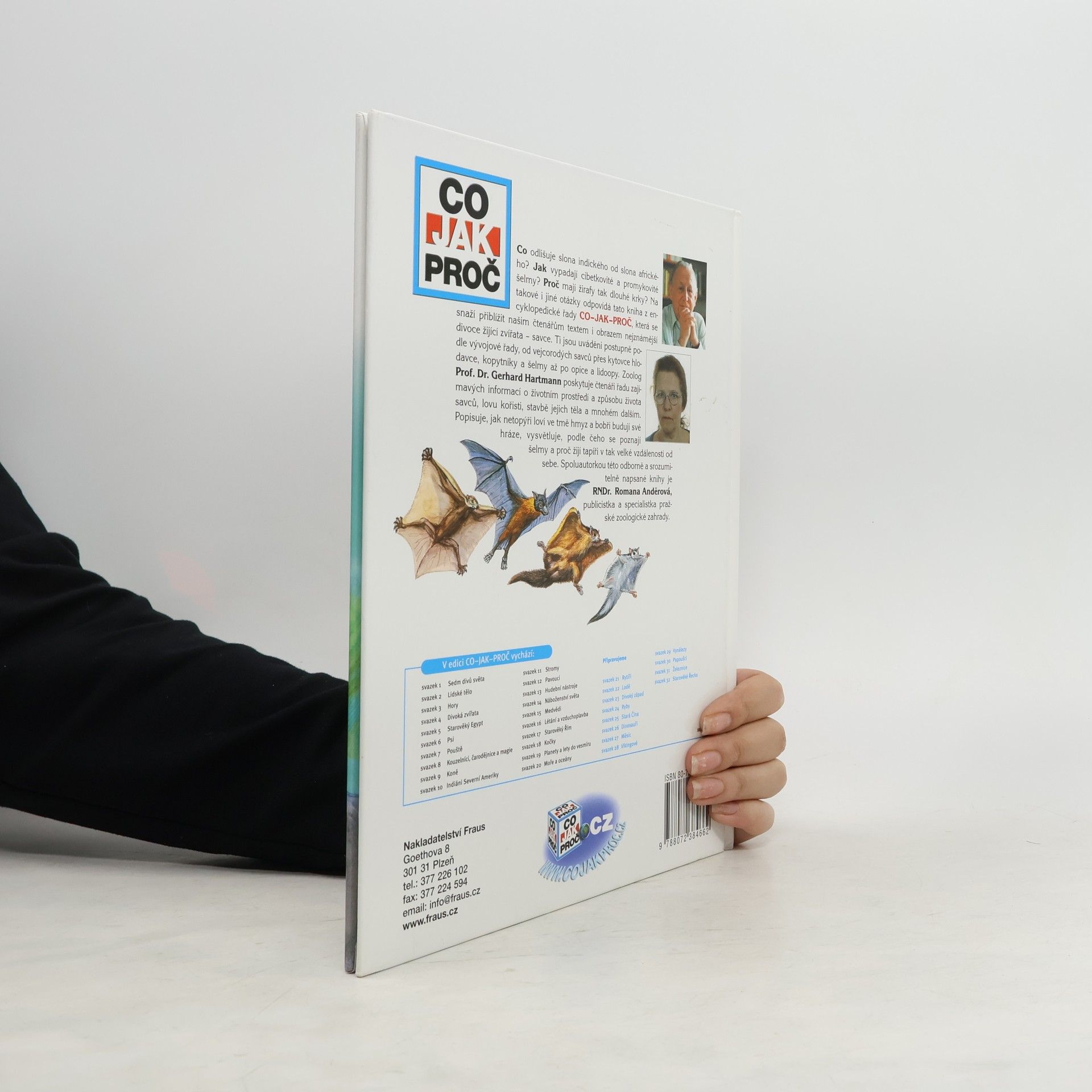Co odlišuje slona indického od slona afrického? Jak vypadají cibetkovité a promykovité šelmy? Proč mají žirafy tak dlouhé krky? Na takové i jiné otázky odpovídá tato kniha z encyklopedické řady CO-JAK-PROČ, která se snaží přiblížit našim čtenářům textem i obrazem nejznámější divoce žijící zvířata - savce. Ti jsou uváděni postupně podle vývojové řady, od vejcorodých savců přes kytovce hlodavce, kopytníky a šelmy až po opice a lidoopy. Zoolog Prof. Dr. Gerhard Hartmann poskytuje čtenáři řadu zajímavých informací o životním prostředí a způsobu života savců, lovu kořisti, stavbě jejich těla a mnohém dalším. Popisuje, jak netopýři loví ve tmě hmyz a bobři budují své hráze, vysvětluje, podle čeho se poznají šelmy a proč žijí tapíři v tak velké vzdálenosti od sebe. Spoluautorkou této odborně a srozumitelně napsané knihy je RNDr. Romana Anděrová, publicistka a specialistka pražské zoologické zahrady.